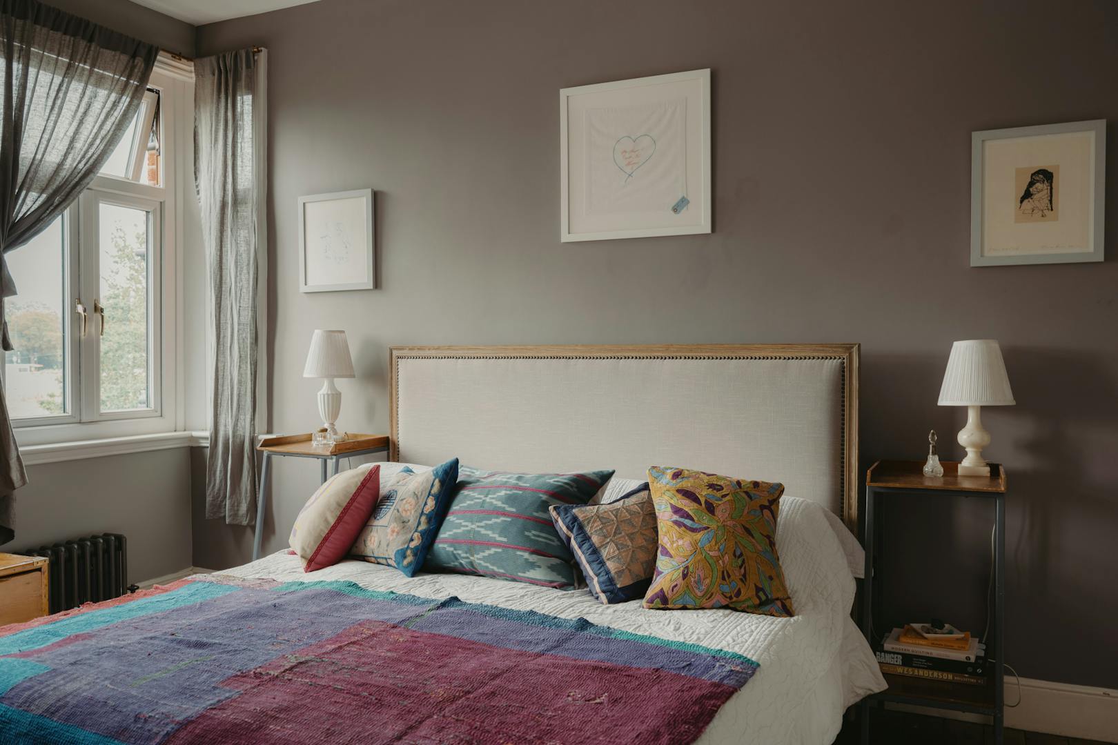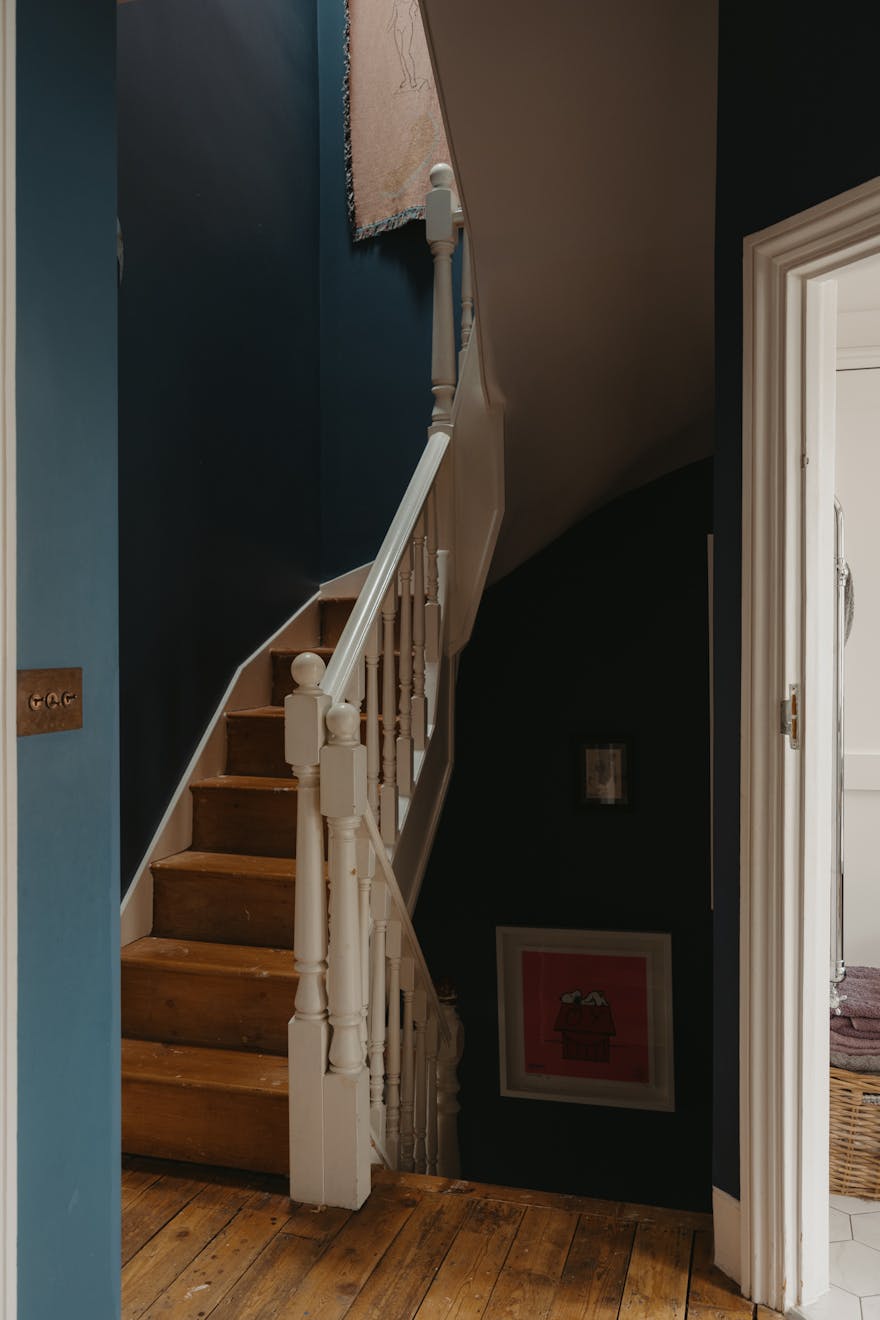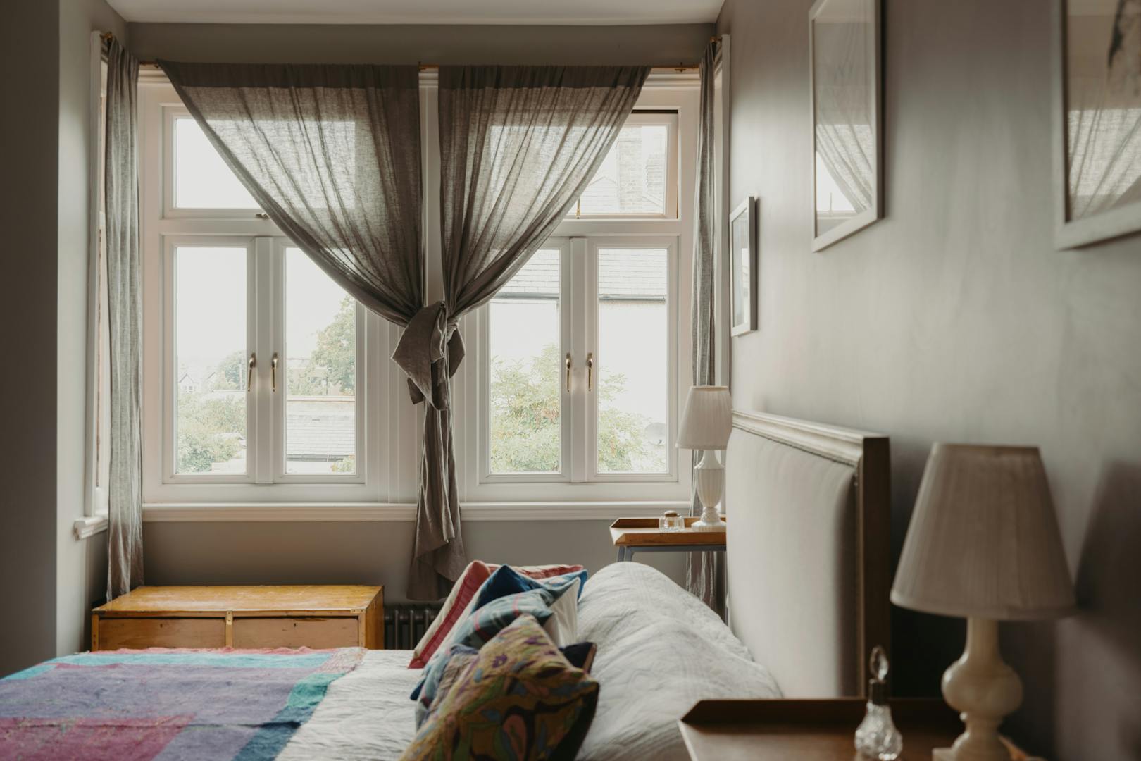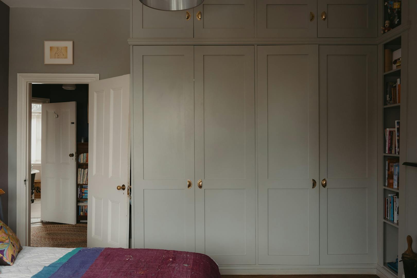 The first floor comprises three double bedrooms, each featuring double glazing and period touches such as cast-iron fireplaces, stripped wood flooring, and ornate cornicing. The principal bedroom features a box bay window and custom-built wardrobes, cupboards, shelves, and drawers.