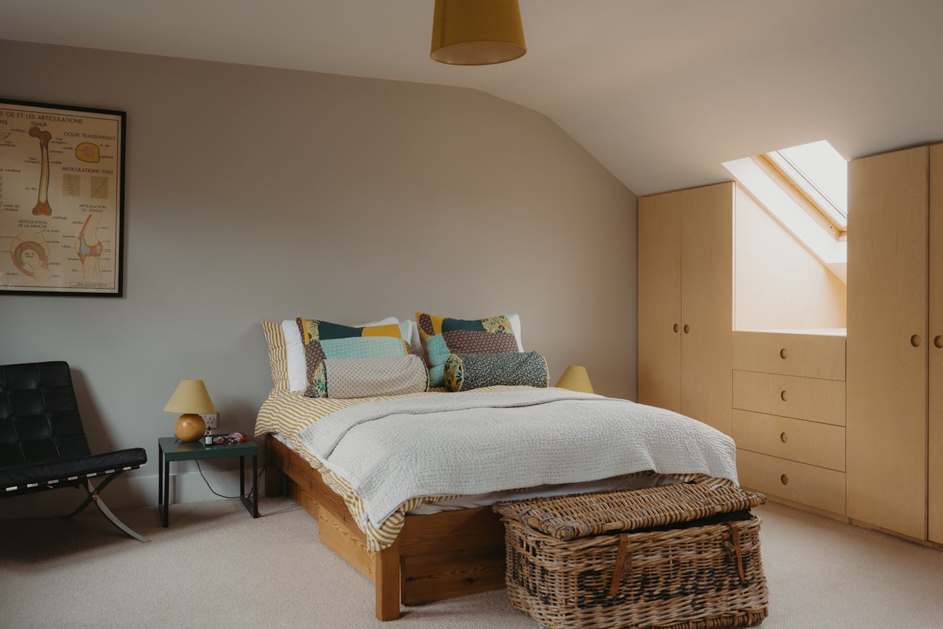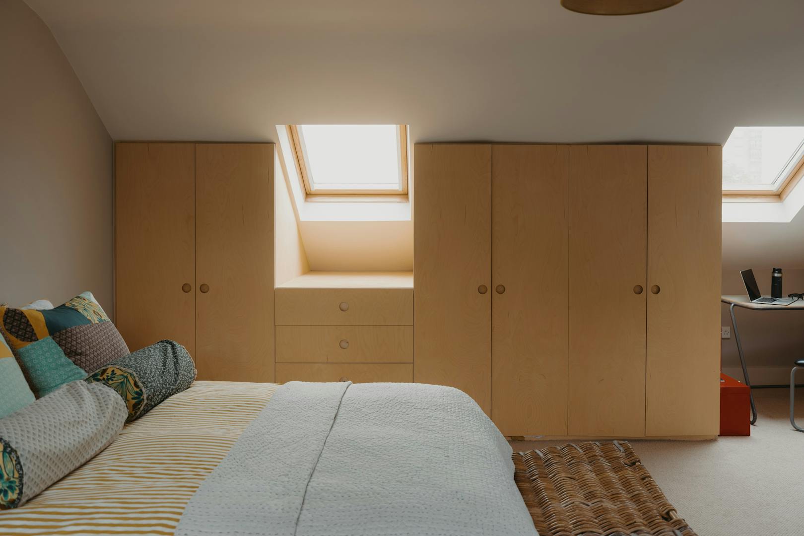 On the upper floor, a well-designed bedroom suite maximises the available space and storage. Two large skylights flood the room with natural light, and an en-suite shower room makes this an ideal principal or guest bedroom.