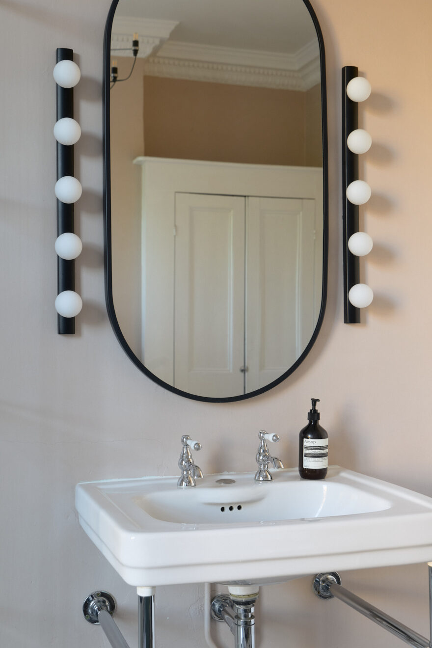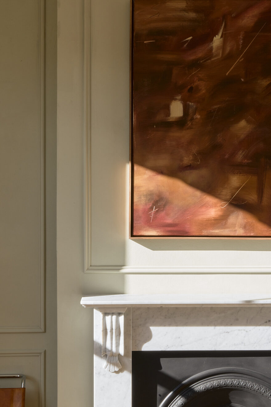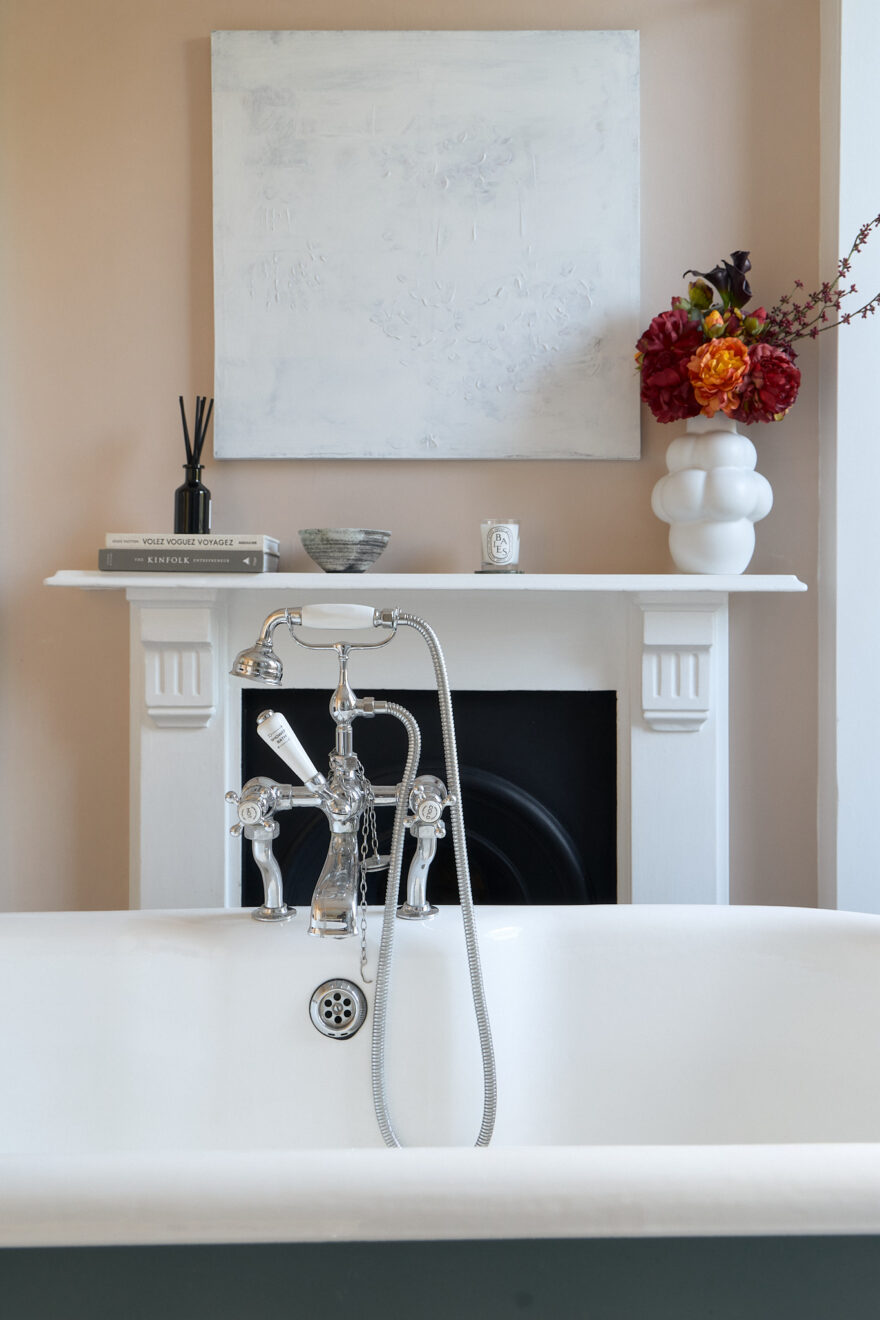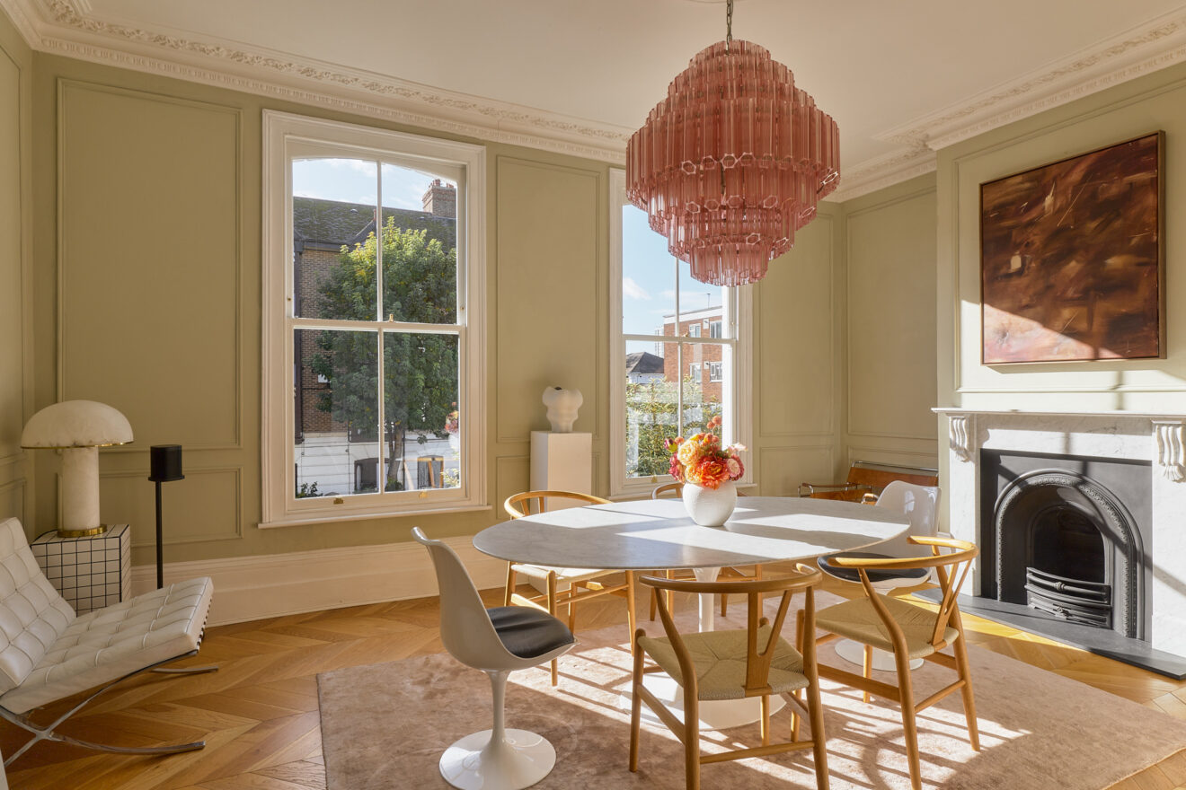 At the front of the home, the elegant first-floor dining room features soft mossy green panelled walls and a pink glass chandelier above the original marble fireplace, opposite two generous sash windows. The adjacent family bathroom has checked marble underfoot and has retained two original wardrobes and radiators, alongside a roll-top bath, walk-in shower, and freestanding basin.