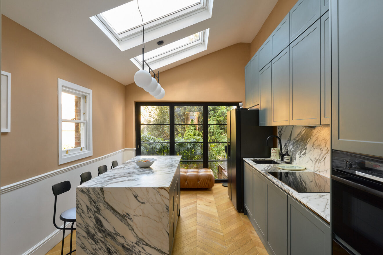 Entry is via traditional black-and-white Victorian mosaic tiling into a well-kept hallway. A cream runner leads up the original staircase to the open-plan kitchen at the rear, illuminated by three large remote-controlled skylights. The raised kitchen opening and vaulted ceiling enhances the sense of space, while an Arabescato marble island and worktops showcase the home’s refined finishes. Soft stone walls complement forest green cabinetry which houses integrated appliances. Bi-fold Crittall-style doors open onto a balcony wrapped in mature wisteria. Black steel stairs lead down to a private garden lush with established planting including an abundant bay tree, olive, pear and banana trees, a beautiful flowering magnolia, and fragrant jasmine.