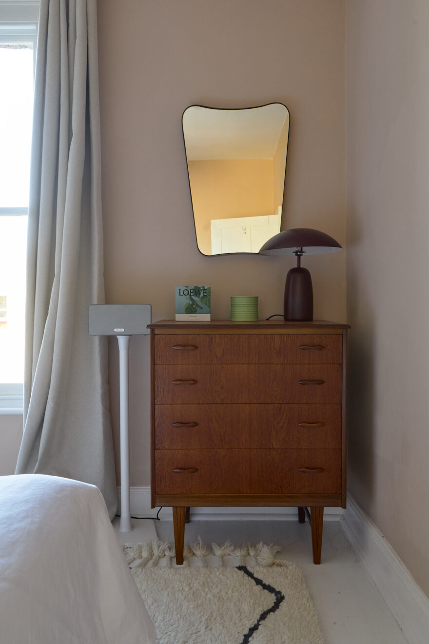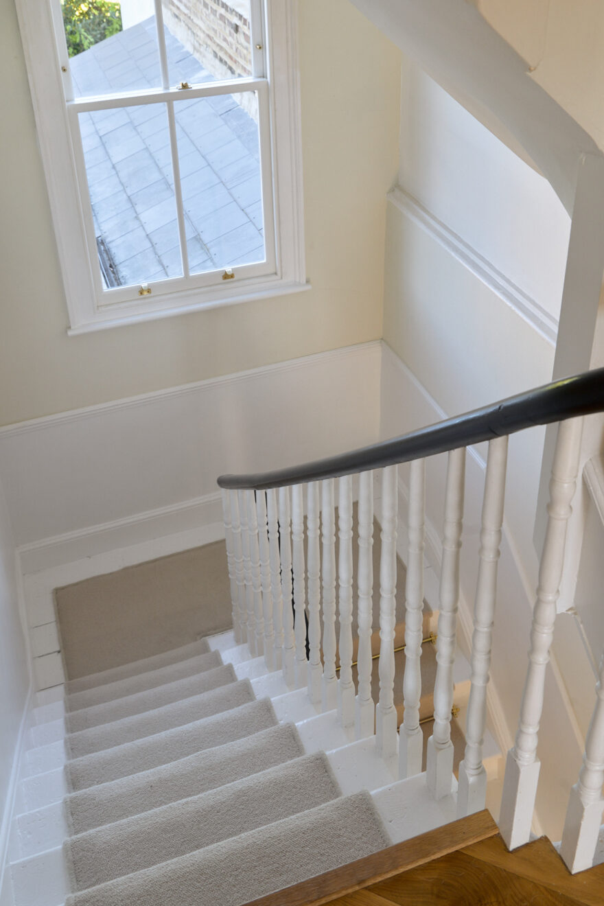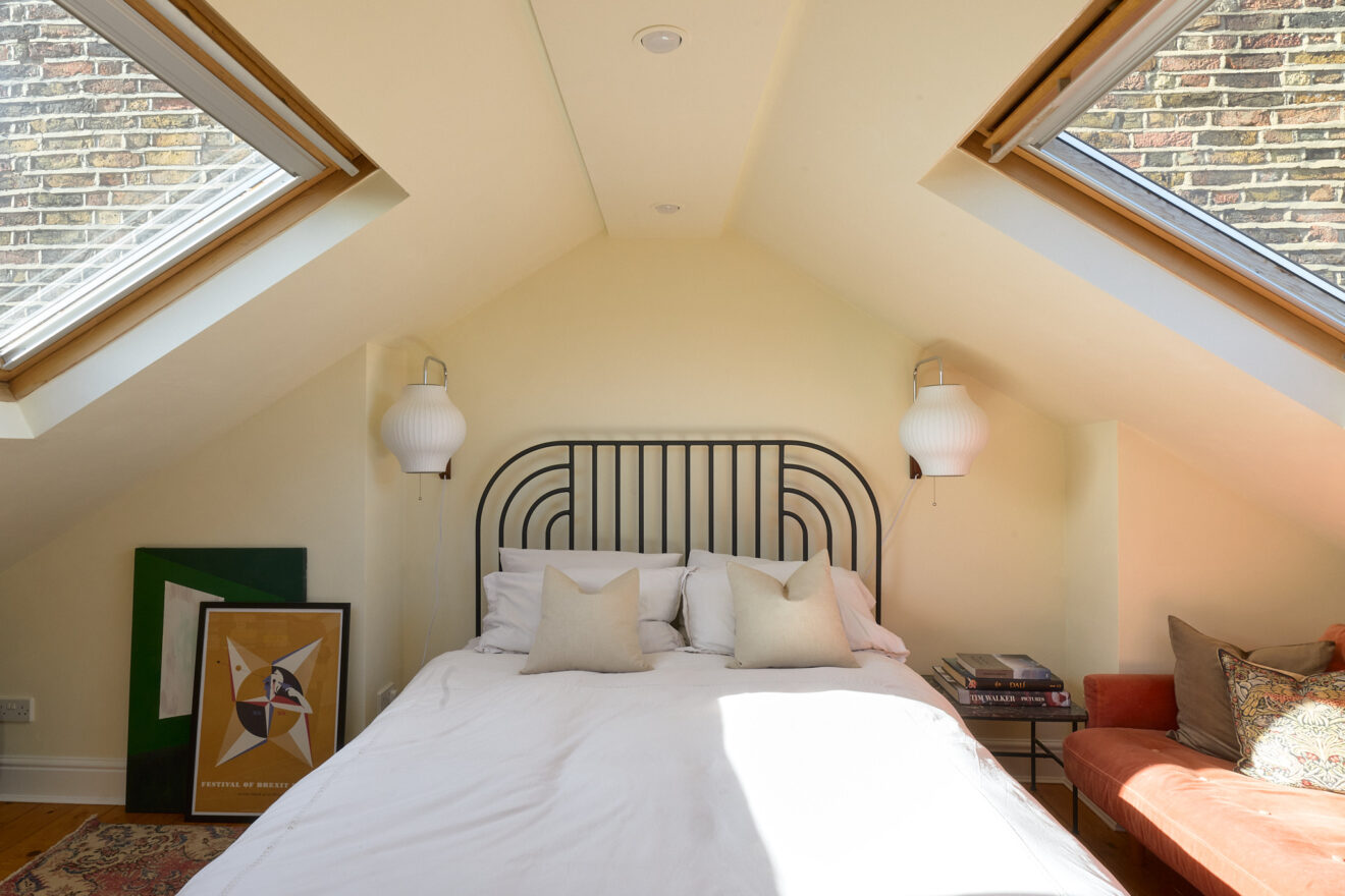 The second floor offers a spacious living room in soft neutral tones with a sculptural Serge Mouille-style ceiling light, and a serene principal bedroom overlooking the garden with built-in wardrobes. On the top floor, skylights fill the staircase and bedroom with light, complemented by abundant storage.