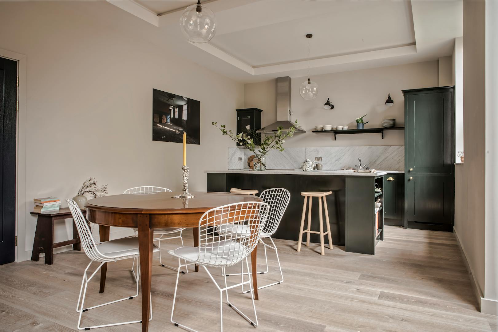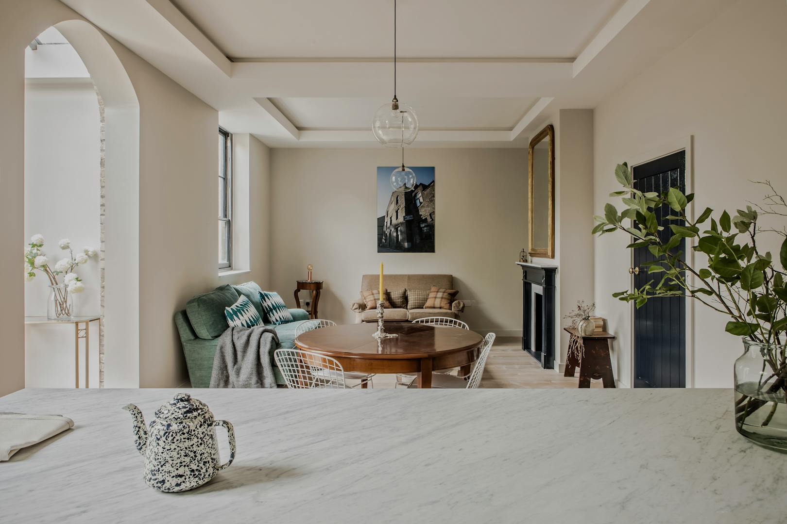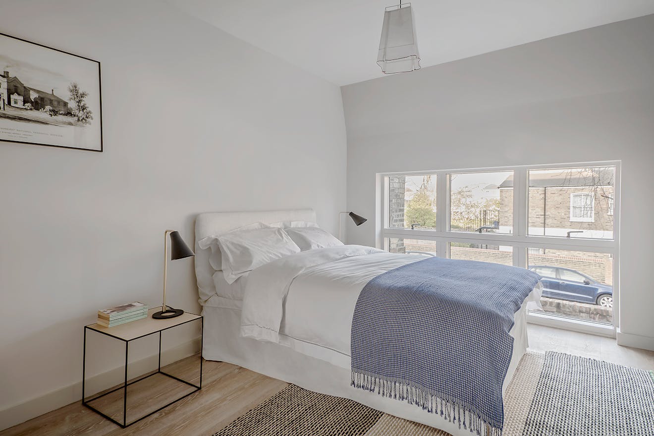 The largest house of the collection, The Grange is set over three stories and has a magnificent ground-floor living space with soaring ceiling heights that feels like a welcoming sanctuary. The hand-built British Standard Kitchen by Plain English is handmade in their Suffolk workshop and painted on site with Little Greene’s ‘Obsidian Green’. The kitchen also features a 30mm thick Carrera marble worktop with oversized splash back. On the first floor are two double bedrooms a family bathroom and WC. The largest bedroom is on the top (third) floor and has an en suite bathroom and mezzanine level. Also at this level is the fourth double bedroom and a utilities area. At ground level you’ll also find a utility room provisioned with a purpose-made stainless-steel catering table and sink. The garden area provides the perfect place for a bbq and there is secure, gated access out on to the street beyond with a video entry-phone system. This property has secure off-street parking.