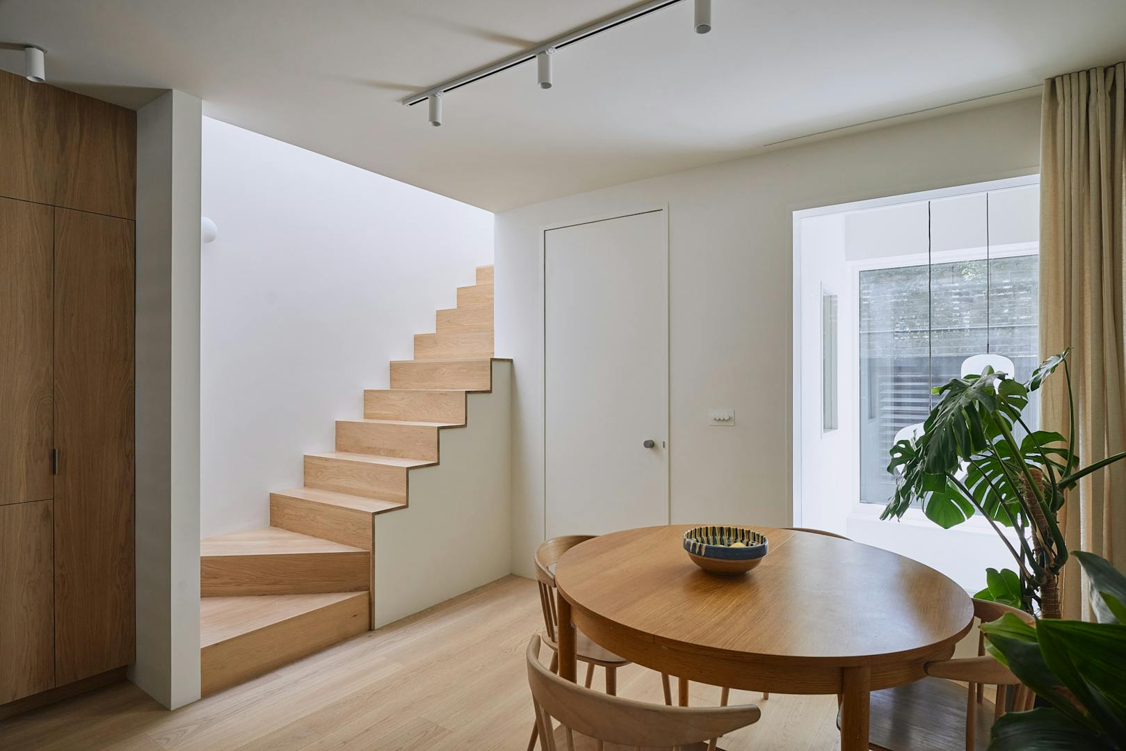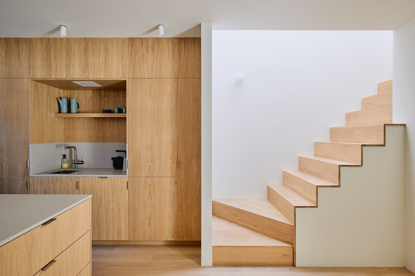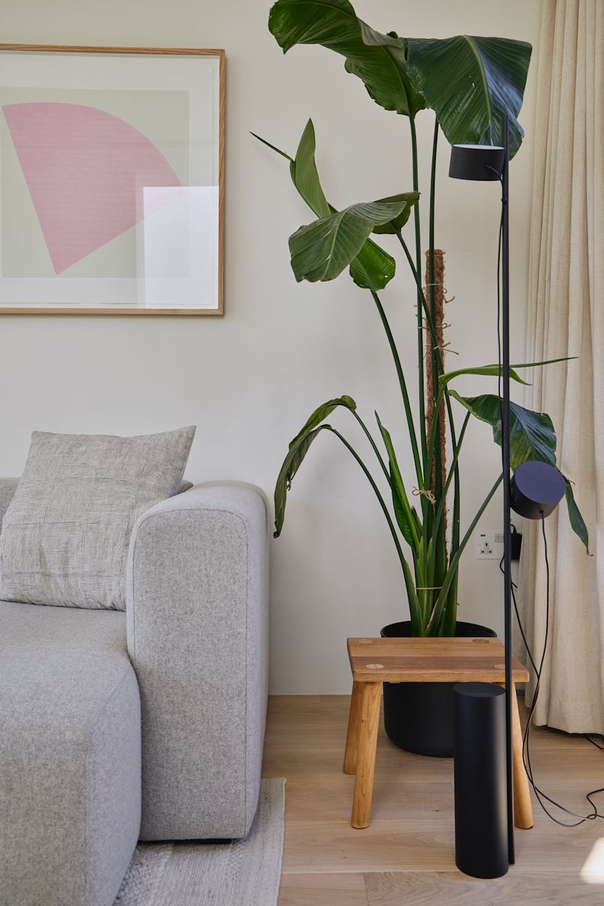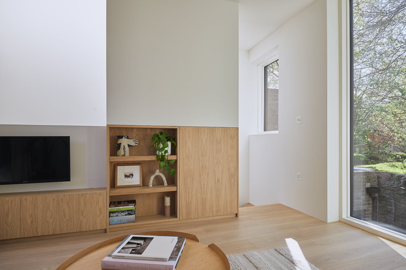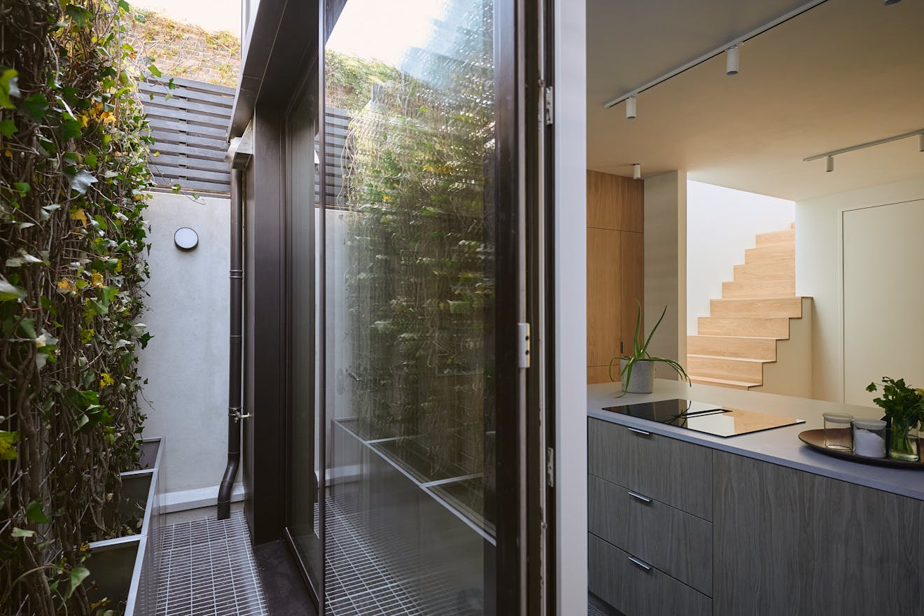 Stepping inside at ground level, you are greeted by a hallway with built-in storage, a dedicated space for hanging coats, and a seating nook under an internal picture window overlooking the double-height atrium. A few steps further, the kitchen-diner unfolds with dual aspects – on one side, a three-metre living green wall, and on the other, a picture window overlooking the atrium with Muuto Rime pendants.