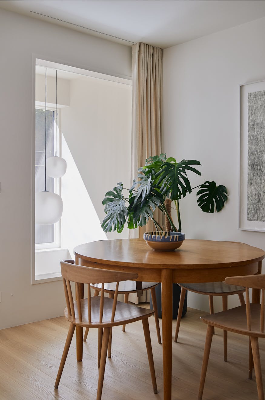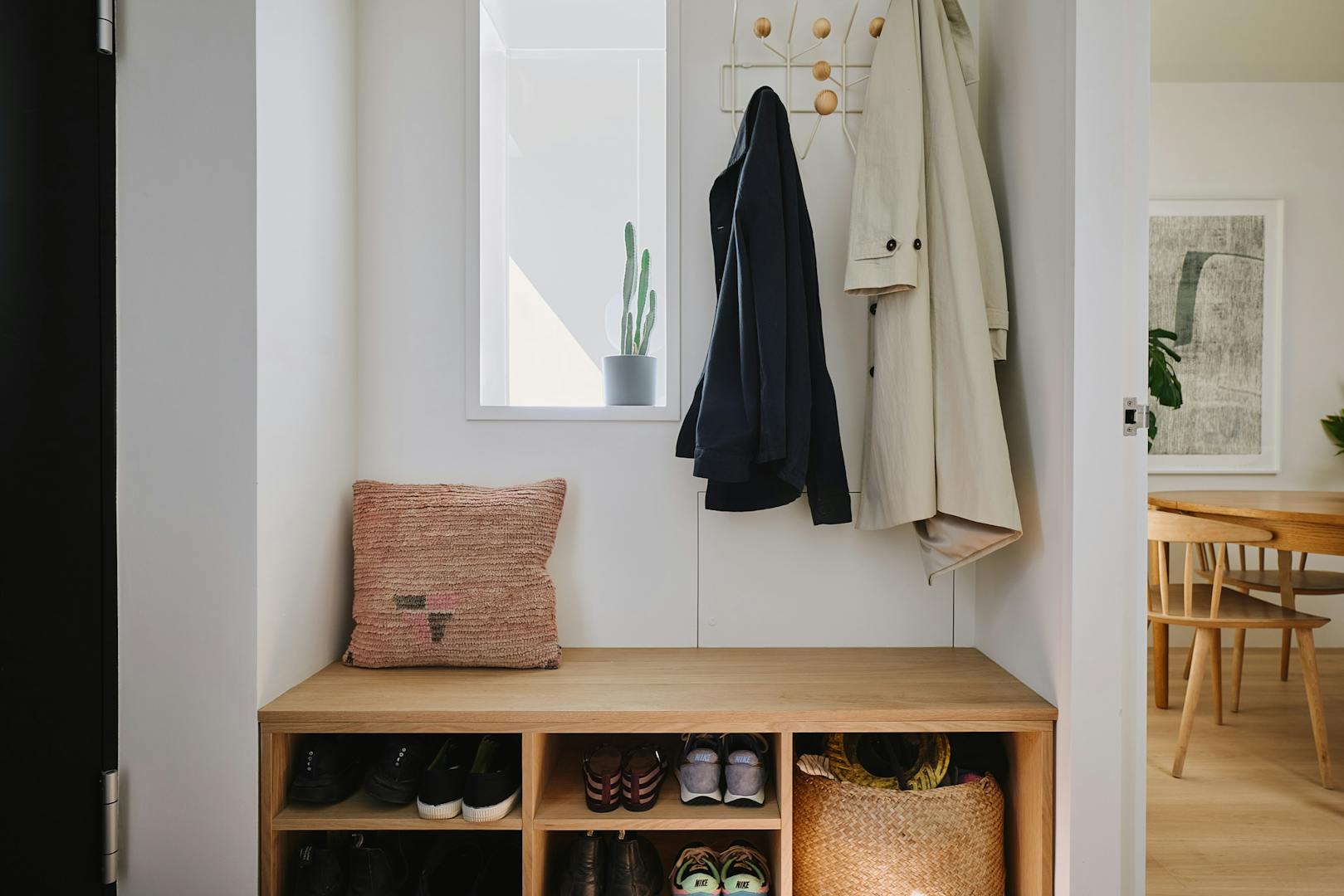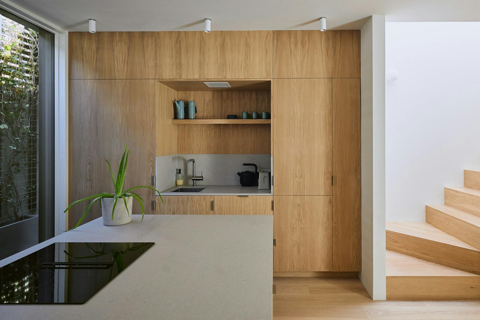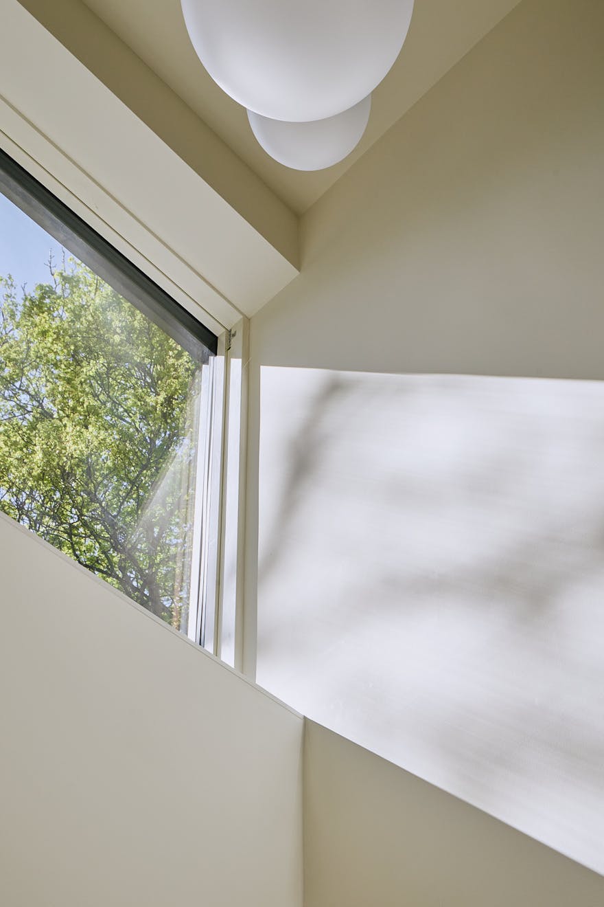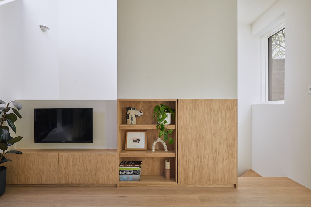Stepping inside at ground level, you are greeted by a hallway with built-in storage, a dedicated space for hanging coats, and a seating nook under an internal picture window overlooking the double-height atrium. A few steps further, the kitchen-diner unfolds with dual aspects – on one side, a three-metre living green wall, and on the other, a picture window overlooking the atrium with Muuto Rime pendants.