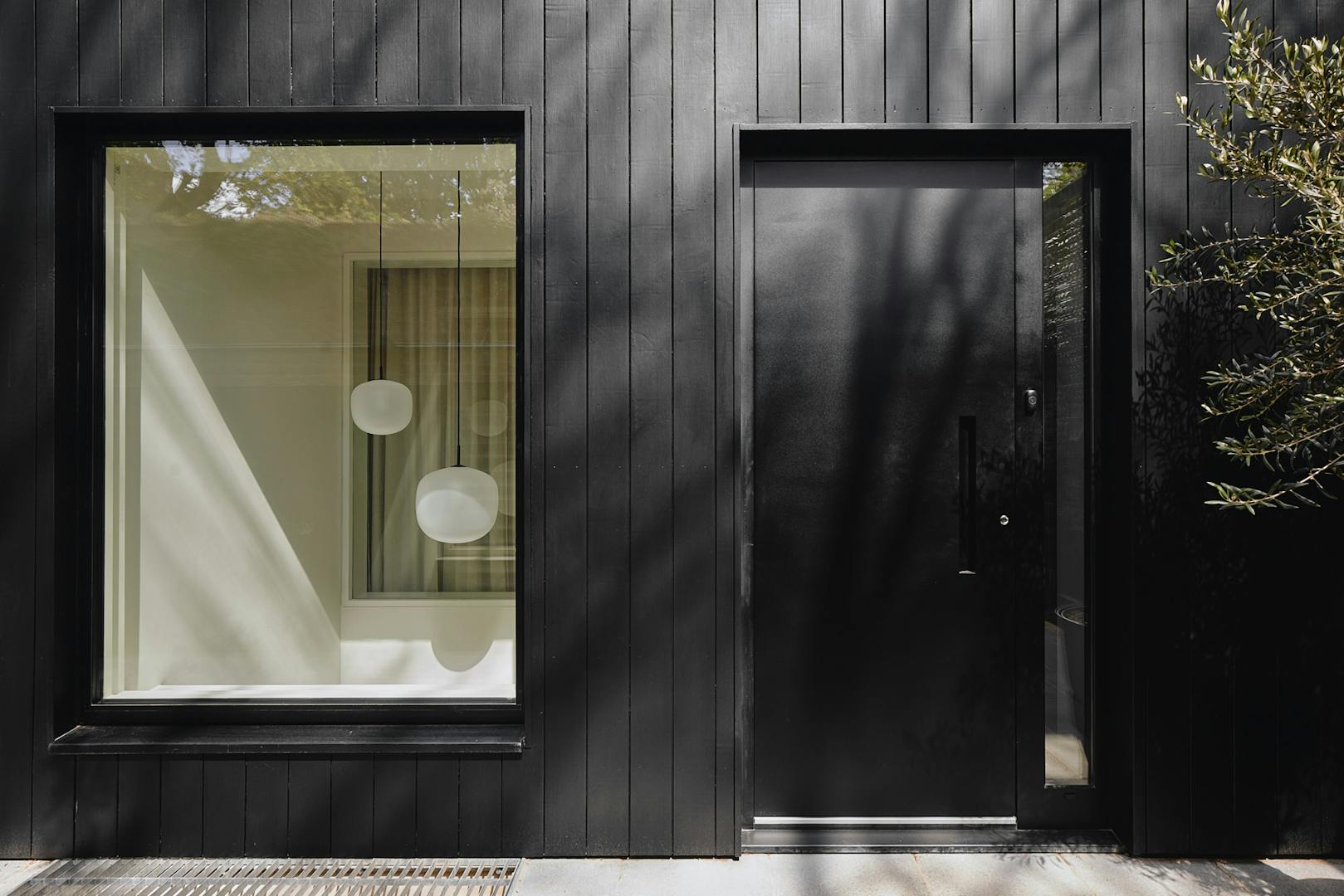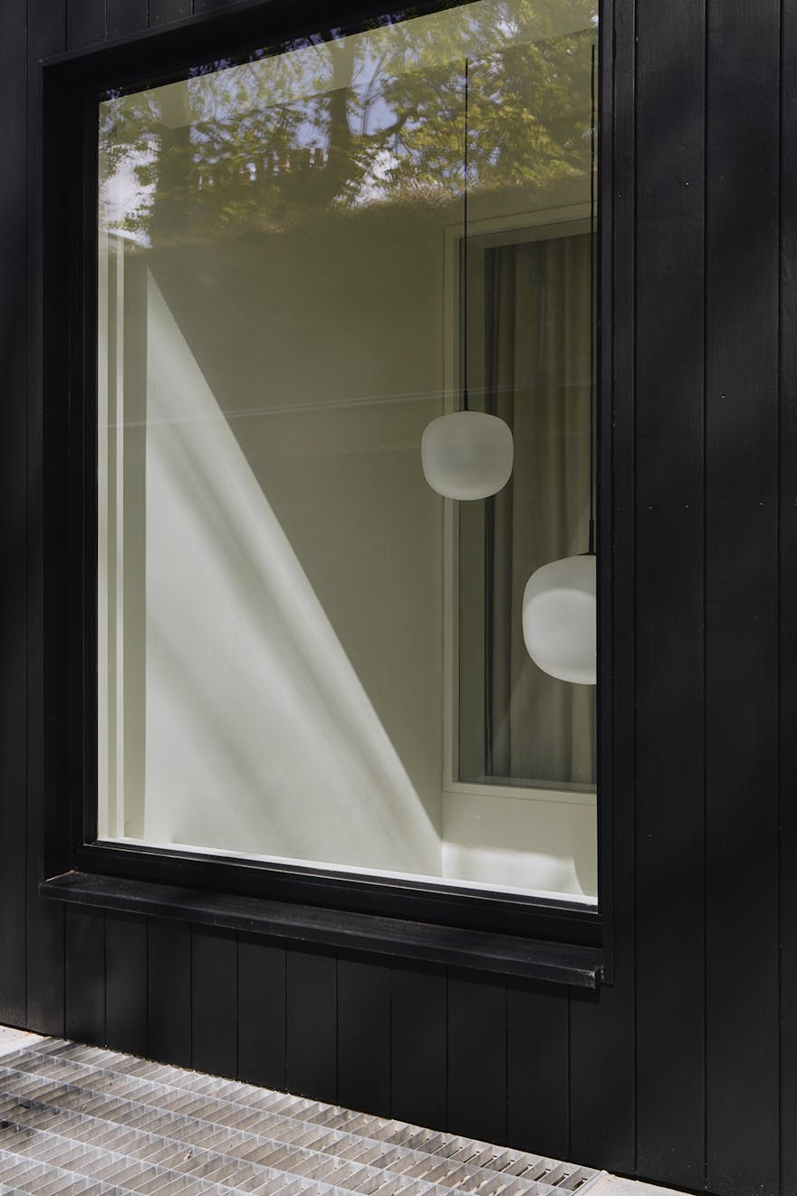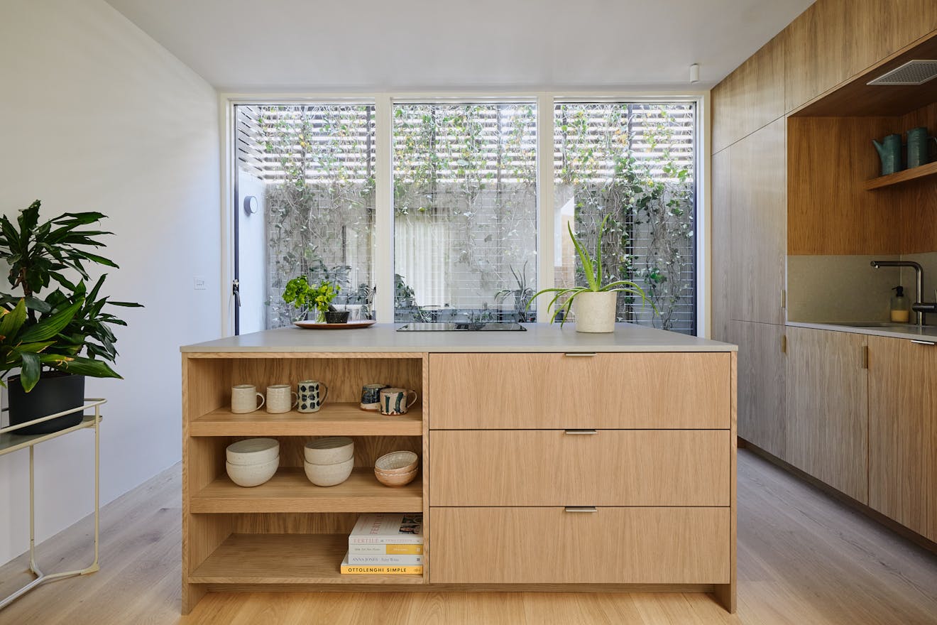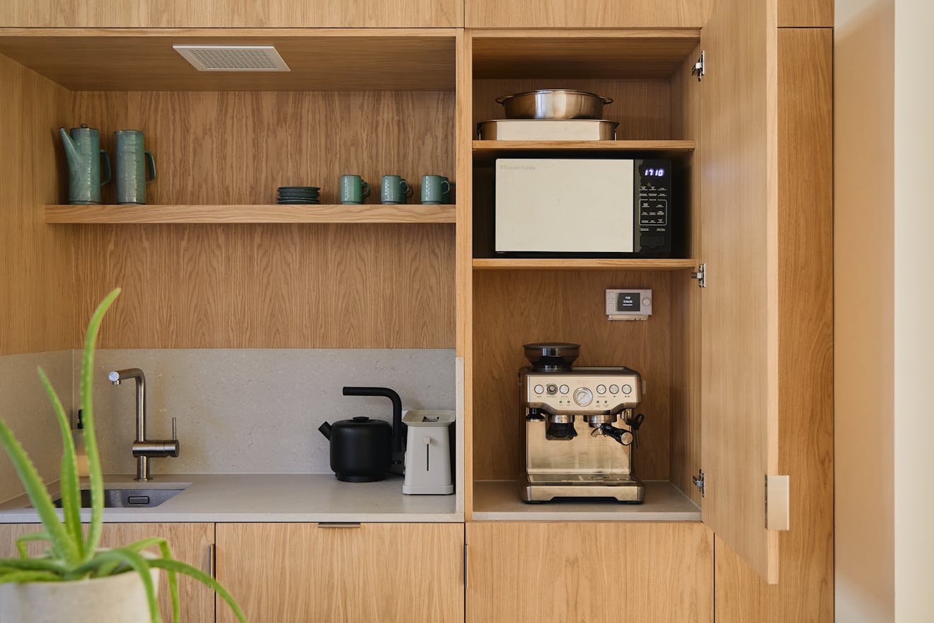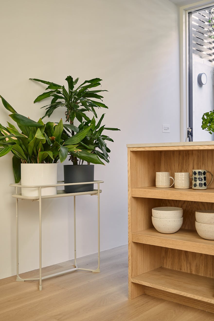 Stepping inside at ground level, you are greeted by a hallway with built-in storage, a dedicated space for hanging coats, and a seating nook under an internal picture window overlooking the double-height atrium. A few steps further, the kitchen-diner unfolds with dual aspects – on one side, a three-metre living green wall, and on the other, a picture window overlooking the atrium with Muuto Rime pendants.
