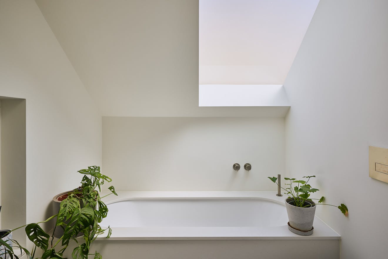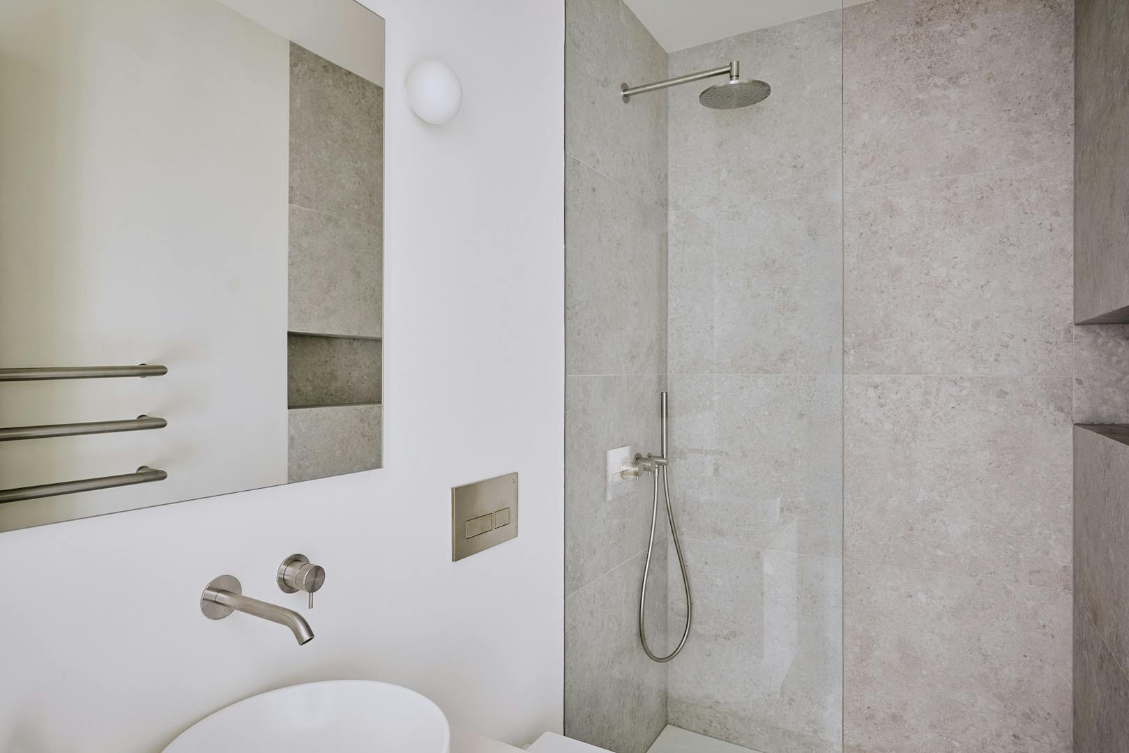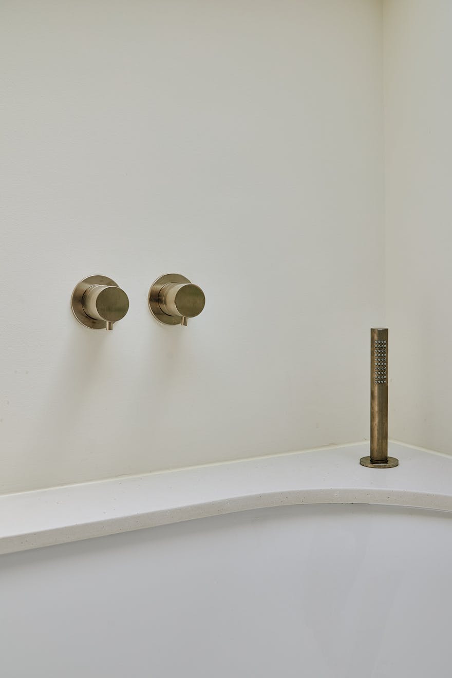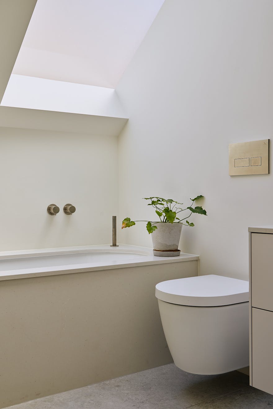 The bathroom is a calm, contemporary space, thoughtfully finished with fixtures in brushed stainless steel. Duravit ceramics from the Stark collection lend a sculptural edge, while matt white vanity units are topped with honed Caesarstone in a fresh concrete finish. Claybrook’s Neutra tiles in Whitish complete the palette, bringing subtle texture and tonal harmony throughout.