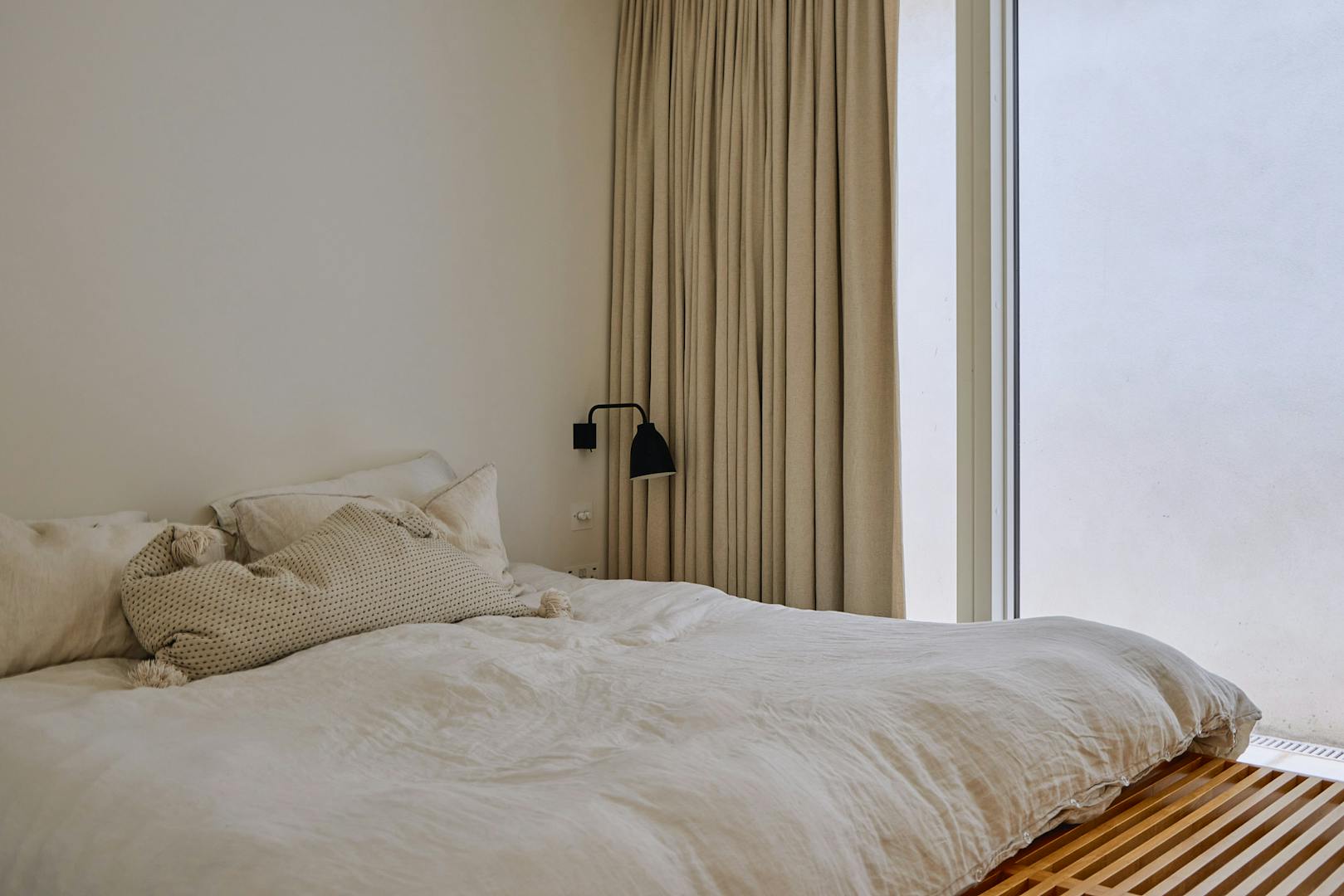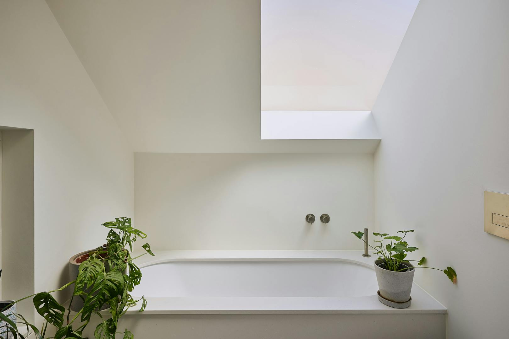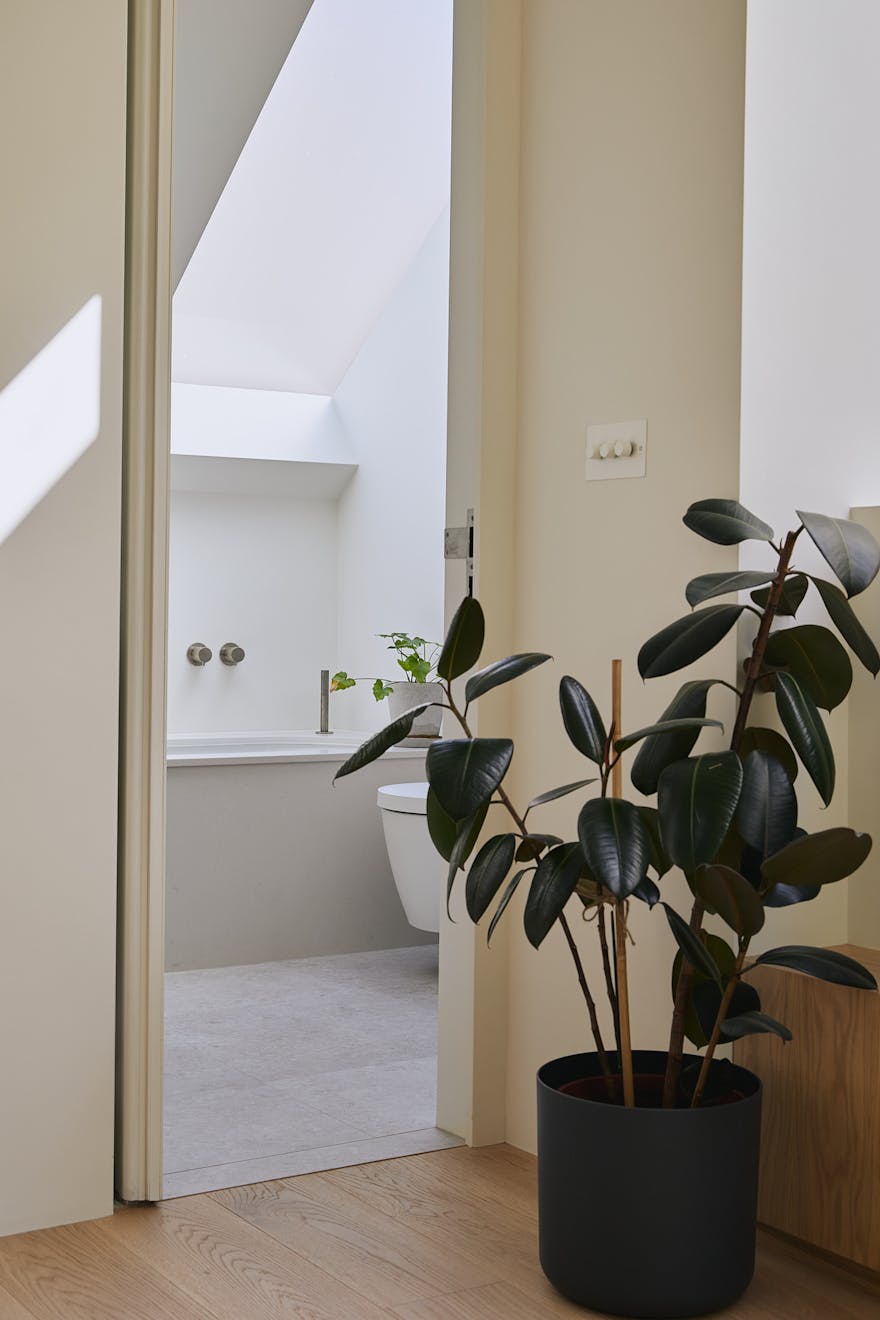 The bathroom is a calm, contemporary space, thoughtfully finished with fixtures in brushed stainless steel. Duravit ceramics from the Stark collection lend a sculptural edge, while matt white vanity units are topped with honed Caesarstone in a fresh concrete finish. Claybrook’s Neutra tiles in Whitish complete the palette, bringing subtle texture and tonal harmony throughout.