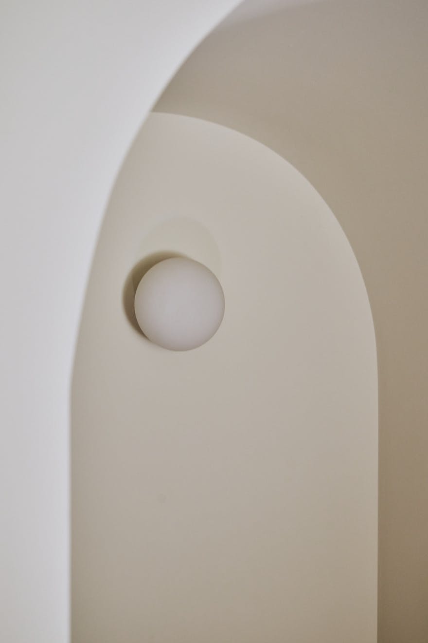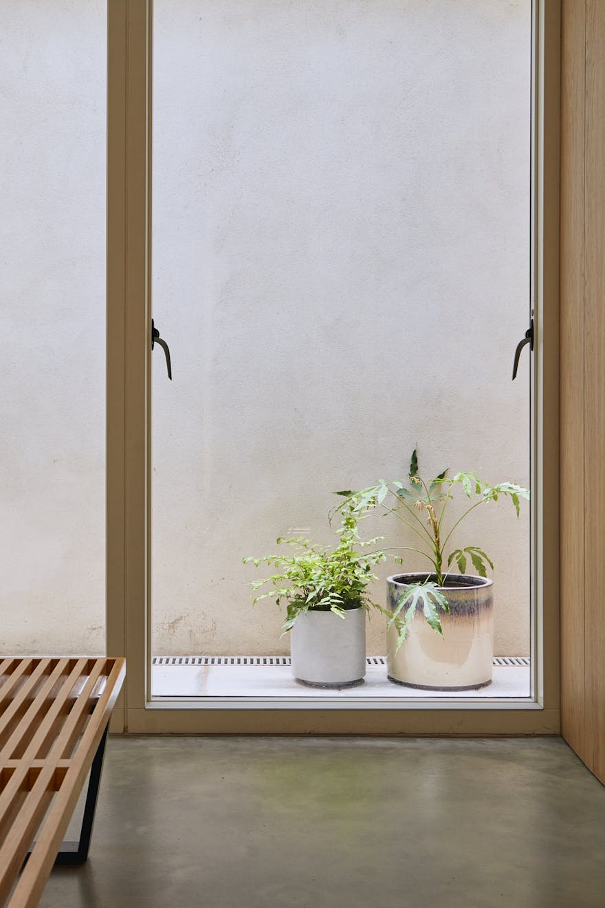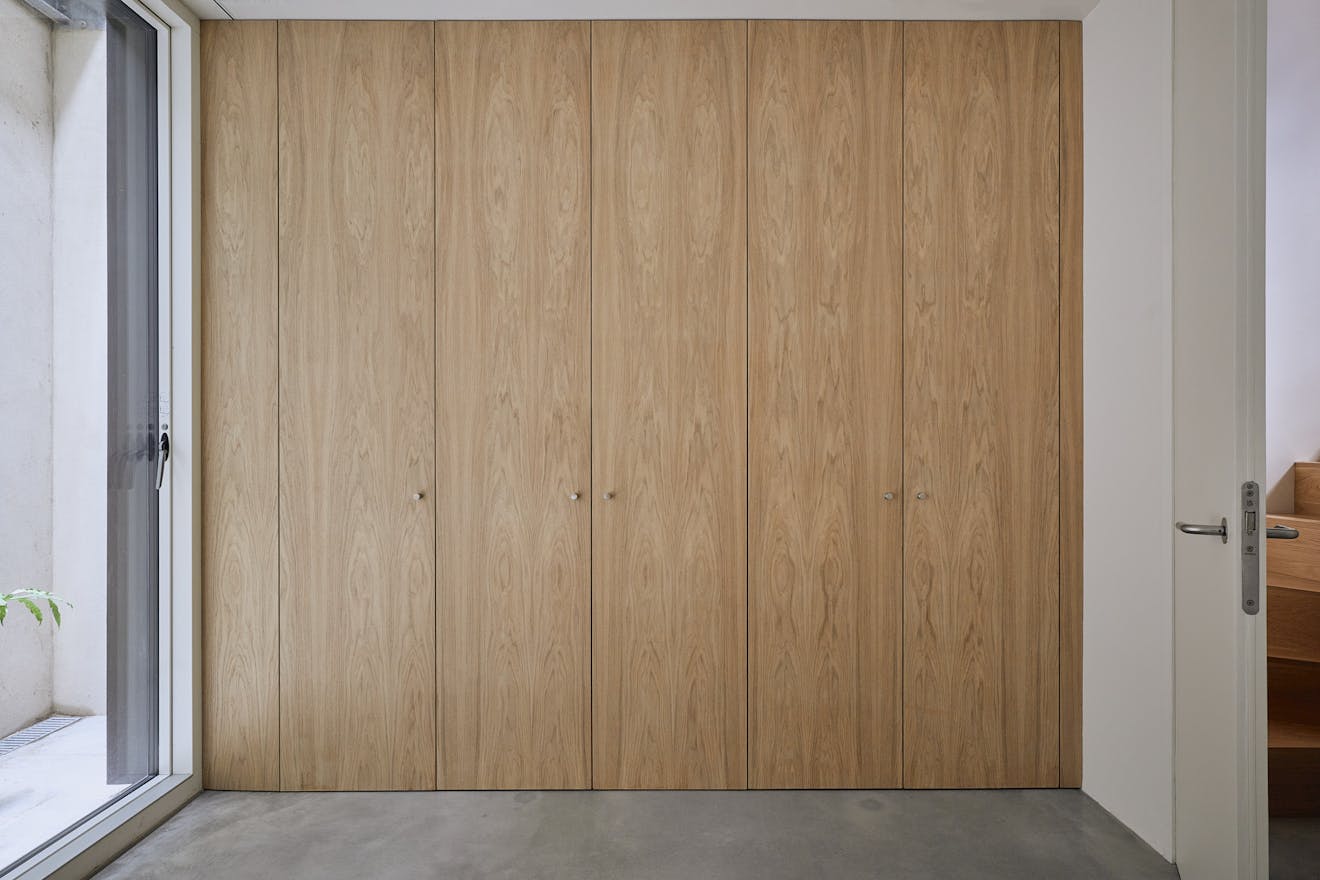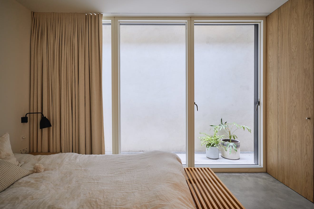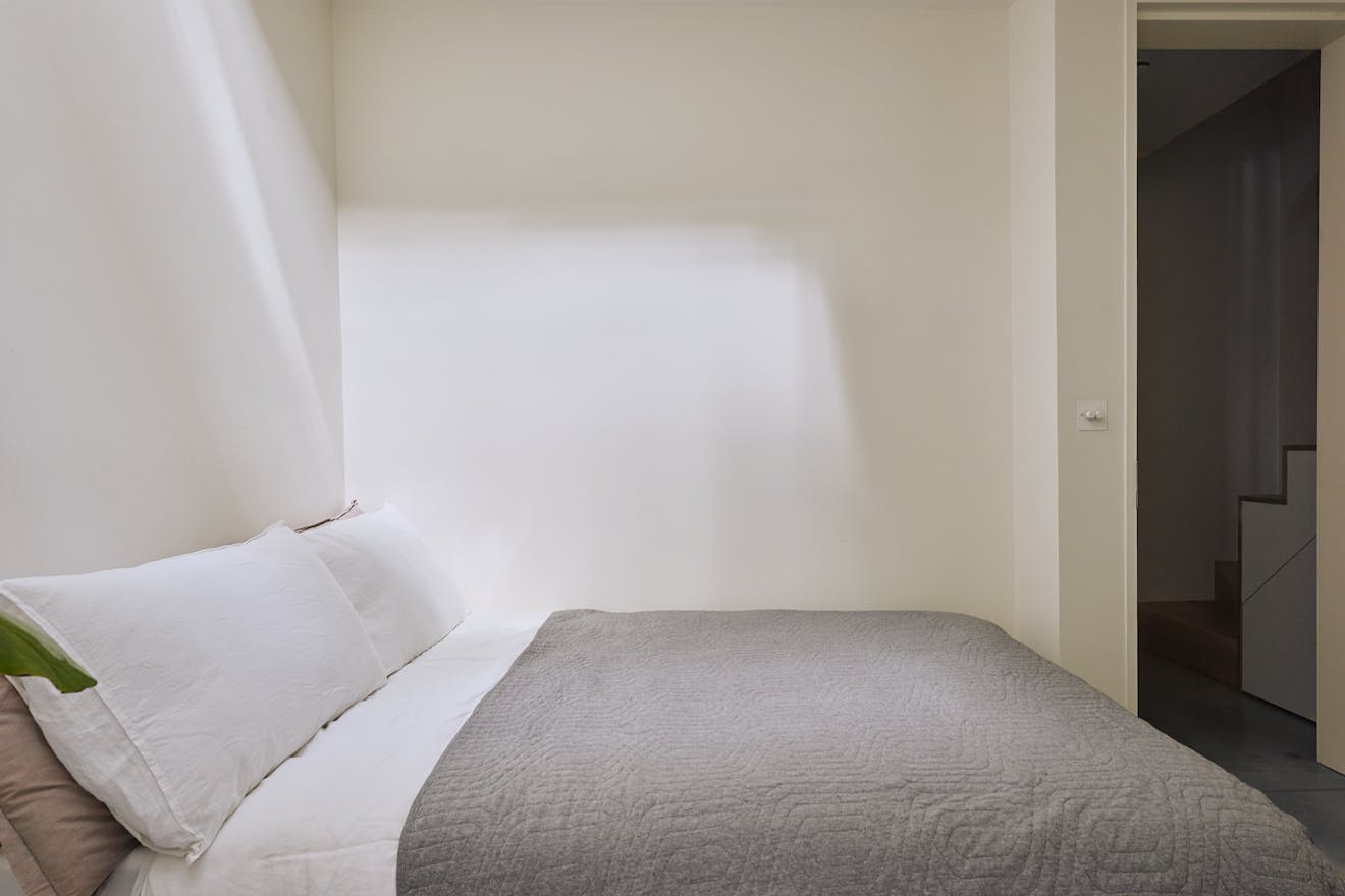 Descending to the lower floors through a softly curved arch, you’re welcomed by two bedrooms with extended ceiling heights and Lazenby polished concrete flooring. The principal bedroom is positioned at the rear, where floor-to-ceiling doors open onto a courtyard. Fritze Hansen Caravaggio wall lights and built-in oak wardrobes add warmth to the space here. The second bedroom also enjoys direct access to its own private courtyard, with natural light drawn in from the double-height atrium- a bright, calming space, equally suited to rest or focused work.
