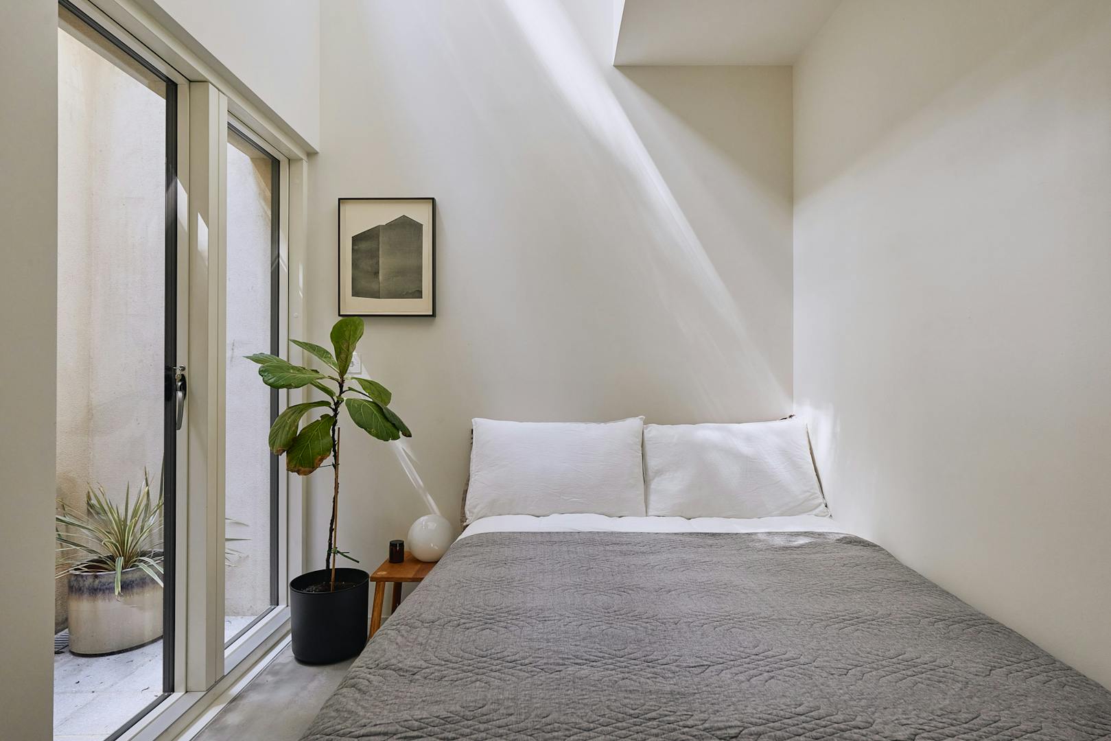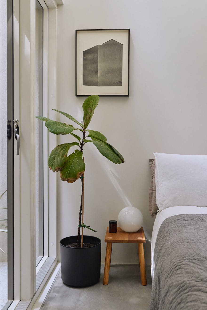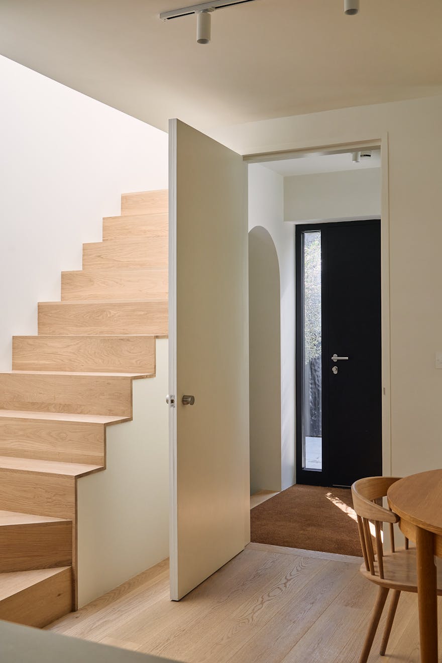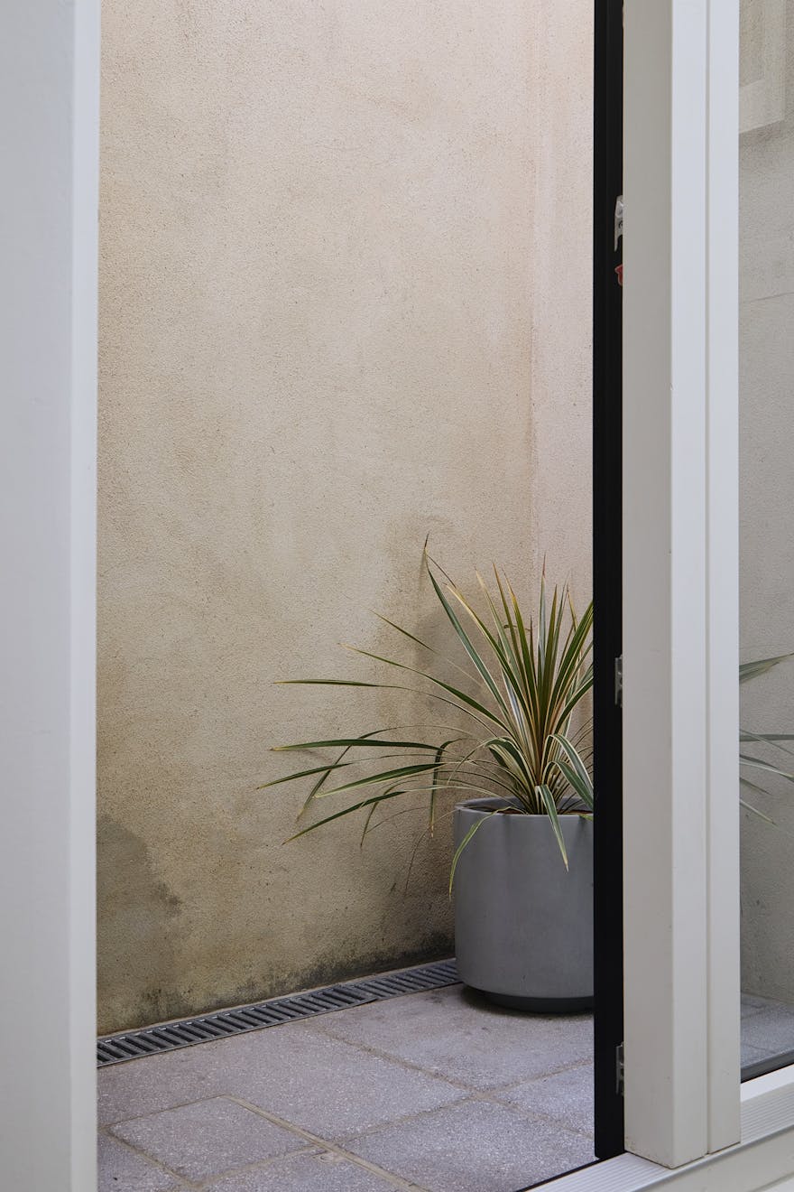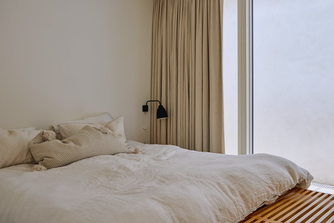 Descending to the lower floors through a softly curved arch, you’re welcomed by two bedrooms with extended ceiling heights and Lazenby polished concrete flooring. The principal bedroom is positioned at the rear, where floor-to-ceiling doors open onto a courtyard. Fritze Hansen Caravaggio wall lights and built-in oak wardrobes add warmth to the space here. The second bedroom also enjoys direct access to its own private courtyard, with natural light drawn in from the double-height atrium- a bright, calming space, equally suited to rest or focused work.