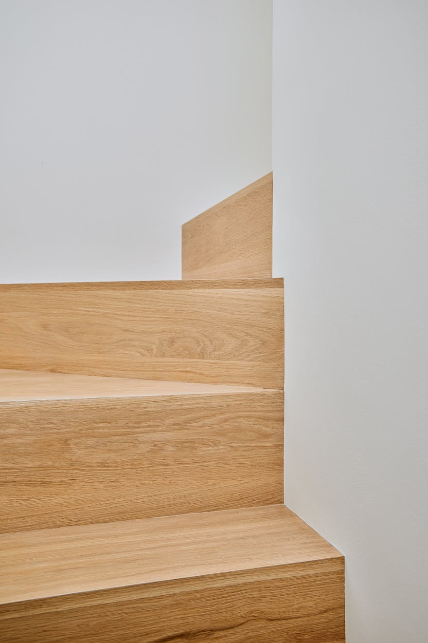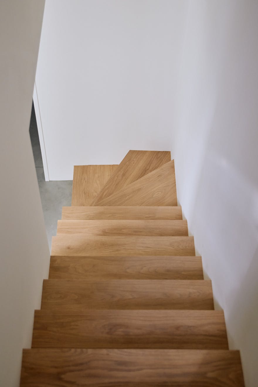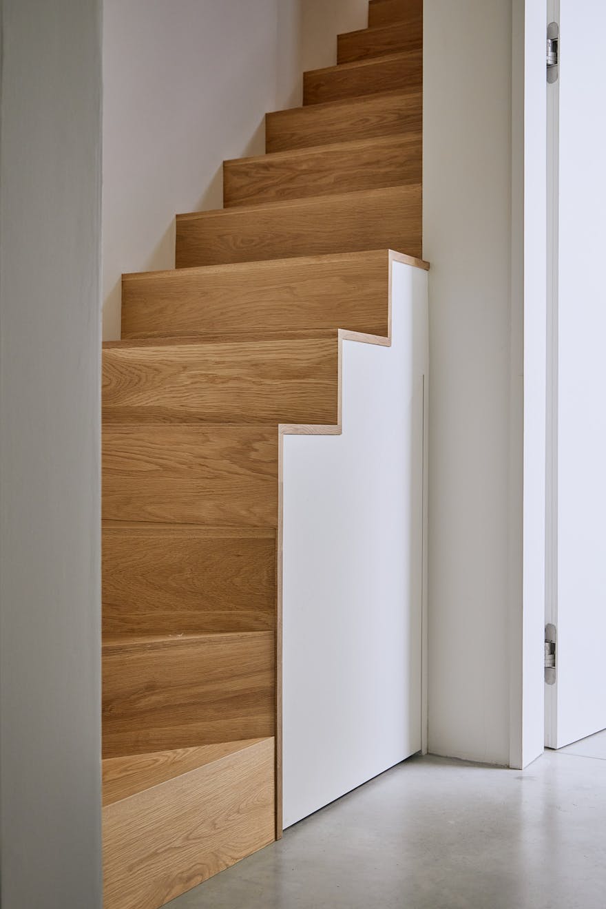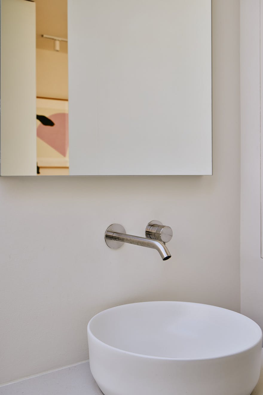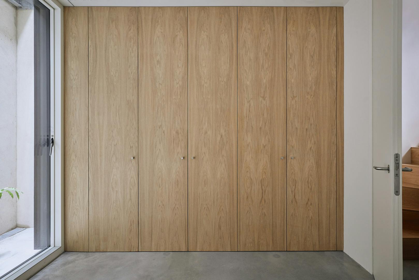 Descending to the lower floors through a softly curved arch, you’re welcomed by two bedrooms with extended ceiling heights and Lazenby polished concrete flooring. The principal bedroom is positioned at the rear, where floor-to-ceiling doors open onto a courtyard. Fritze Hansen Caravaggio wall lights and built-in oak wardrobes add warmth to the space here. The second bedroom also enjoys direct access to its own private courtyard, with natural light drawn in from the double-height atrium- a bright, calming space, equally suited to rest or focused work.