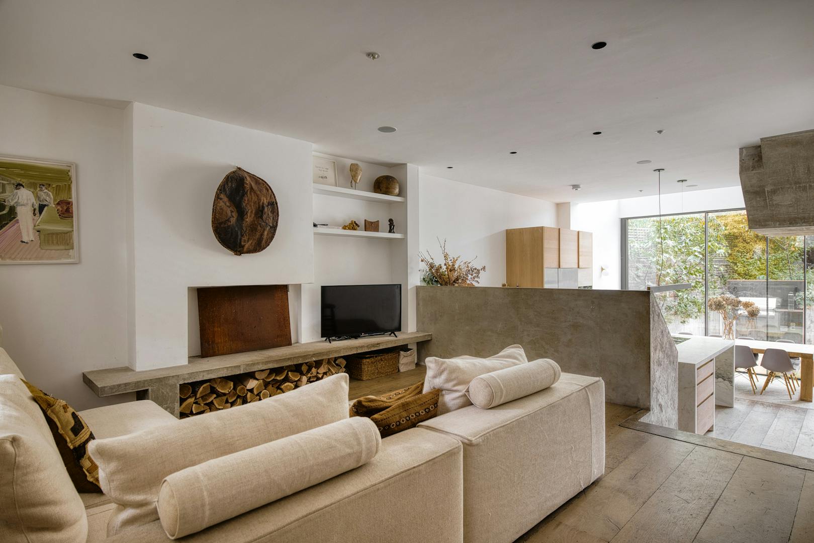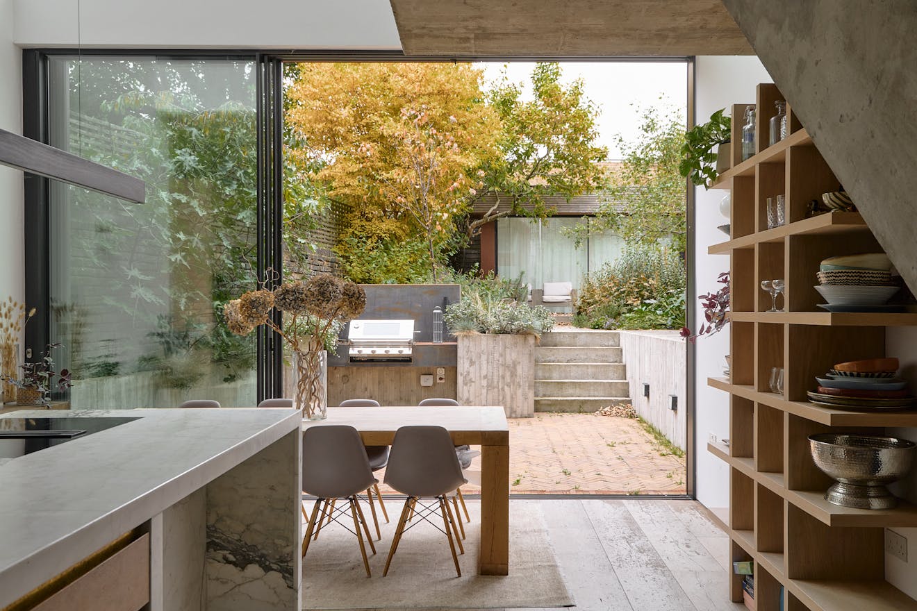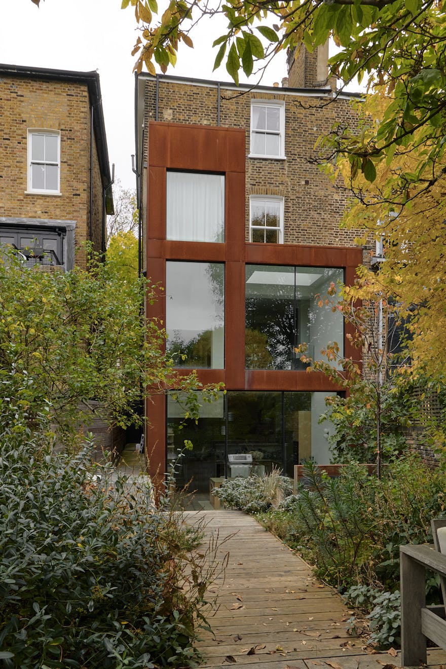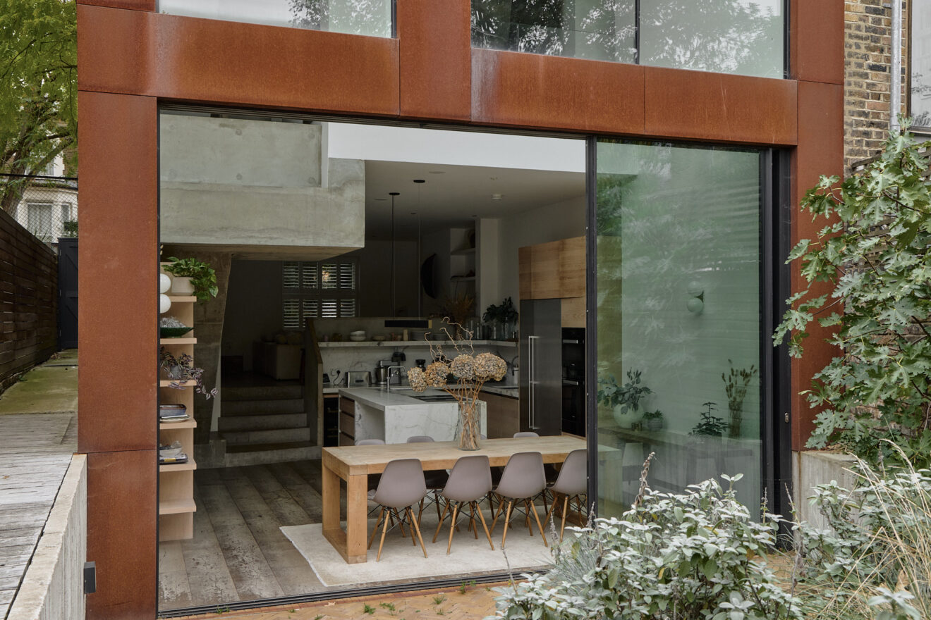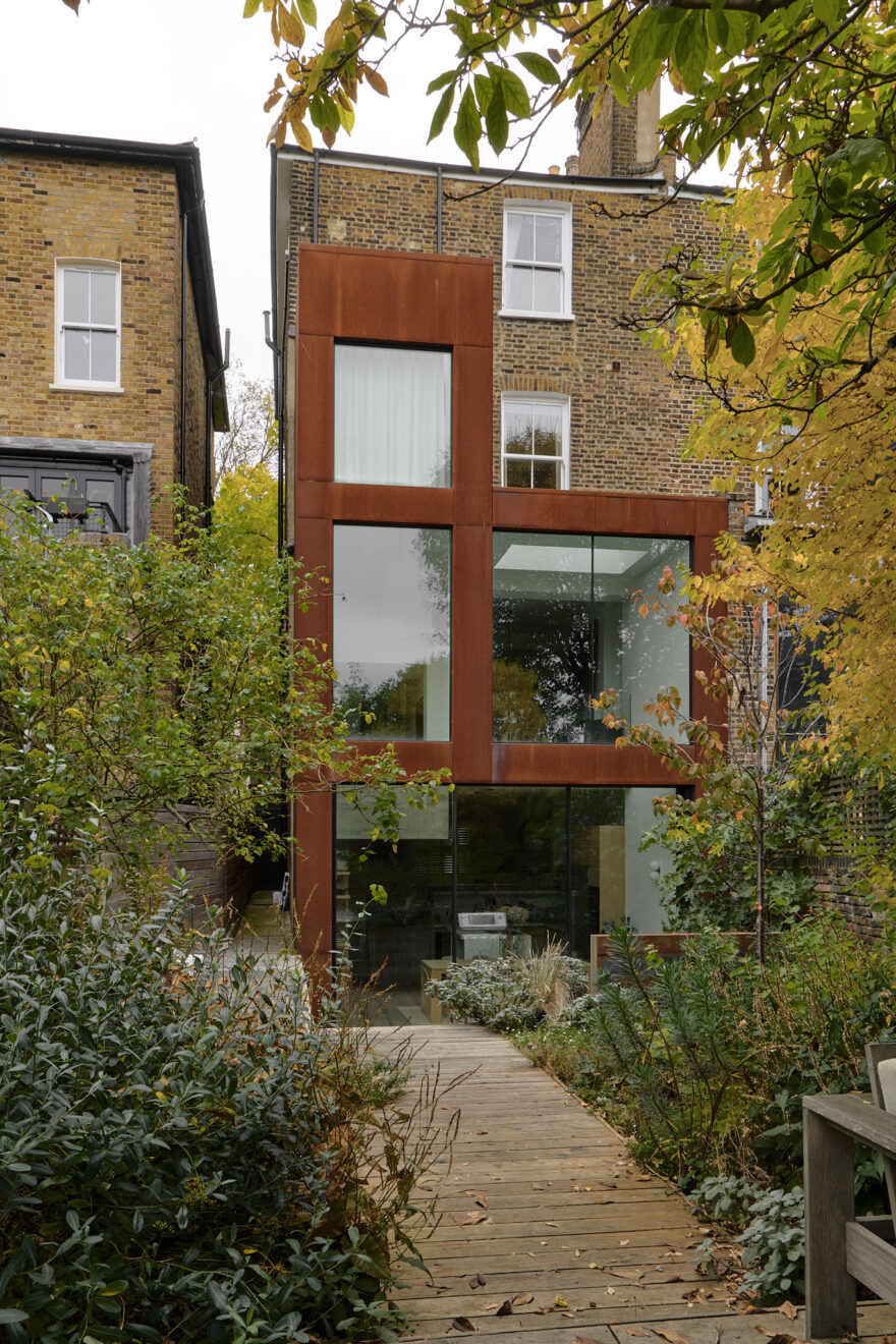 From this vantage point, the bold, modern double-height extension comes into view. A cast in-situ concrete staircase leads to the lower levels, where a split-level layout includes a kitchen with custom cabinetry by McCormack Joinery, marble sourced from Hullebusch in Belgium, integrated appliances, and a cosy family living area. Three, expansive glazed panes slide back to open onto a sunken sun terrace, emphasising the generous scale of the new outrigger, built from Corten (weathered steel). Dedraft described their approach: “We chose a single, continuous material to unify and define the rear façade.” The result is a singular architectural intervention that has featured in the Architects Journal, Elle Decoration, Dezeen and Wallpaper* magazine.