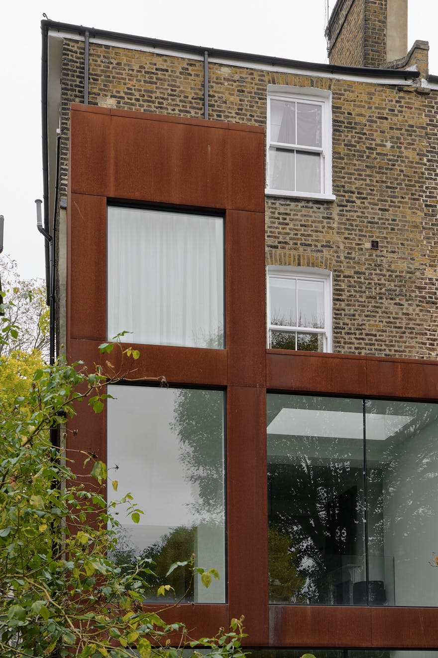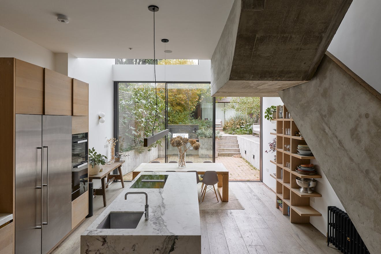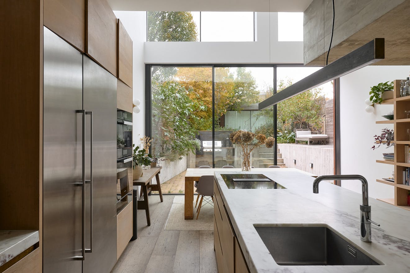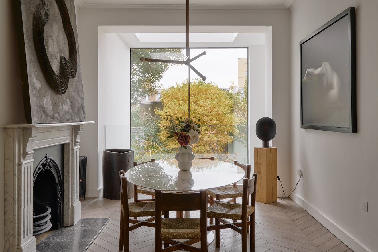 From this vantage point, the bold, modern double-height extension comes into view. A cast in-situ concrete staircase leads to the lower levels, where a split-level layout includes a kitchen with custom cabinetry by McCormack Joinery, marble sourced from Hullebusch in Belgium, integrated appliances, and a cosy family living area. Three, expansive glazed panes slide back to open onto a sunken sun terrace, emphasising the generous scale of the new outrigger, built from Corten (weathered steel). Dedraft described their approach: “We chose a single, continuous material to unify and define the rear façade.” The result is a singular architectural intervention that has featured in the Architects Journal, Elle Decoration, Dezeen and Wallpaper* magazine.