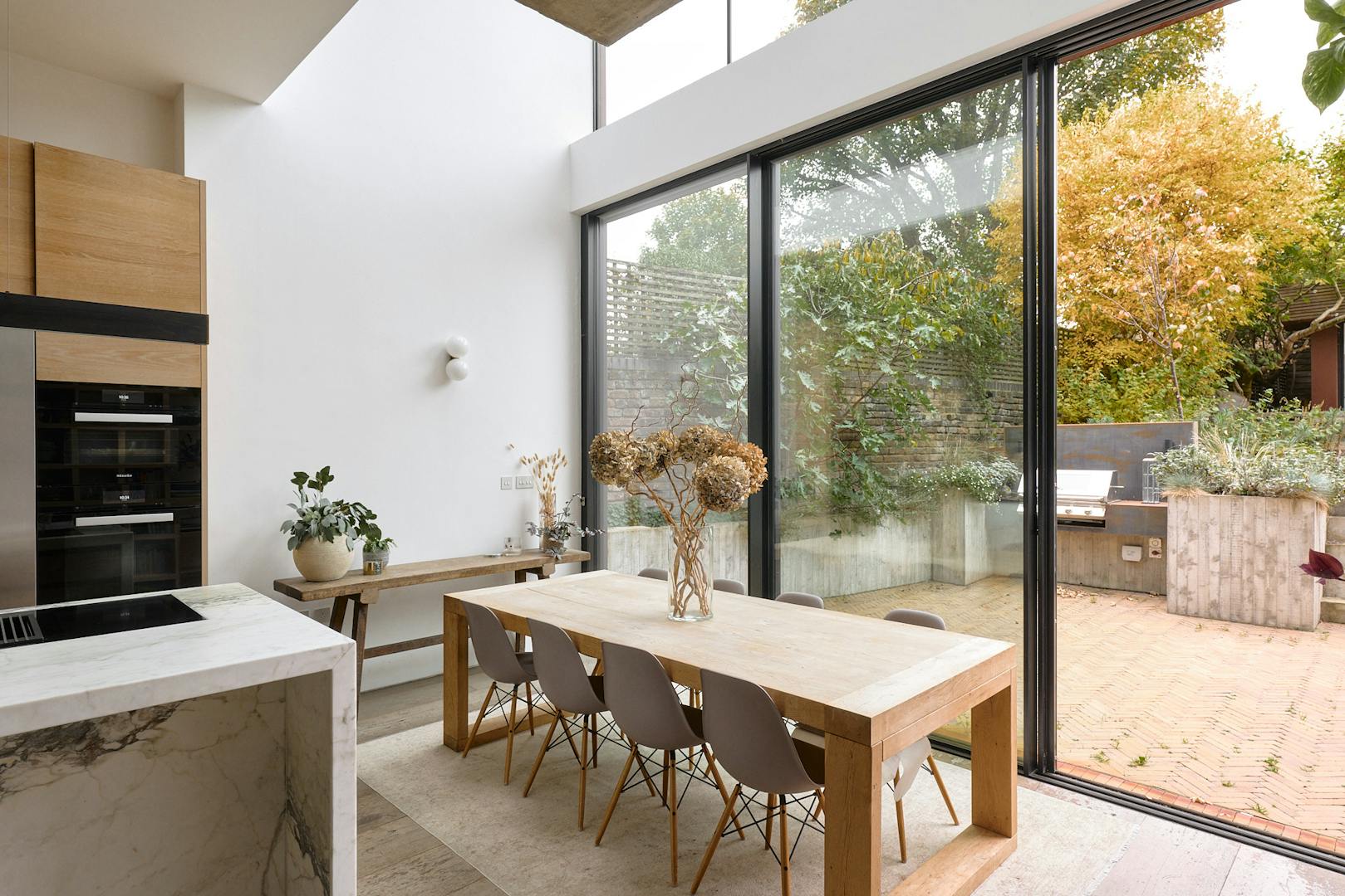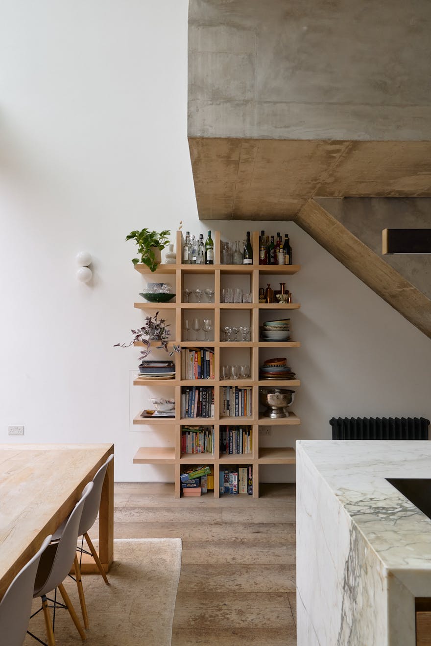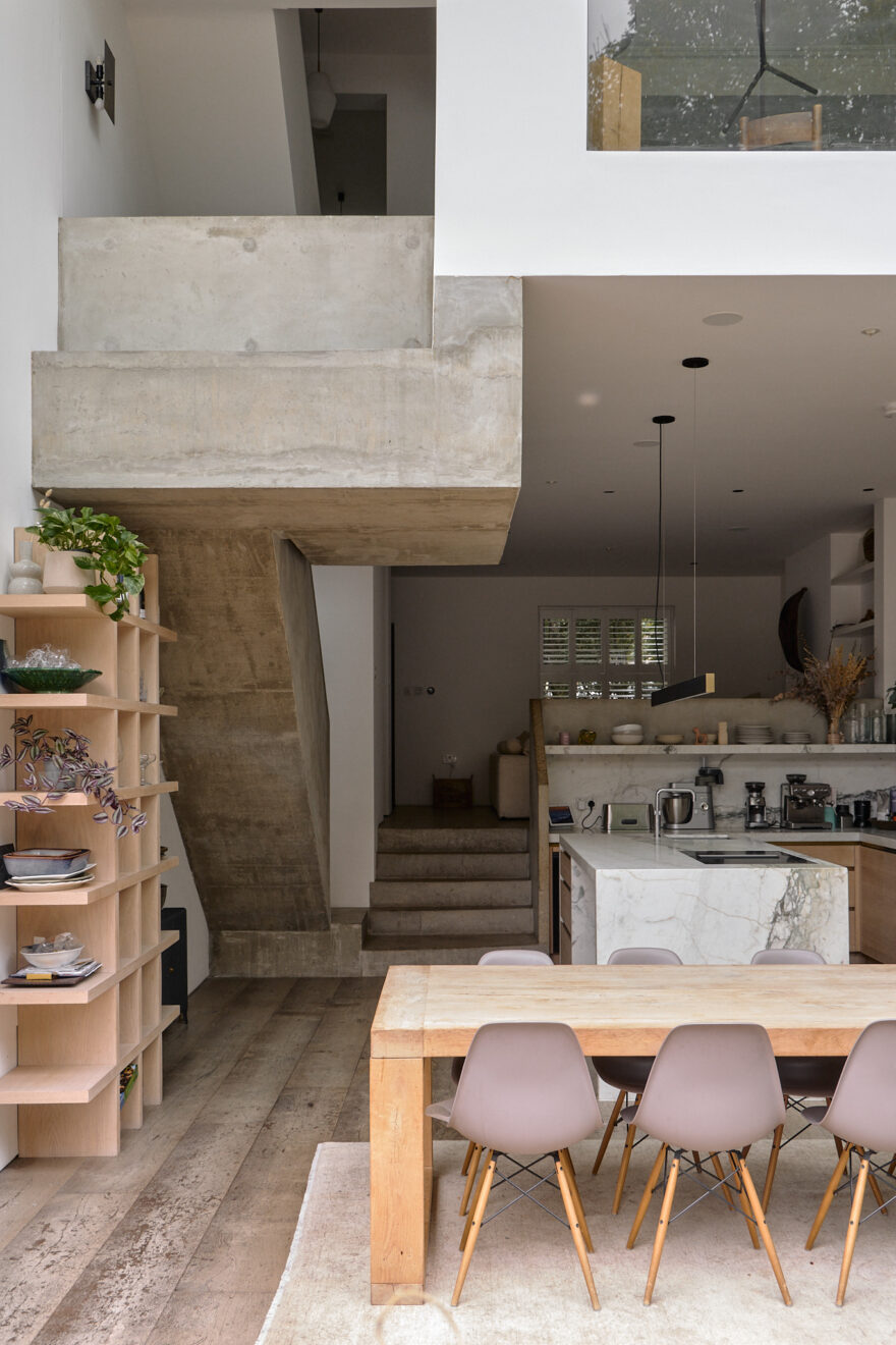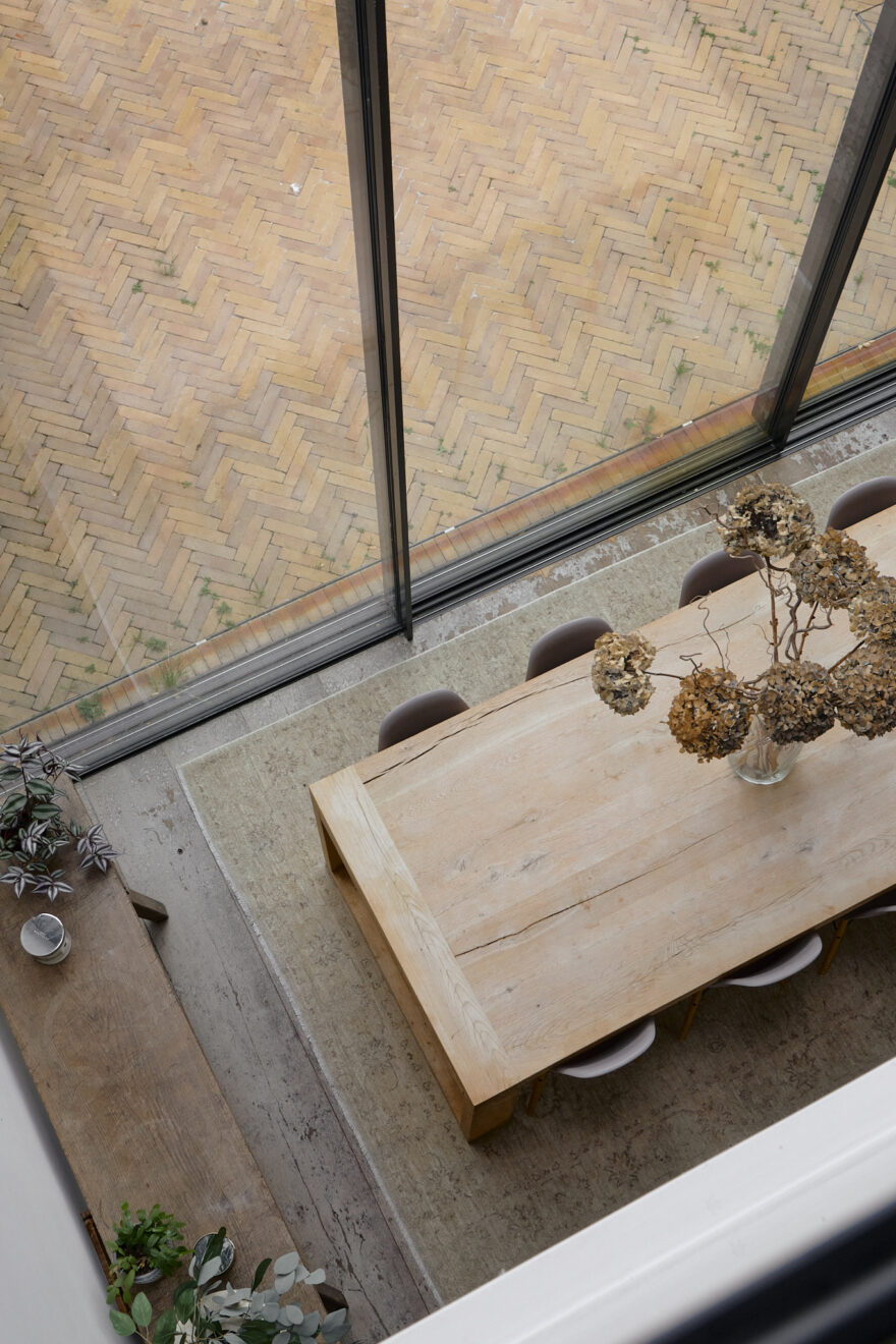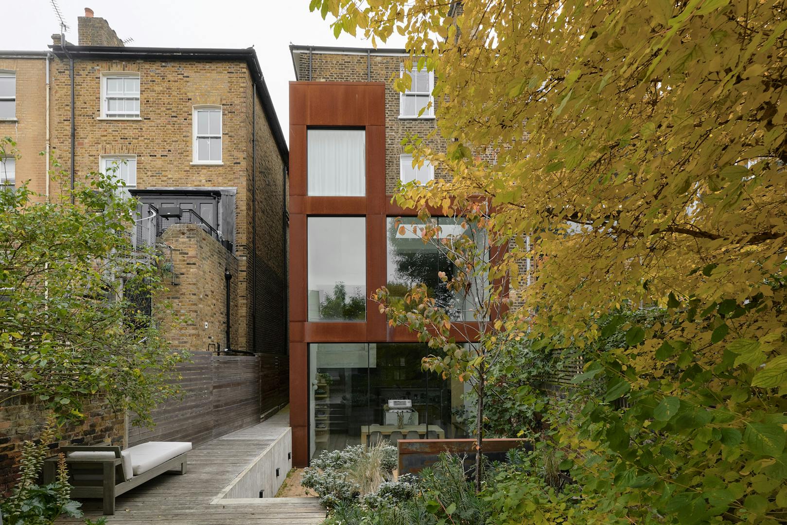 From this vantage point, the bold, modern double-height extension comes into view. A cast in-situ concrete staircase leads to the lower levels, where a split-level layout includes a kitchen with custom cabinetry by McCormack Joinery, marble sourced from Hullebusch in Belgium, integrated appliances, and a cosy family living area. Three, expansive glazed panes slide back to open onto a sunken sun terrace, emphasising the generous scale of the new outrigger, built from Corten (weathered steel). Dedraft described their approach: “We chose a single, continuous material to unify and define the rear façade.” The result is a singular architectural intervention that has featured in the Architects Journal, Elle Decoration, Dezeen and Wallpaper* magazine.