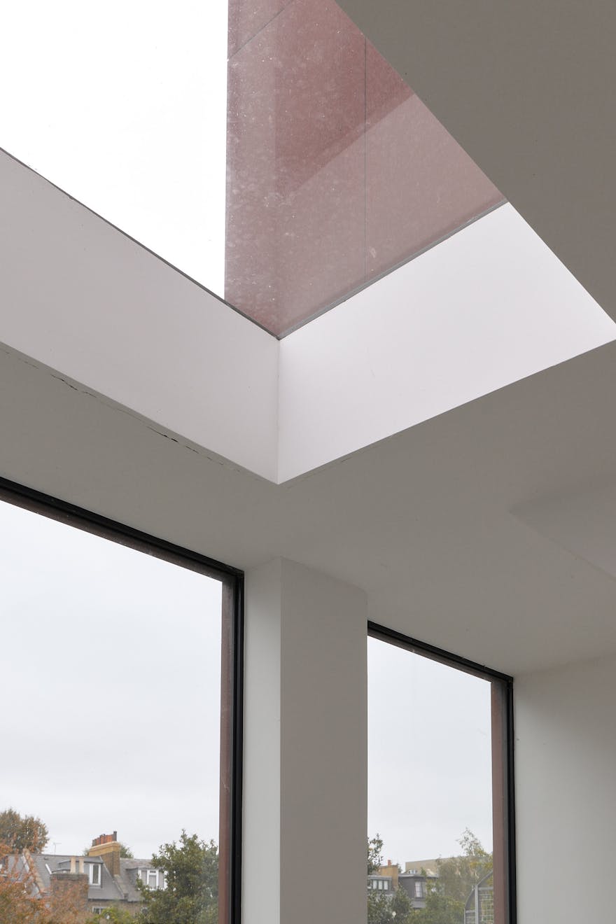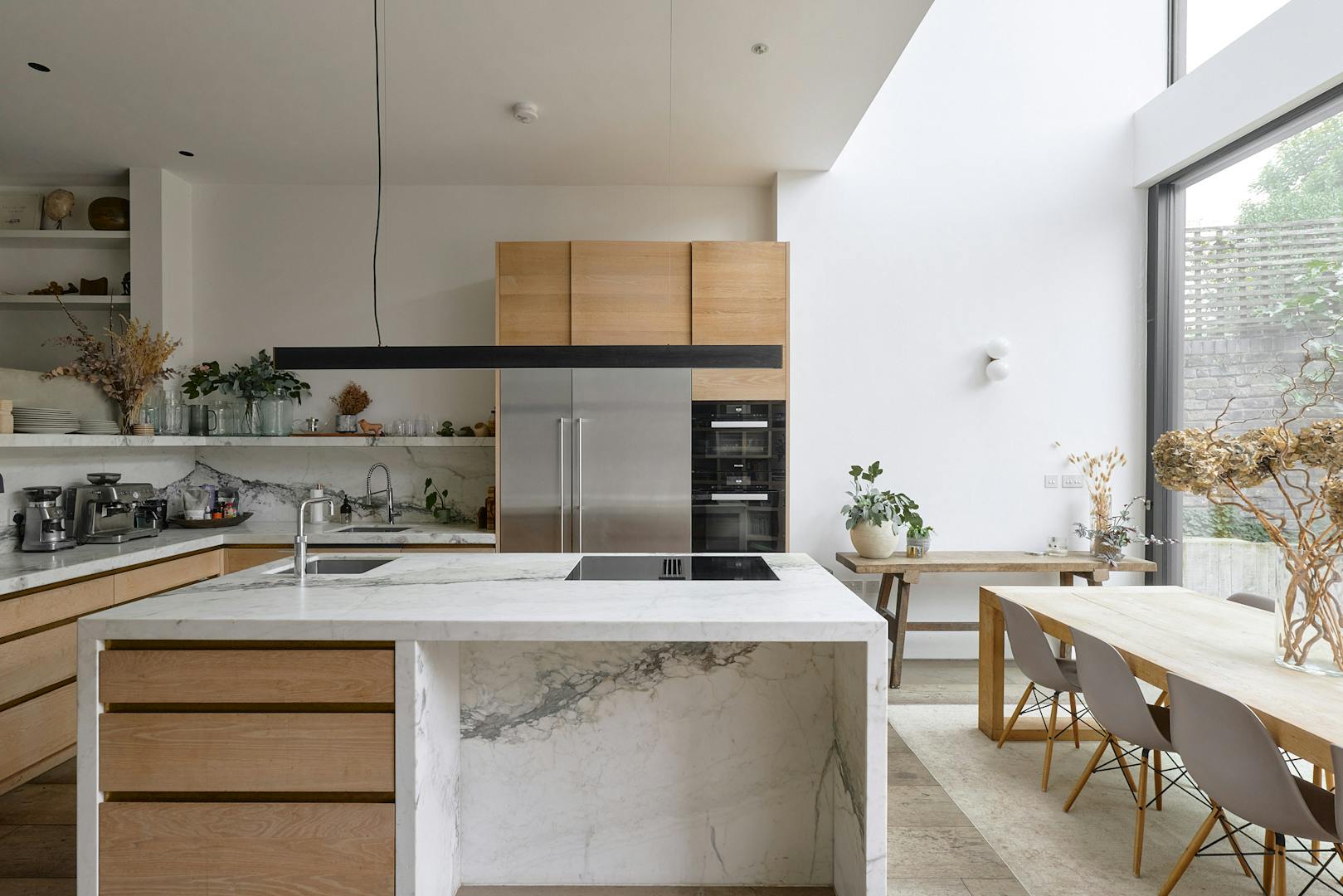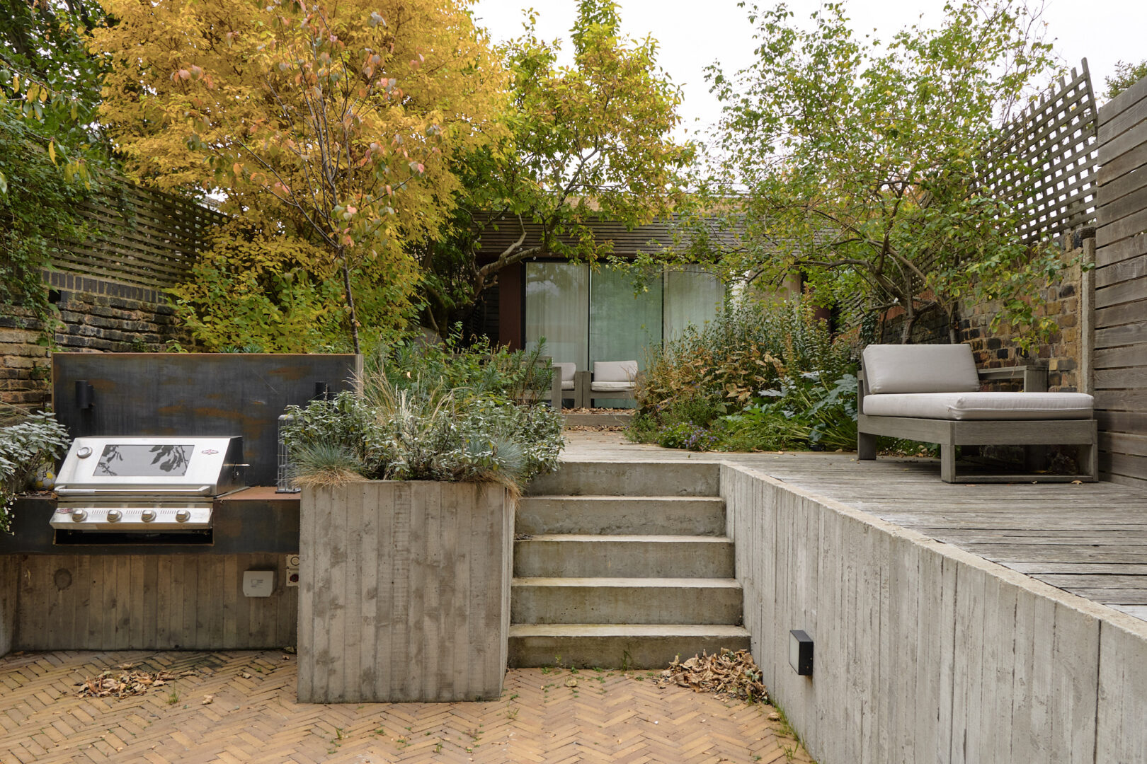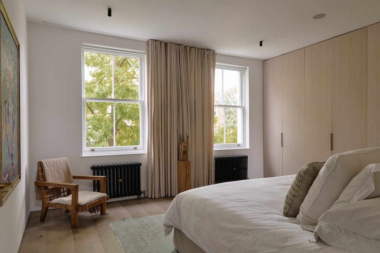 From this vantage point, the bold, modern double-height extension comes into view. A cast in-situ concrete staircase leads to the lower levels, where a split-level layout includes a kitchen with custom cabinetry by McCormack Joinery, marble sourced from Hullebusch in Belgium, integrated appliances, and a cosy family living area. Three, expansive glazed panes slide back to open onto a sunken sun terrace, emphasising the generous scale of the new outrigger, built from Corten (weathered steel). Dedraft described their approach: “We chose a single, continuous material to unify and define the rear façade.” The result is a singular architectural intervention that has featured in the Architects Journal, Elle Decoration, Dezeen and Wallpaper* magazine.