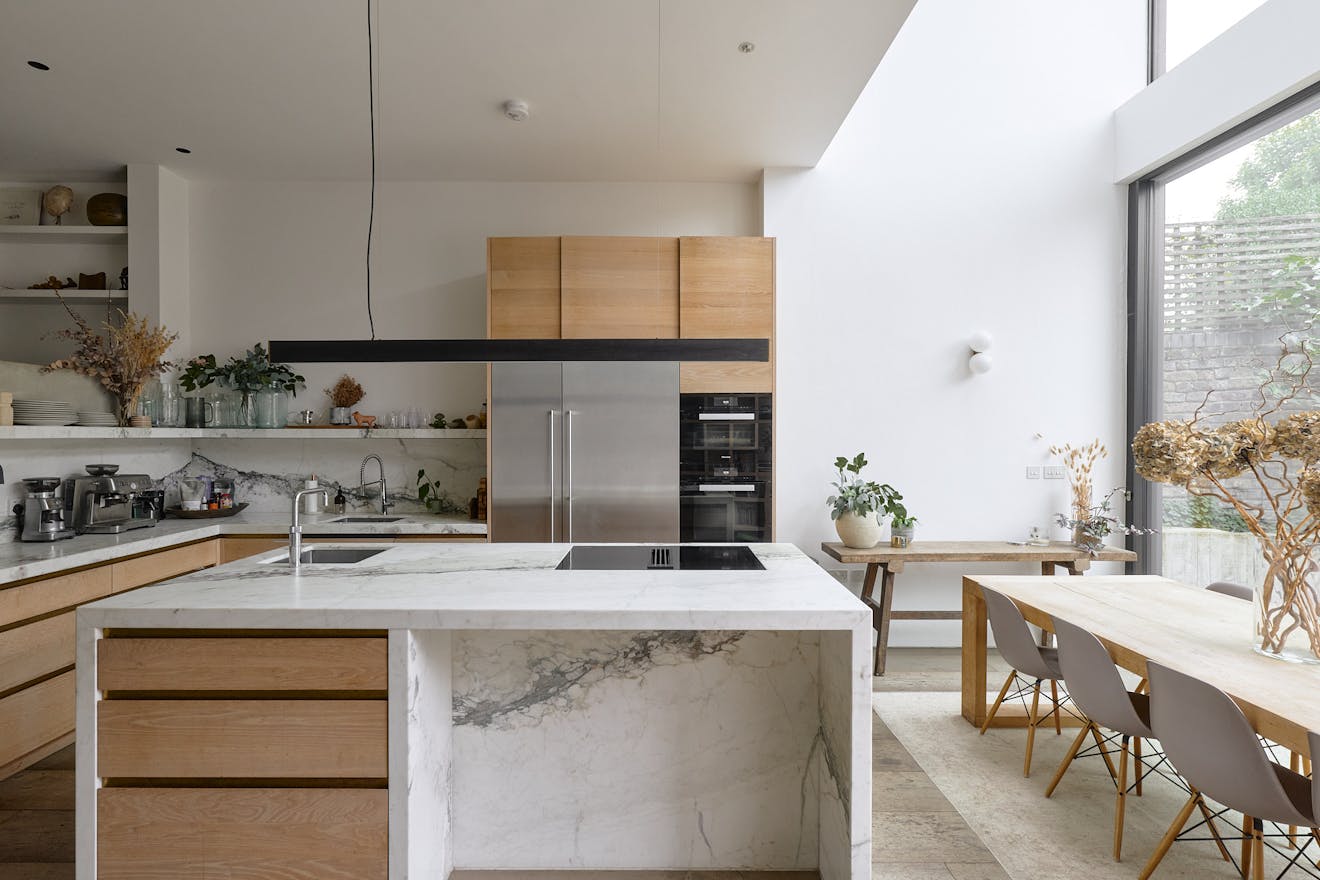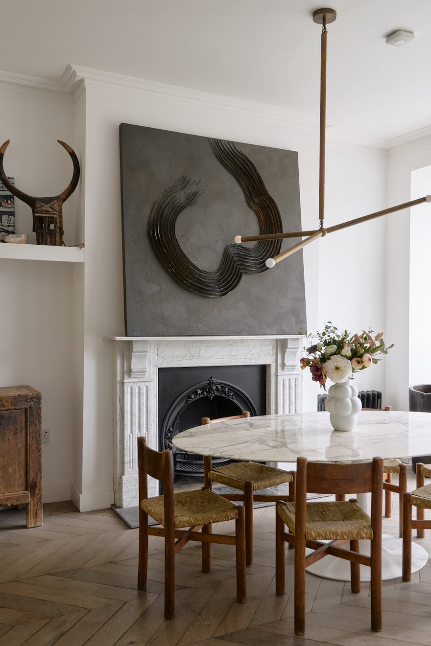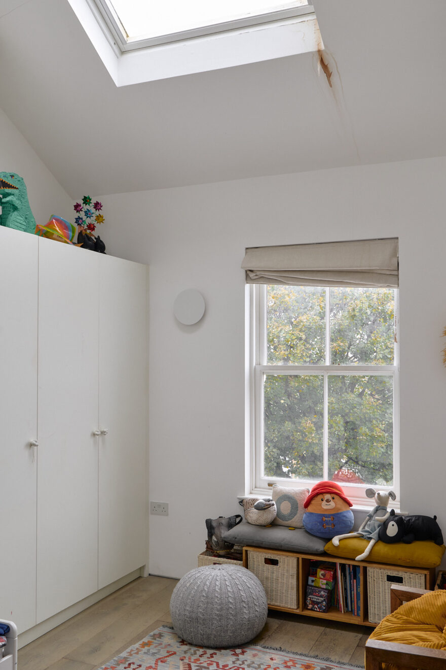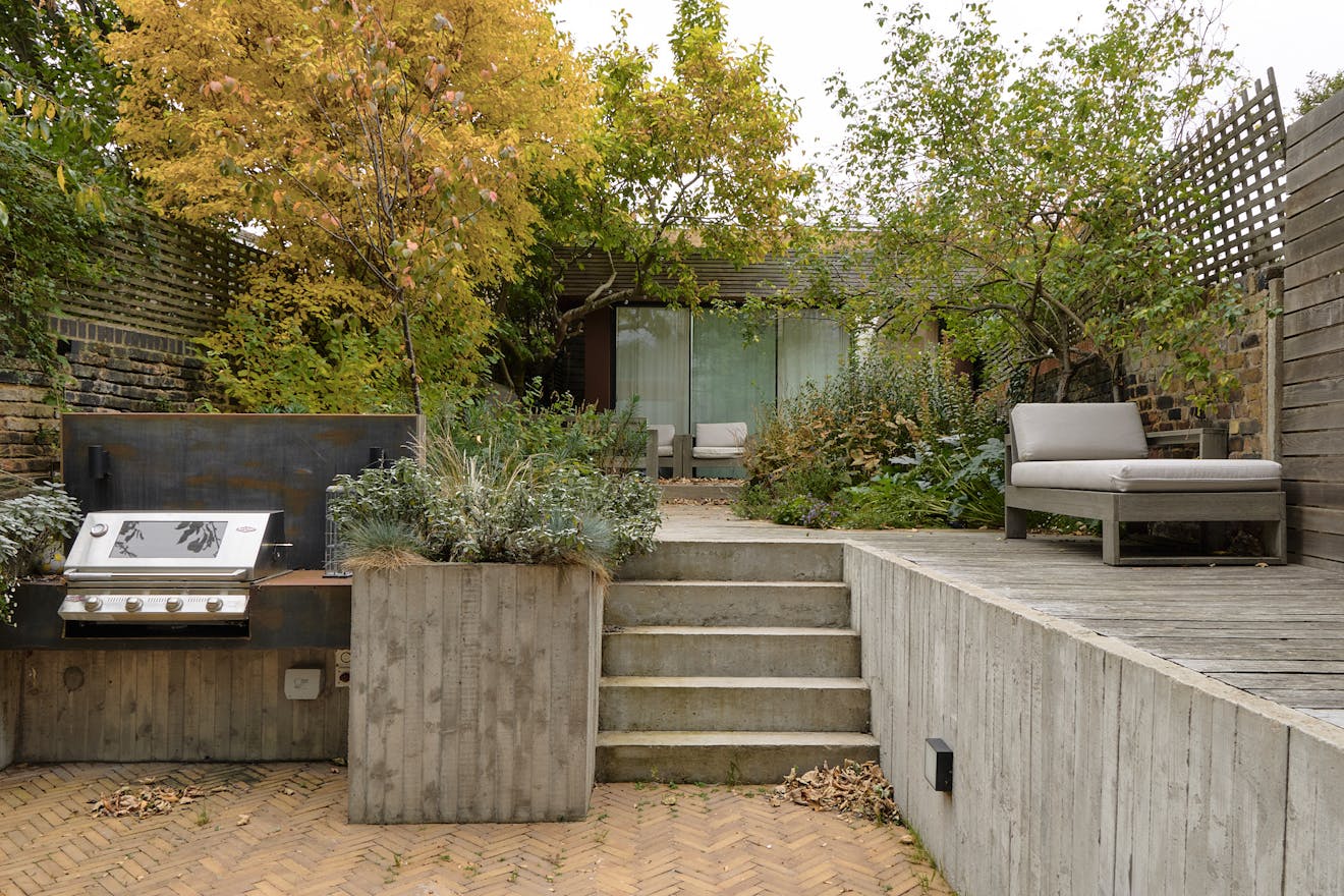 From this vantage point, the bold, modern double-height extension comes into view. A cast in-situ concrete staircase leads to the lower levels, where a split-level layout includes a kitchen with custom cabinetry by McCormack Joinery, marble sourced from Hullebusch in Belgium, integrated appliances, and a cosy family living area. Three, expansive glazed panes slide back to open onto a sunken sun terrace, emphasising the generous scale of the new outrigger, built from Corten (weathered steel). Dedraft described their approach: “We chose a single, continuous material to unify and define the rear façade.” The result is a singular architectural intervention that has featured in the Architects Journal, Elle Decoration, Dezeen and Wallpaper* magazine.