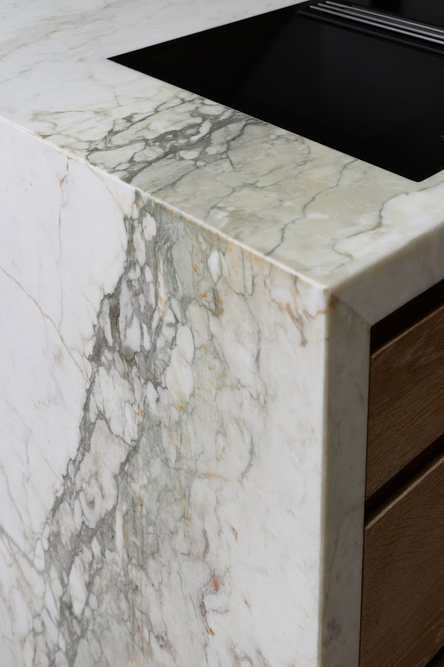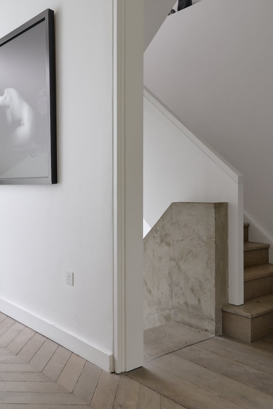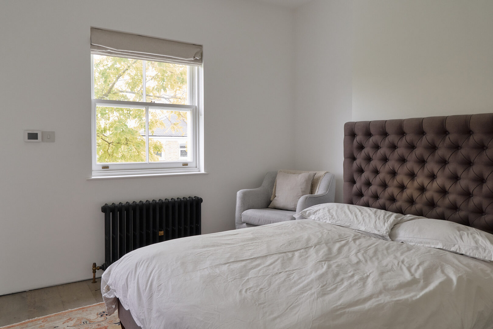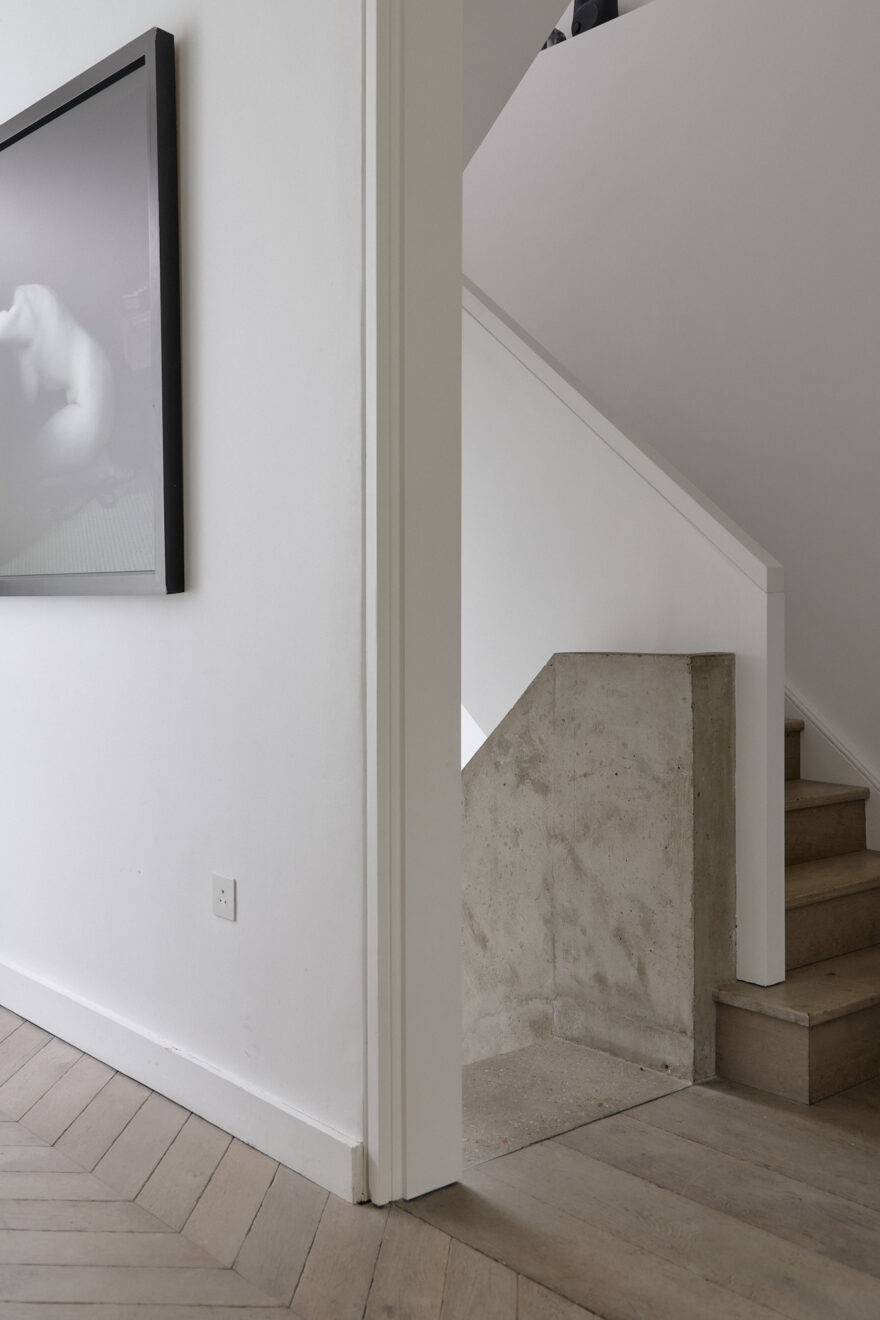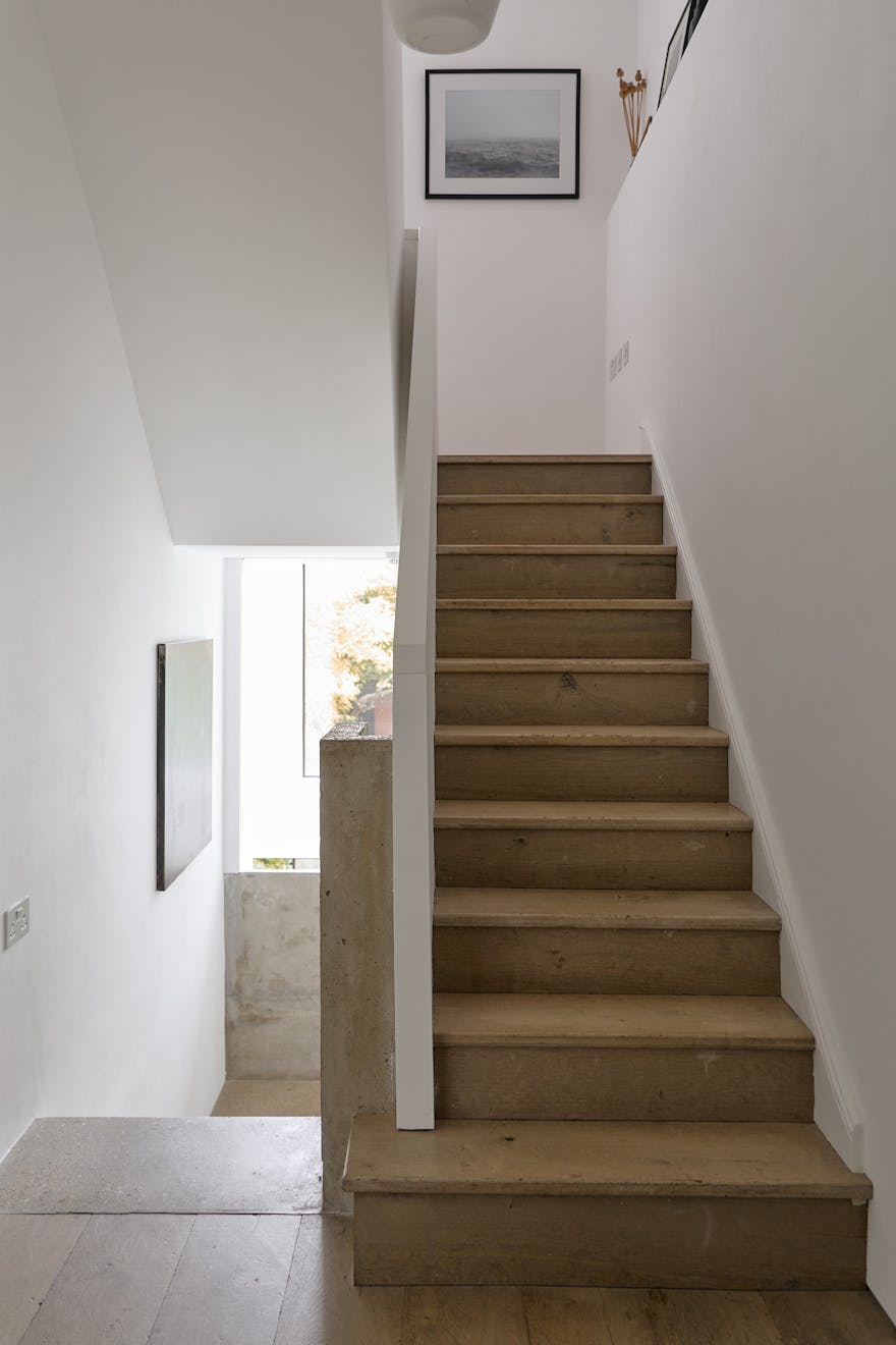 From this vantage point, the bold, modern double-height extension comes into view. A cast in-situ concrete staircase leads to the lower levels, where a split-level layout includes a kitchen with custom cabinetry by McCormack Joinery, marble sourced from Hullebusch in Belgium, integrated appliances, and a cosy family living area. Three, expansive glazed panes slide back to open onto a sunken sun terrace, emphasising the generous scale of the new outrigger, built from Corten (weathered steel). Dedraft described their approach: “We chose a single, continuous material to unify and define the rear façade.” The result is a singular architectural intervention that has featured in the Architects Journal, Elle Decoration, Dezeen and Wallpaper* magazine.