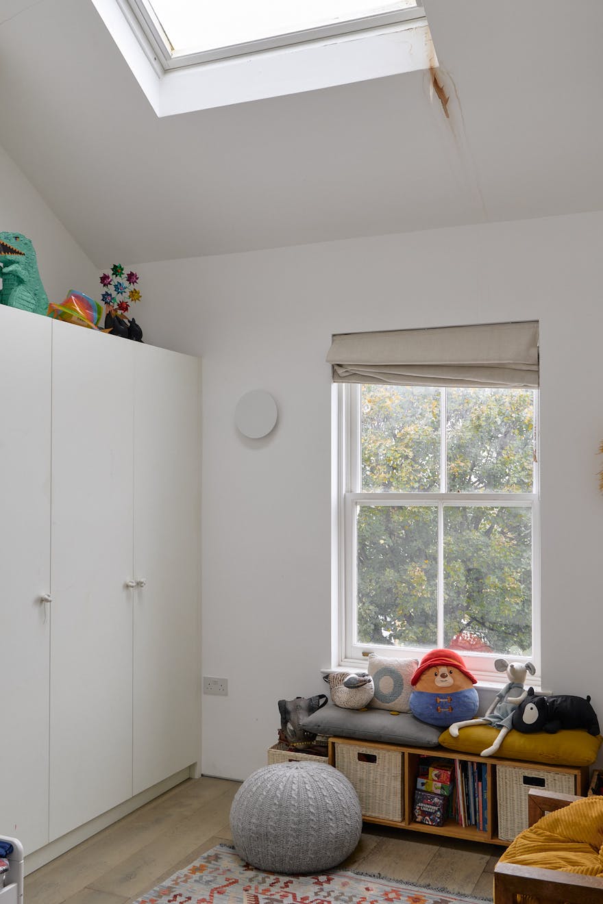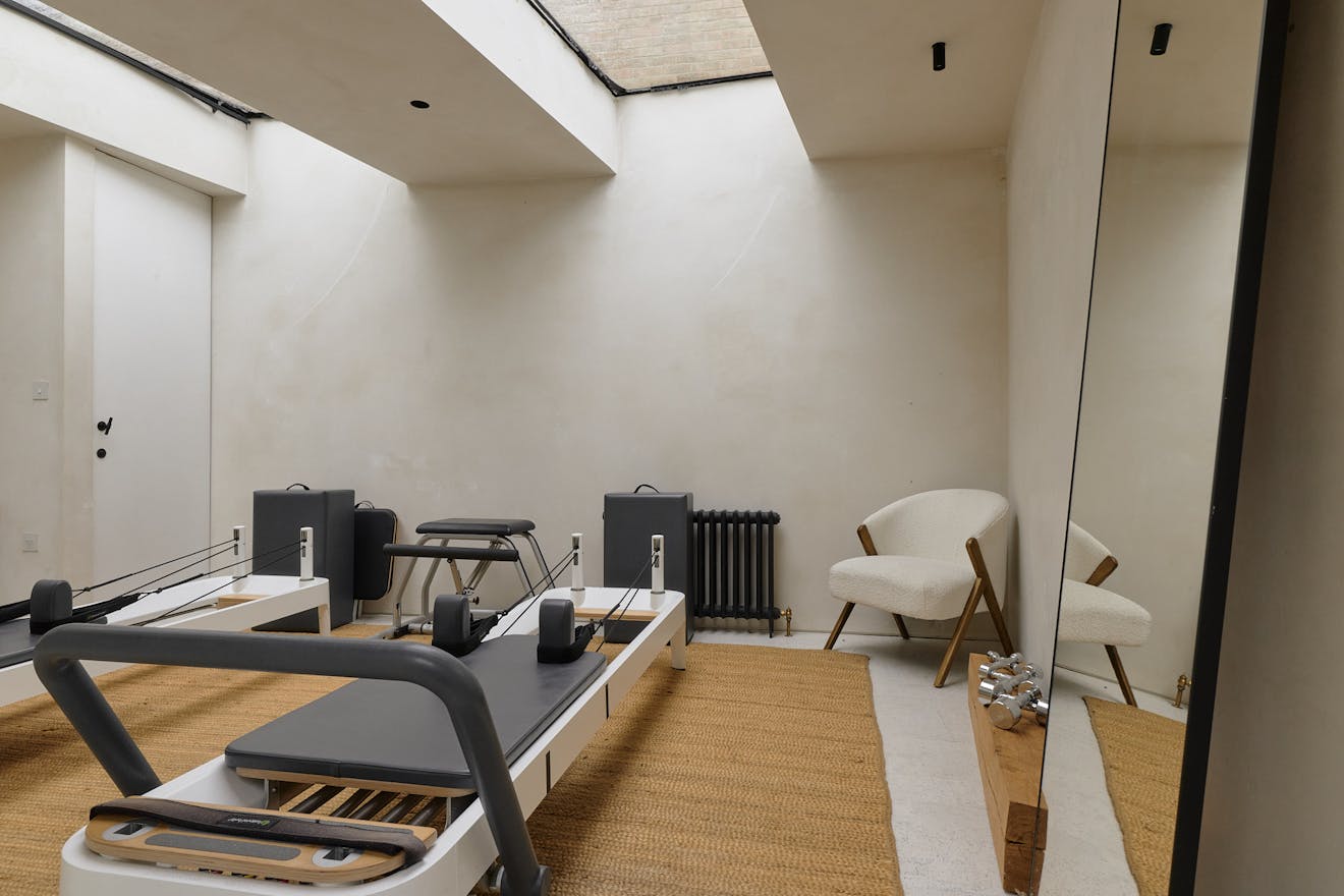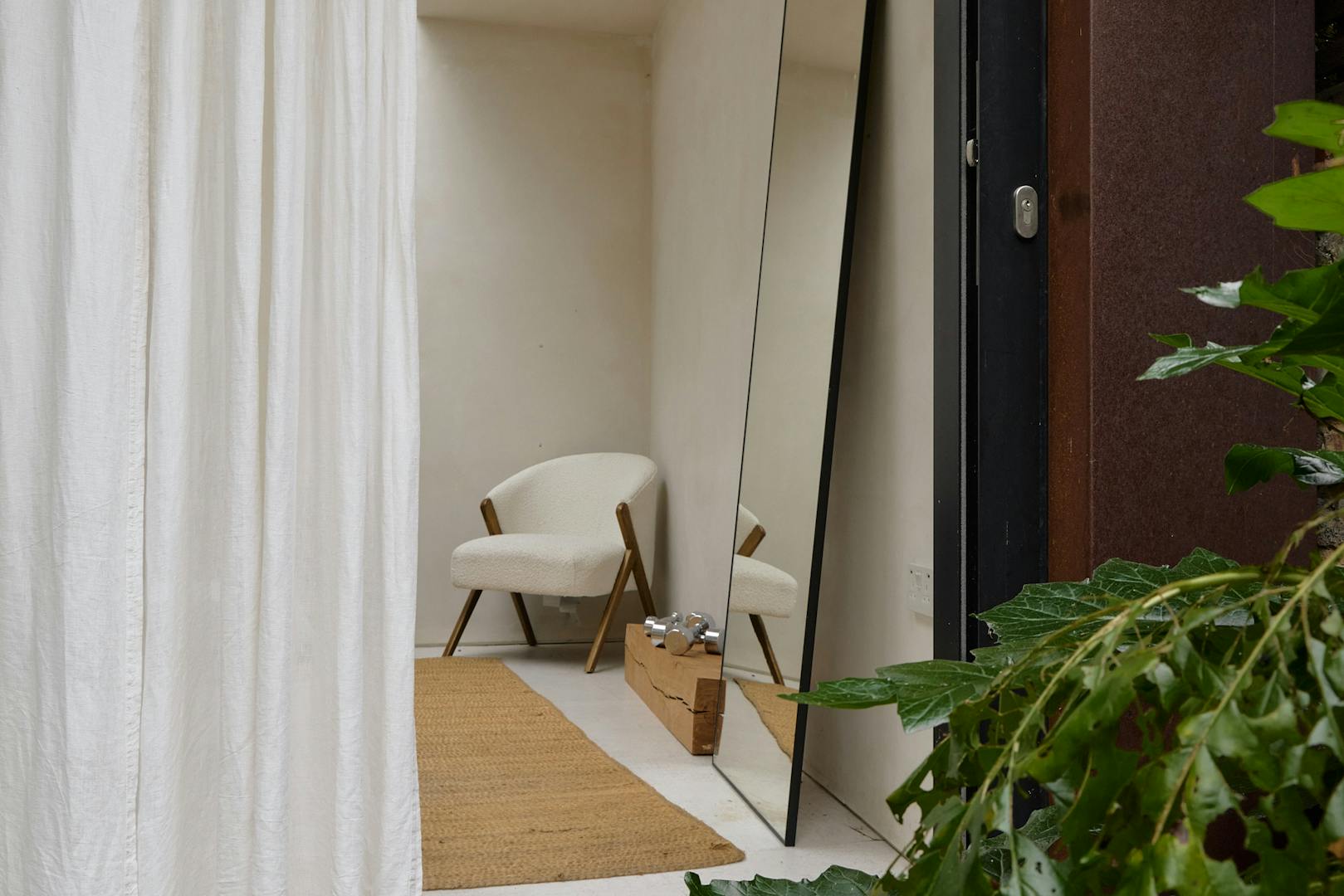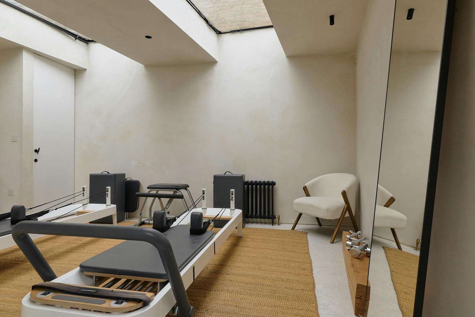 The second floor hosts two additional bedrooms, one with an en-suite shower. At the top of the house, a flexible study doubles as a guest room. Outside, a paved terrace with an outdoor kitchen is perfect for entertaining, with concrete steps leading to an outbuilding currently used as a Pilates studio. Complete with a Toto Japanese toilet, the space mirrors the townhouse’s design with large glazed doors opening to the garden. Surrounded by wildflowers, evergreens, and perennial grasses, the setting fosters a strong connection to nature in this prime East London location.