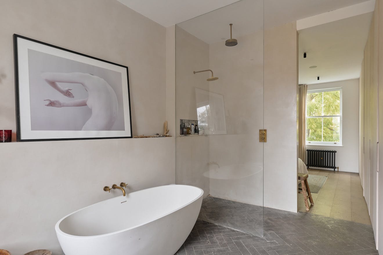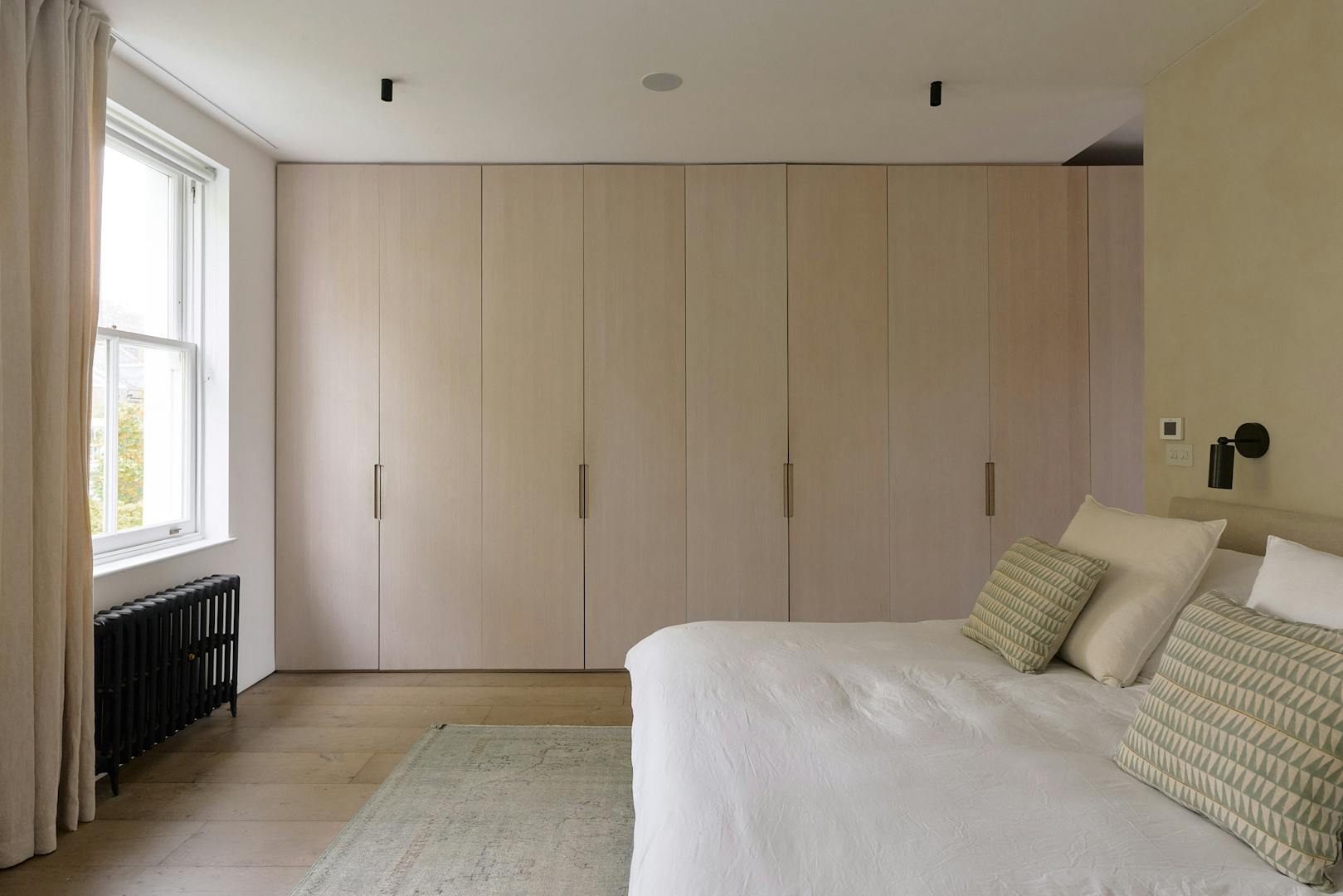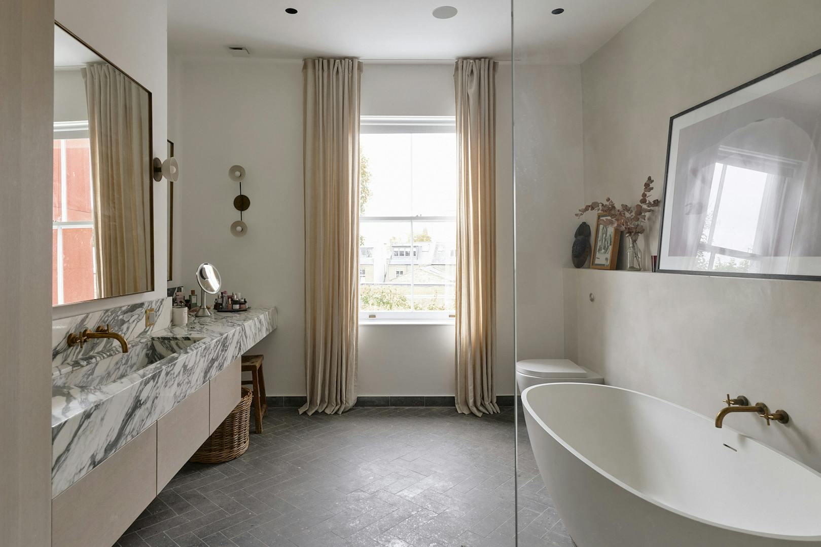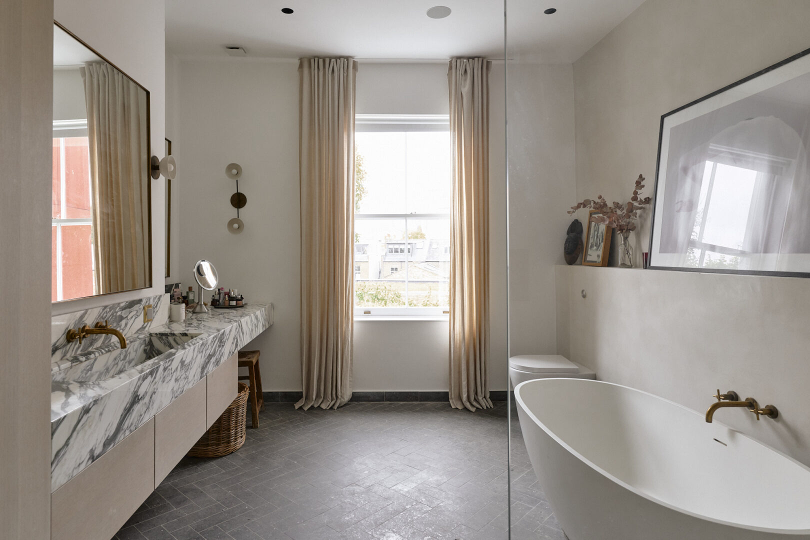Inside, the first floor is dedicated to the principal suite, where bespoke wardrobe storage is discreetly integrated along one wall, leading into a spacious en suite. Centred around a custom-made marble sink with brass hardware, the bathroom has a Tadelakt lime plaster finish and also features a freestanding bath and a walk-in shower; elements of this refined material palette are echoed across the home’s three further bathrooms.