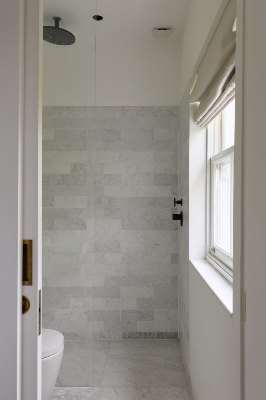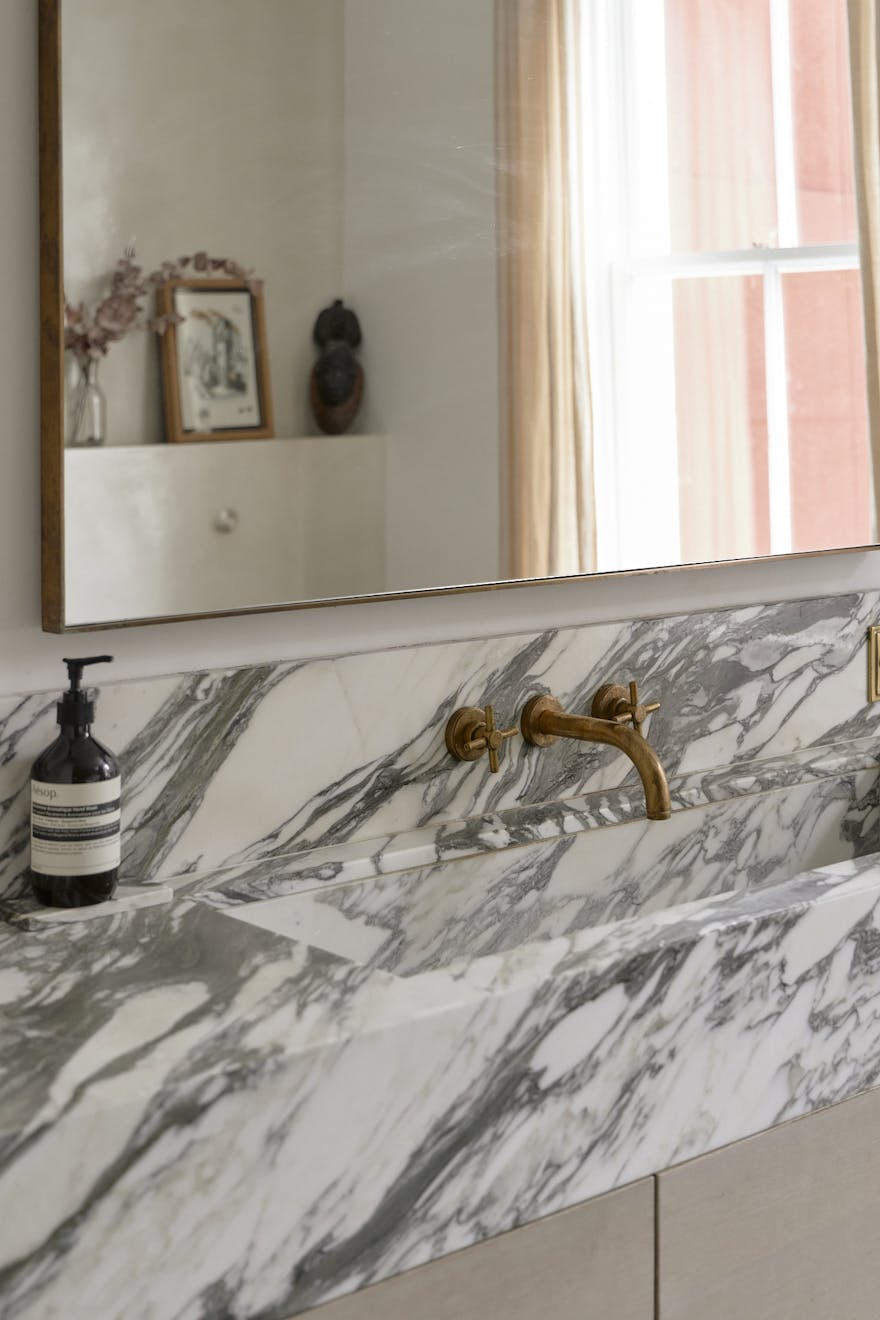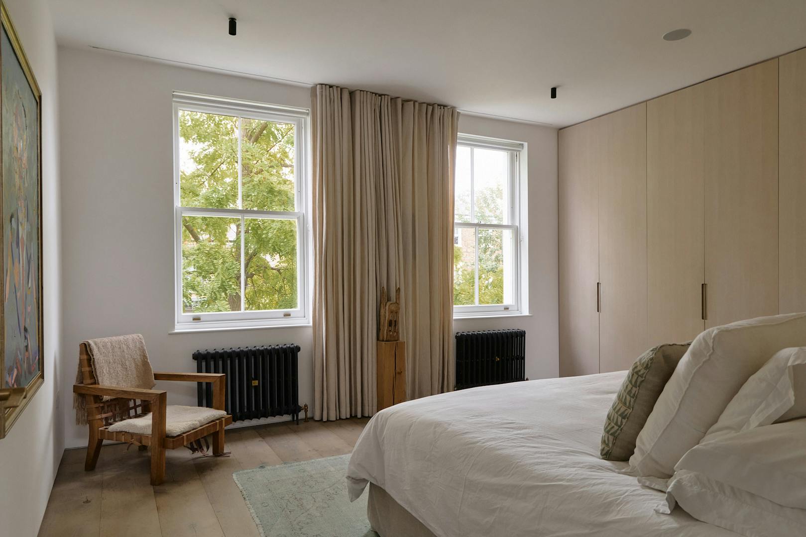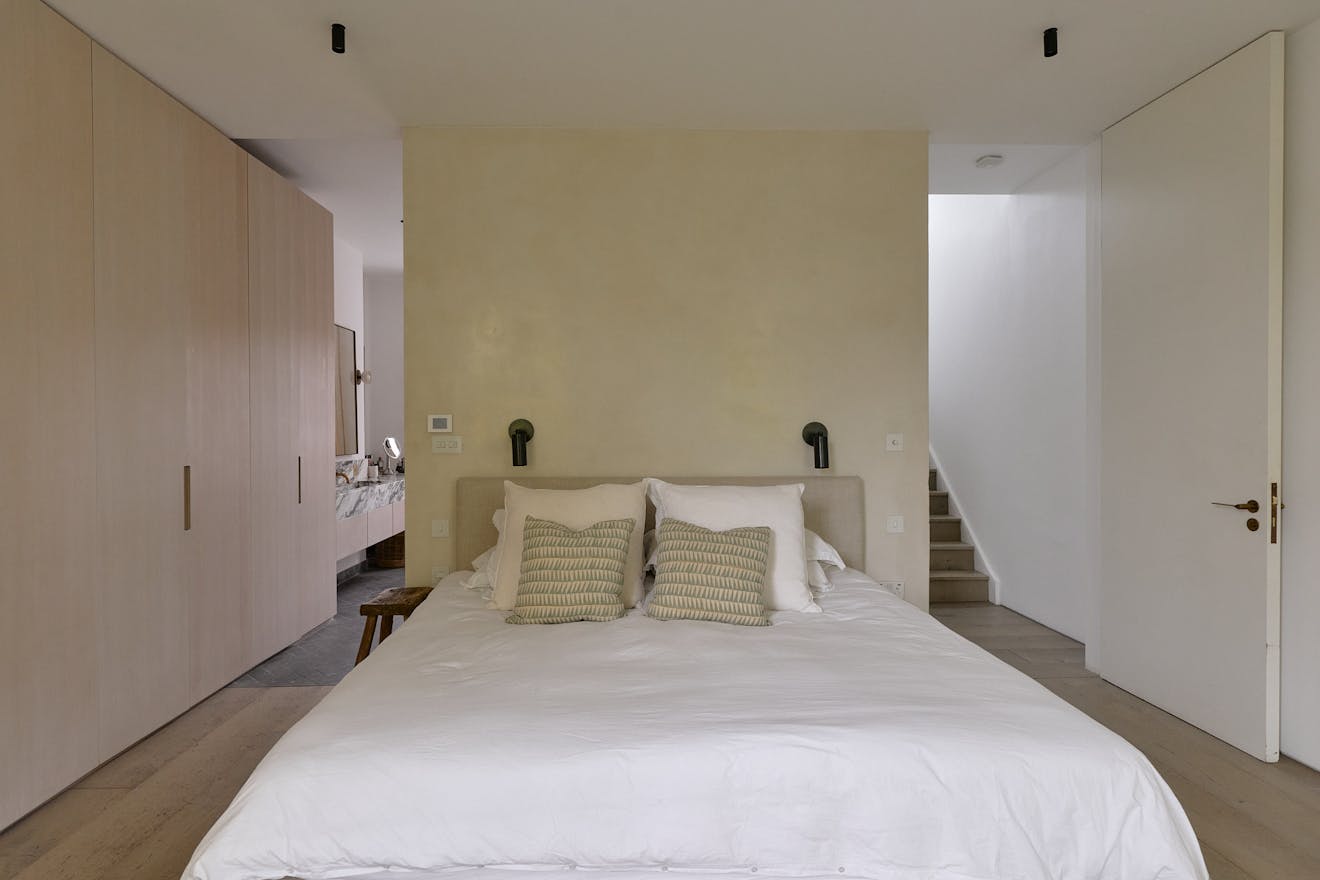 Inside, the first floor is dedicated to the principal suite, where bespoke wardrobe storage is discreetly integrated along one wall, leading into a spacious en suite. Centred around a custom-made marble sink with brass hardware, the bathroom has a Tadelakt lime plaster finish and also features a freestanding bath and a walk-in shower; elements of this refined material palette are echoed across the home’s three further bathrooms.