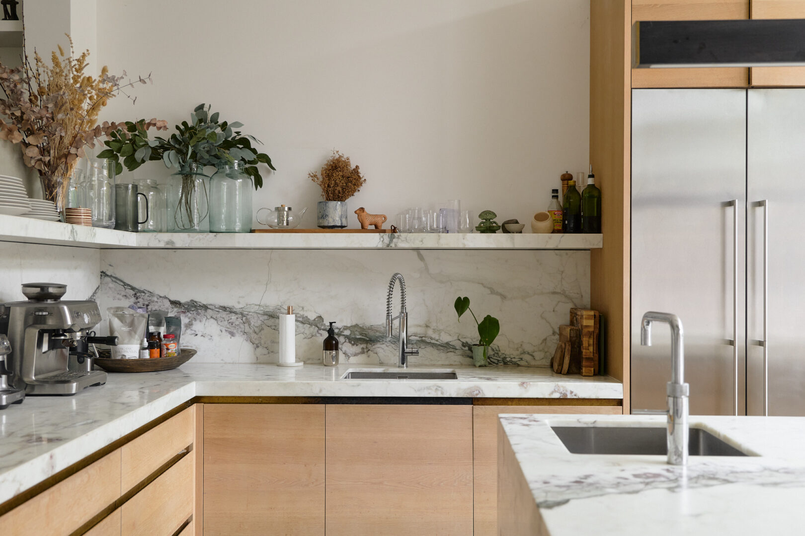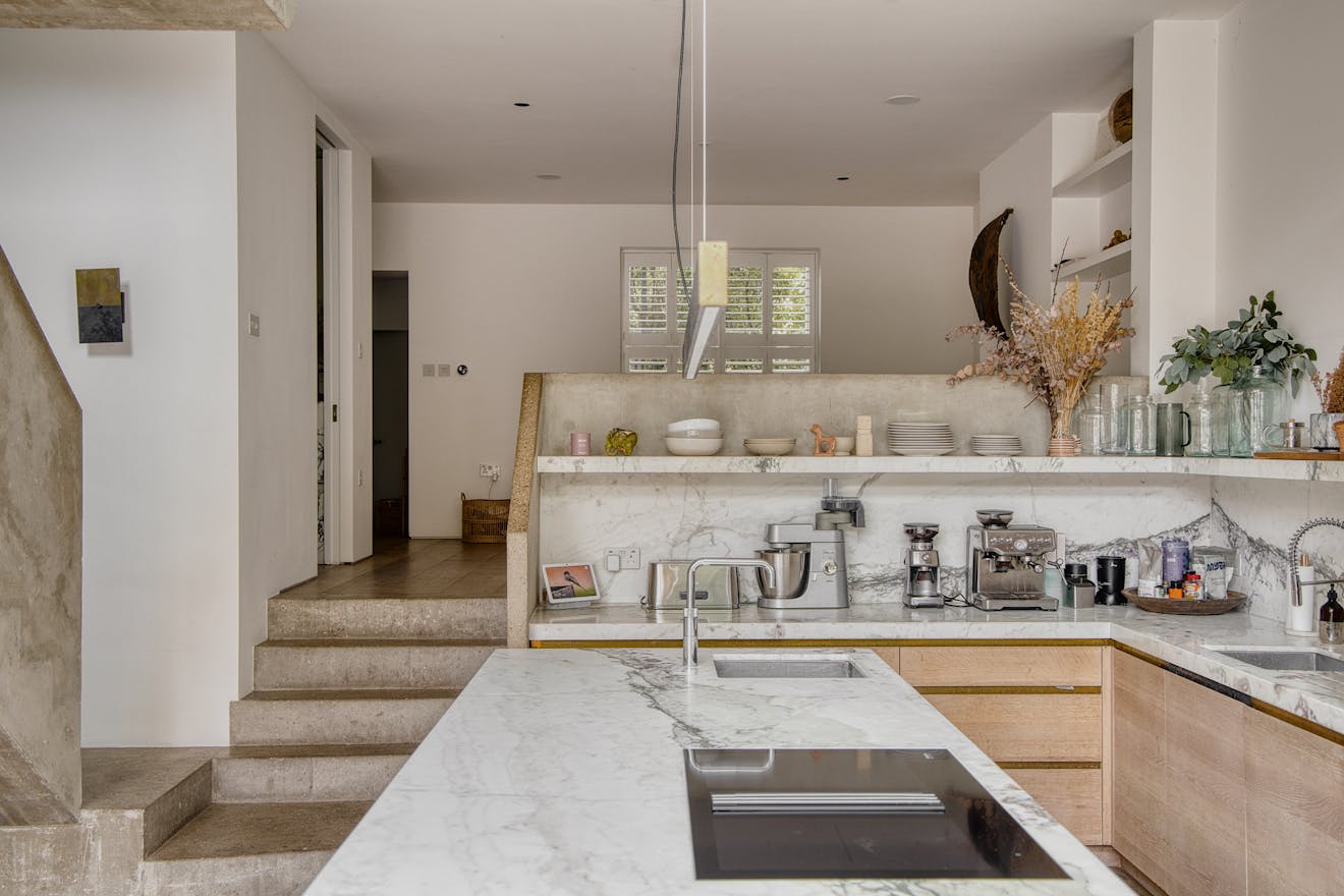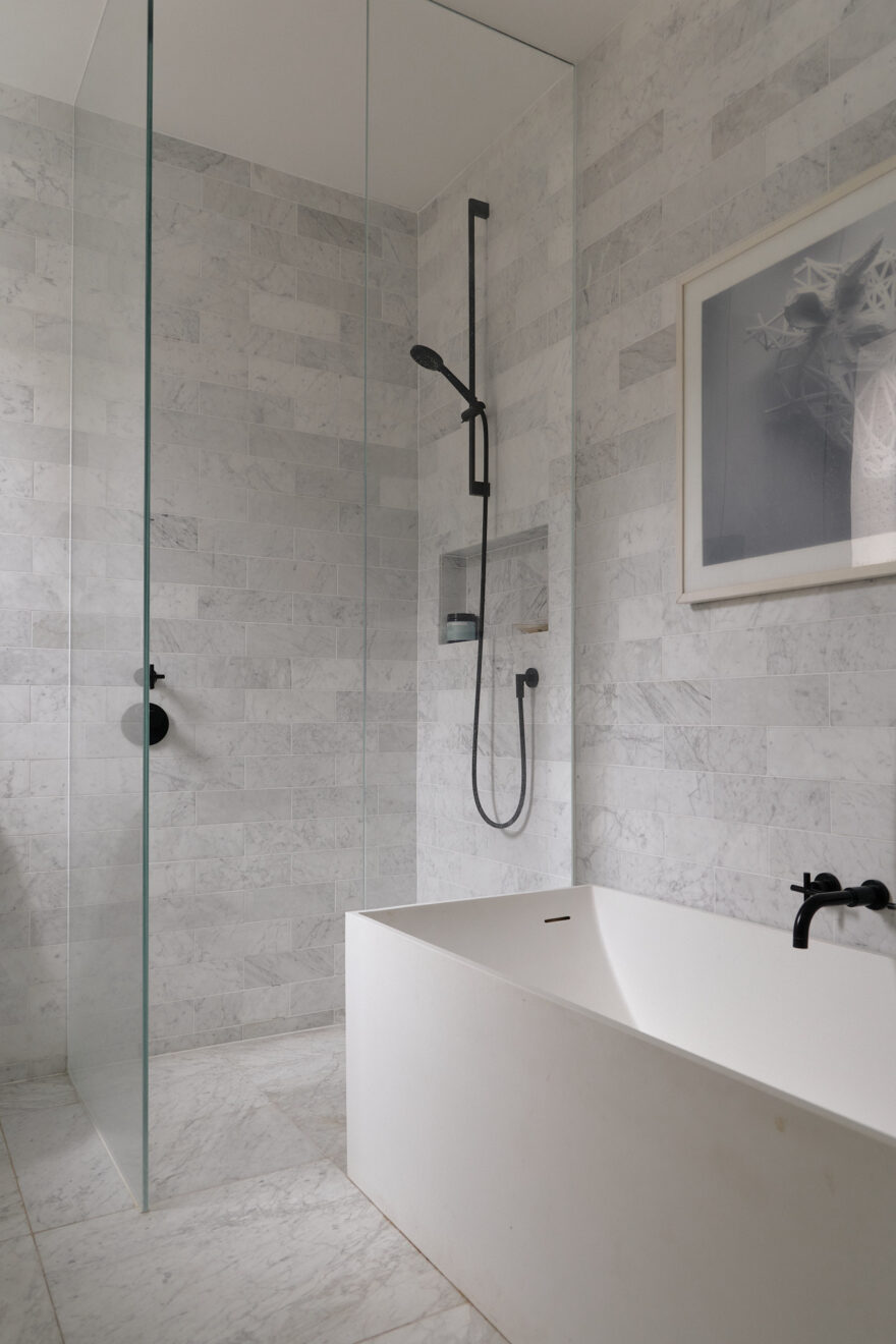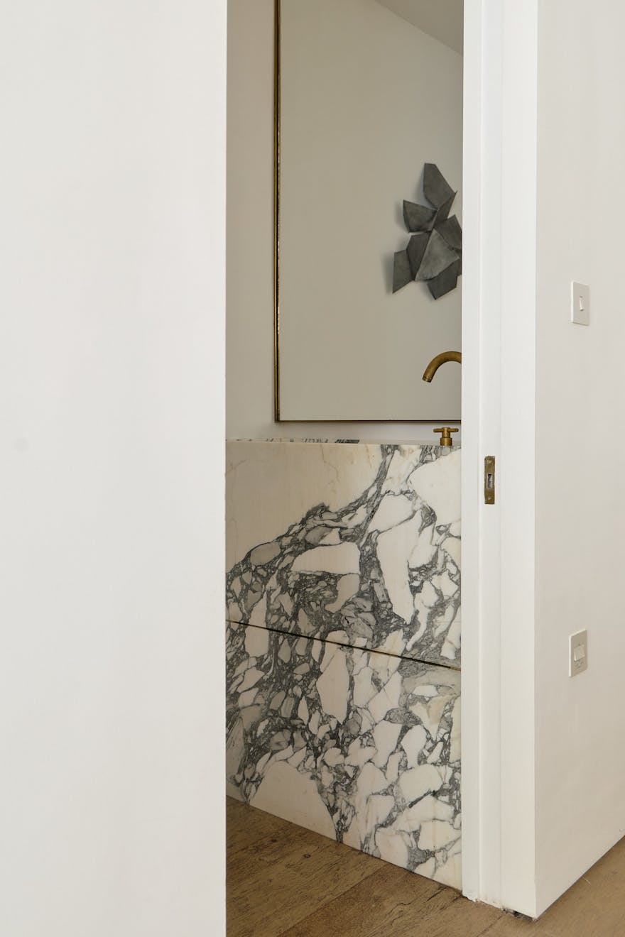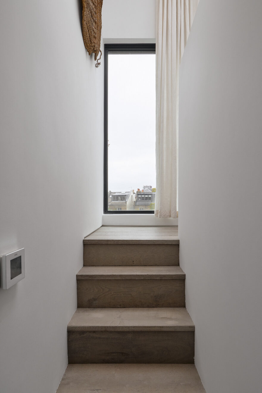 Inside, the first floor is dedicated to the principal suite, where bespoke wardrobe storage is discreetly integrated along one wall, leading into a spacious en suite. Centred around a custom-made marble sink with brass hardware, the bathroom has a Tadelakt lime plaster finish and also features a freestanding bath and a walk-in shower; elements of this refined material palette are echoed across the home’s three further bathrooms.