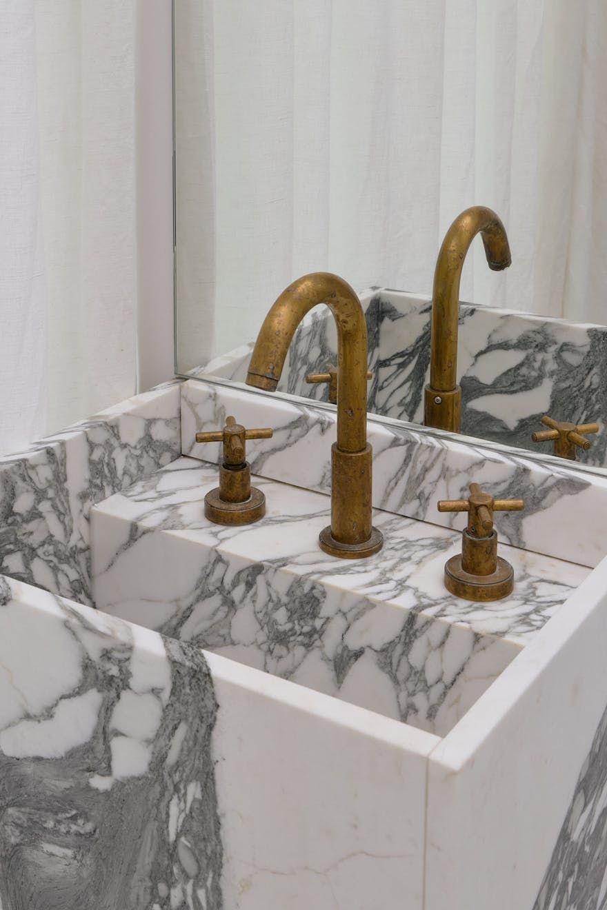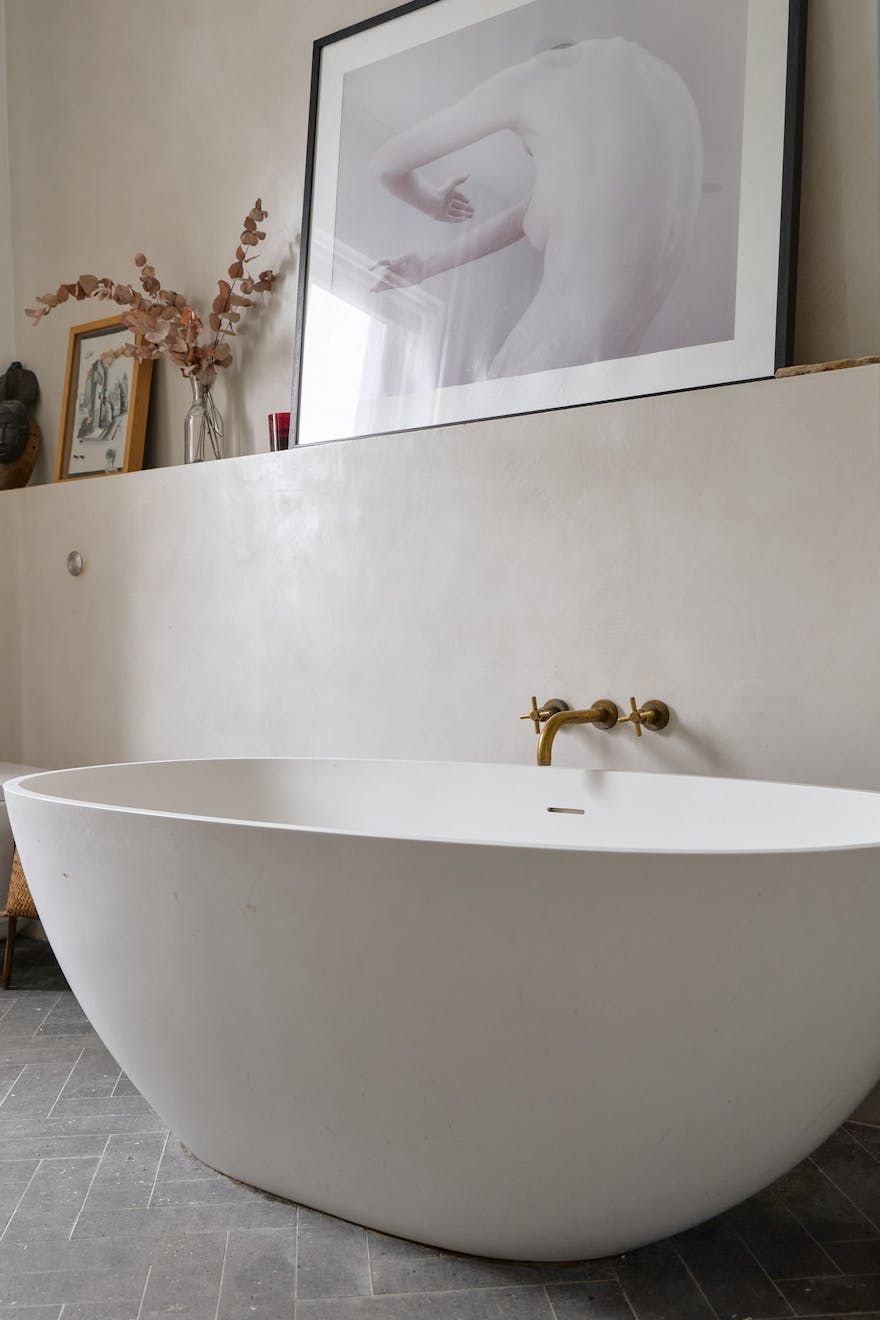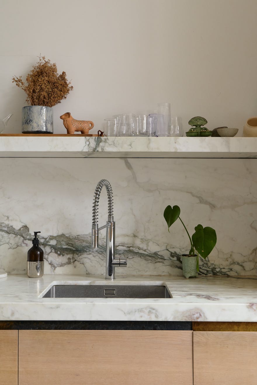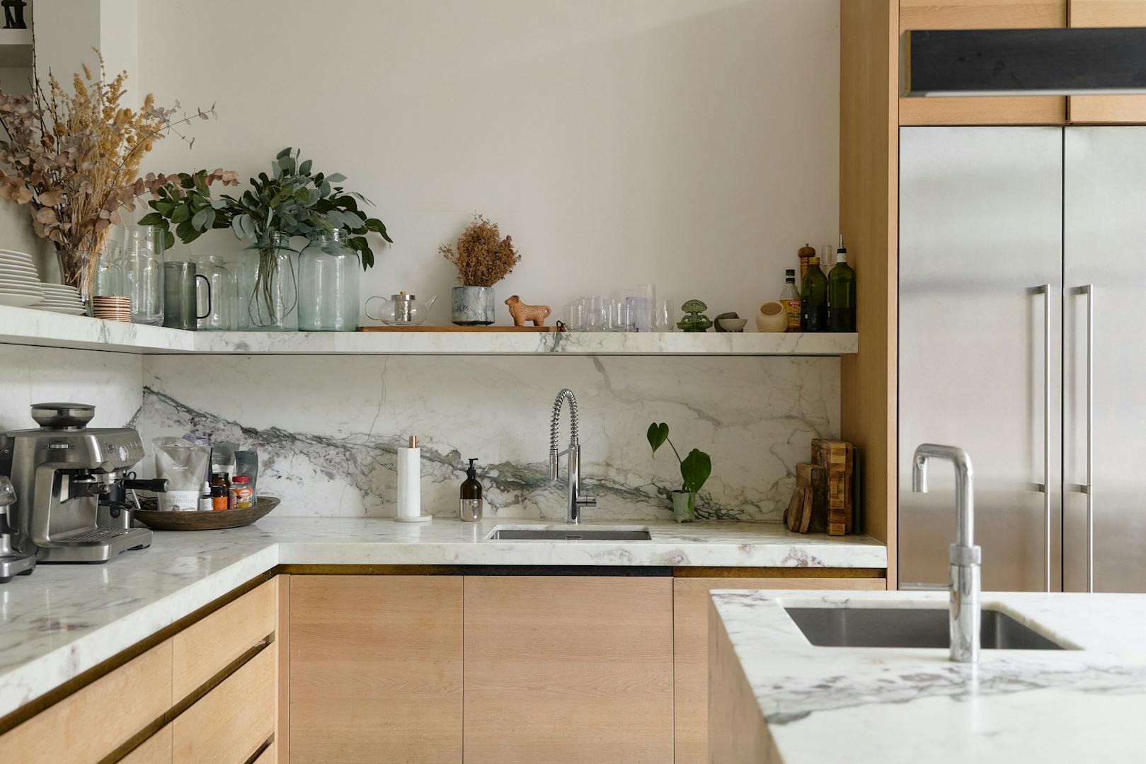 Inside, the first floor is dedicated to the principal suite, where bespoke wardrobe storage is discreetly integrated along one wall, leading into a spacious en suite. Centred around a custom-made marble sink with brass hardware, the bathroom has a Tadelakt lime plaster finish and also features a freestanding bath and a walk-in shower; elements of this refined material palette are echoed across the home’s three further bathrooms.