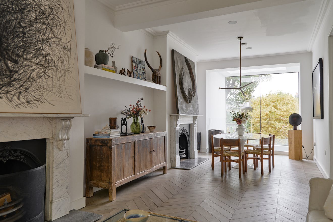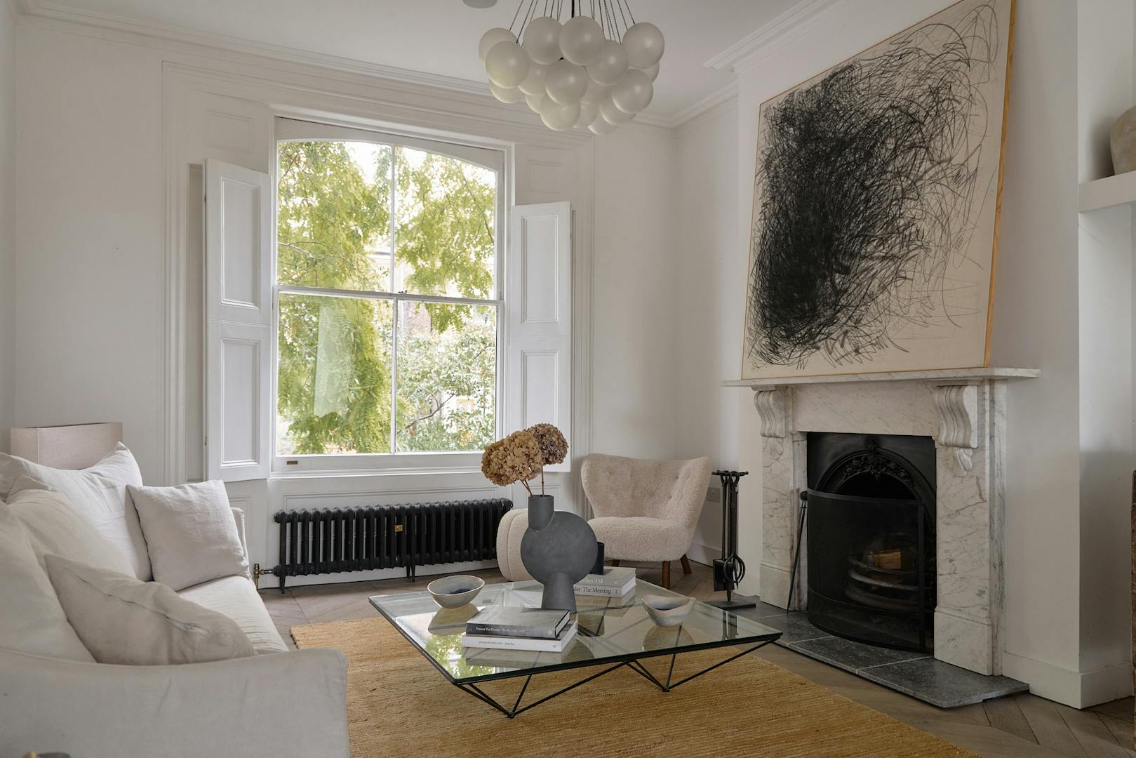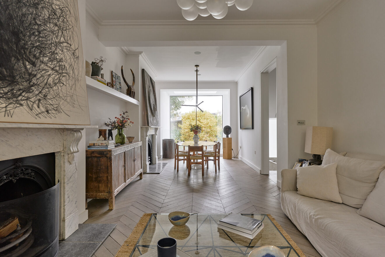 Set back from a tree-lined street, this beautifully reimagined three-bedroom townhouse, with an additional study and a garden studio, has been dramatically transformed by Hackney-based architects, Dedraft. Entry is via a series of classic Portland stone bullnose steps, leading into a hallway laid with herringbone flooring that flows through to two generous reception rooms. Original sash windows welcome easterly light into the space, while robust, working marble fireplaces add warmth and character.