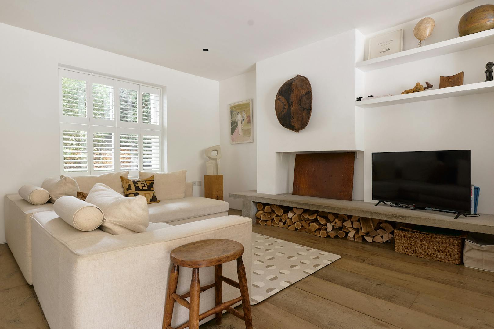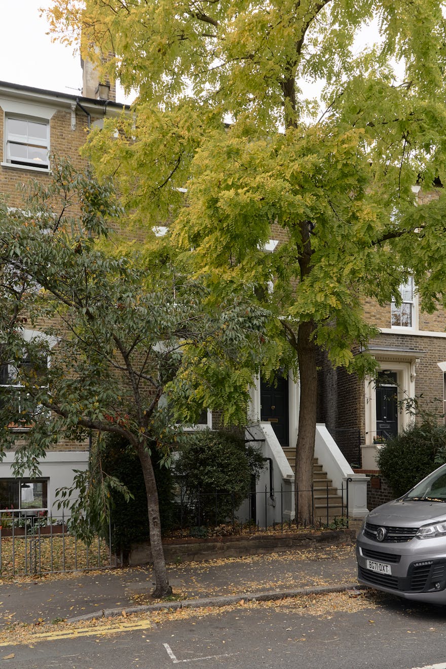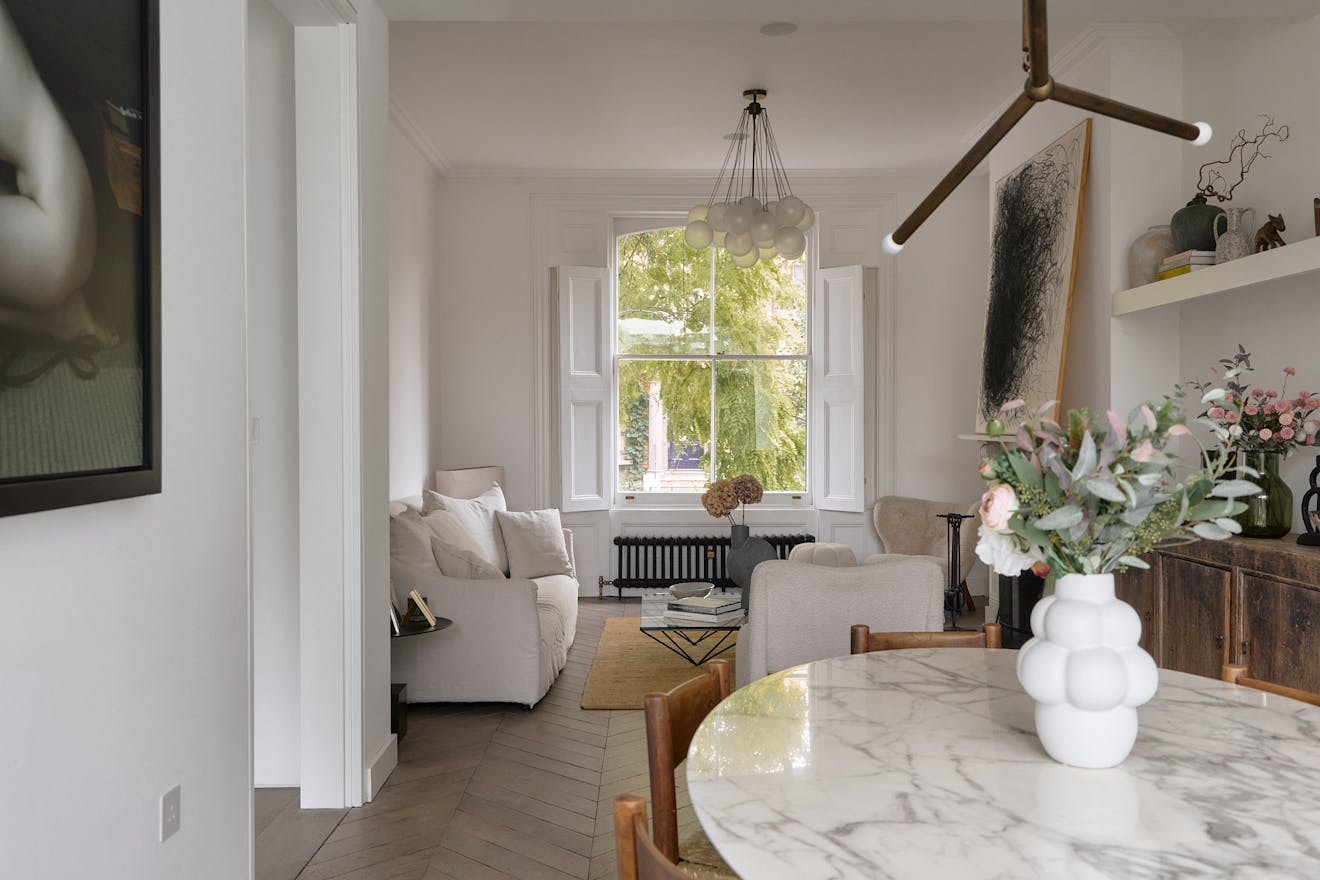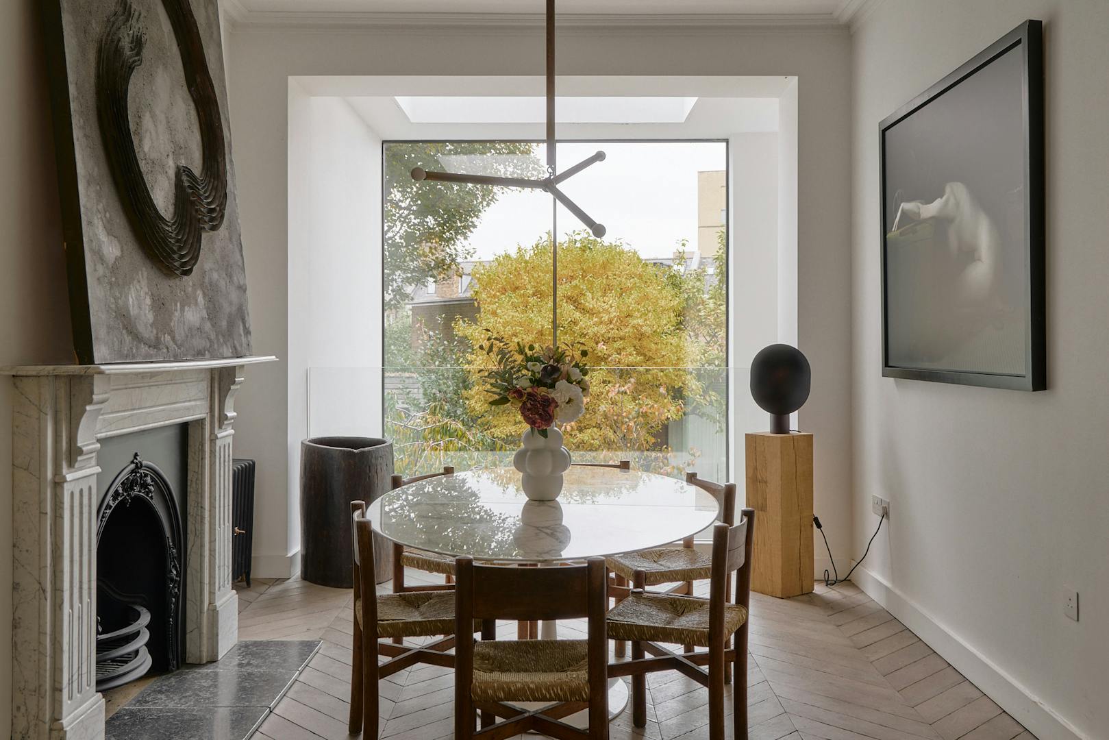 Set back from a tree-lined street, this beautifully reimagined three-bedroom townhouse, with an additional study and a garden studio, has been dramatically transformed by Hackney-based architects, Dedraft. Entry is via a series of classic Portland stone bullnose steps, leading into a hallway laid with herringbone flooring that flows through to two generous reception rooms. Original sash windows welcome easterly light into the space, while robust, working marble fireplaces add warmth and character.