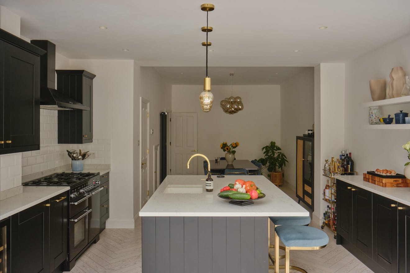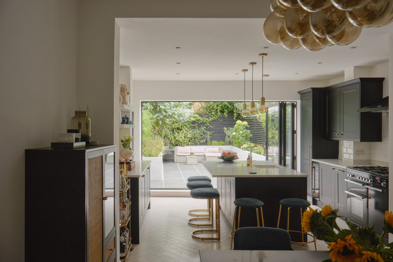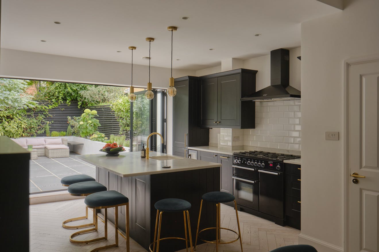 To the rear, the house opens into an extended kitchen and dining area; a generous, light-filled space designed with hosting and daily life in mind. The rich charcoal kitchen is anchored by a central island that has room for seating, where pendant lights gently drop overhead, casting a warm, ambient glow. The sleek light Quartz worktops add a subtle contrast and tactile warmth. Bi-folding doors provide a strong visual connection to the south-facing garden, drawing the eye outward and creating a seamless transition between interior and exterior.