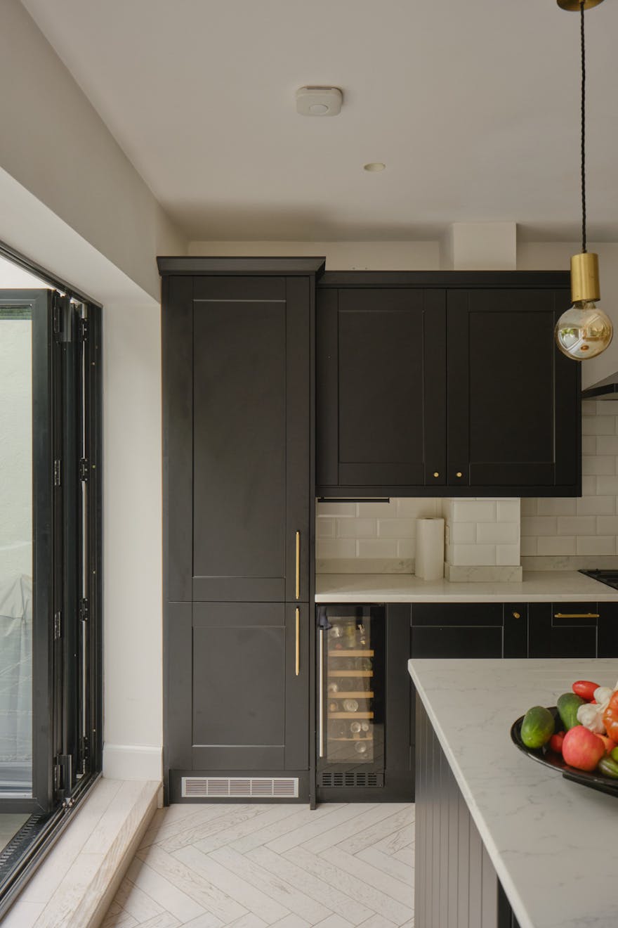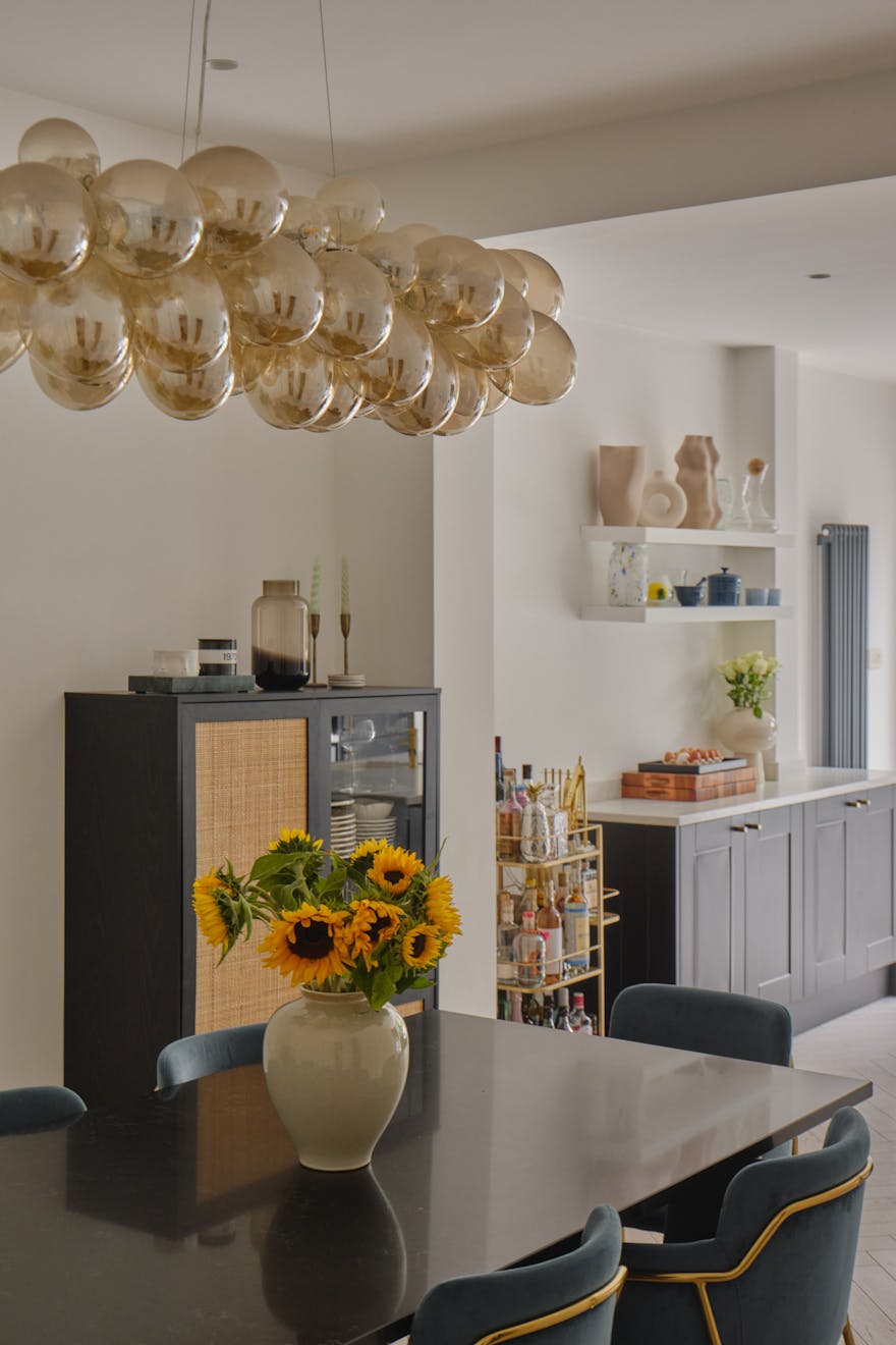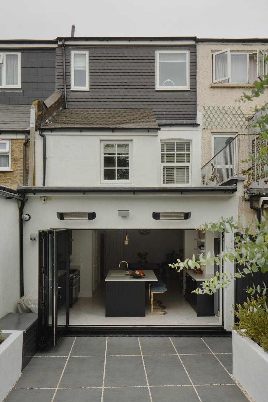 To the rear, the house opens into an extended kitchen and dining area; a generous, light-filled space designed with hosting and daily life in mind. The rich charcoal kitchen is anchored by a central island that has room for seating, where pendant lights gently drop overhead, casting a warm, ambient glow. The sleek light Quartz worktops add a subtle contrast and tactile warmth. Bi-folding doors provide a strong visual connection to the south-facing garden, drawing the eye outward and creating a seamless transition between interior and exterior.