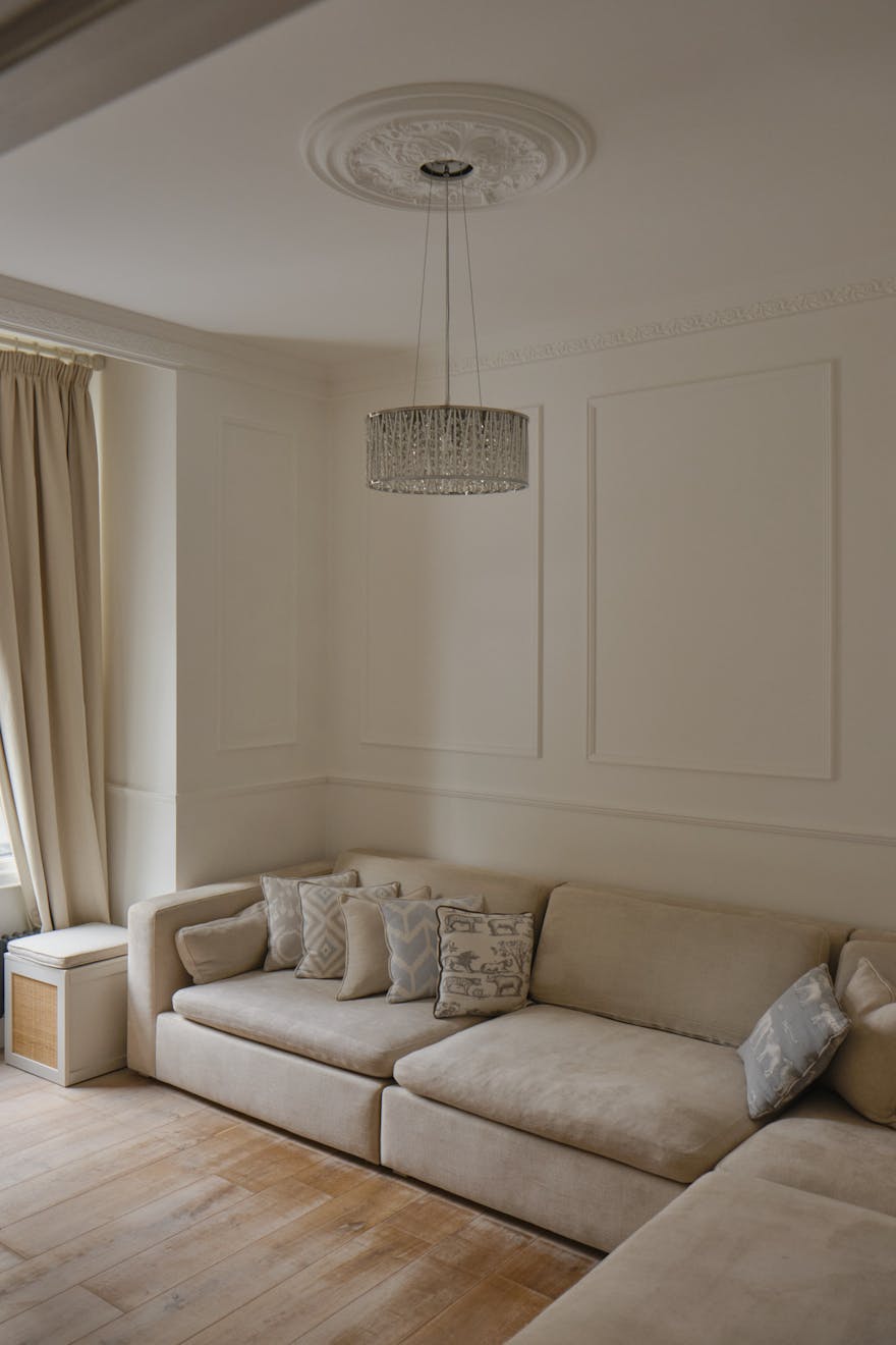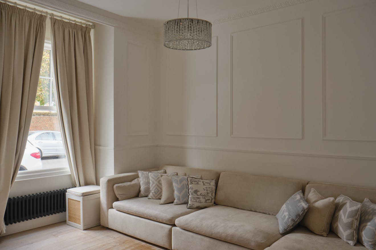 Entrance to the home is set back from the road, with the soft grey façade punctuated by the white sash windows. Inside, the ground floor has a separate cosy living room complete with soaring ceilings, a bay window and elegant panelling. Warm wooden floors and a soothing neutral palette create the perfect retreat for quiet evenings.
