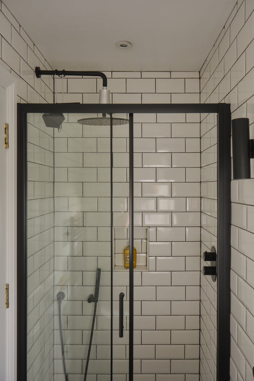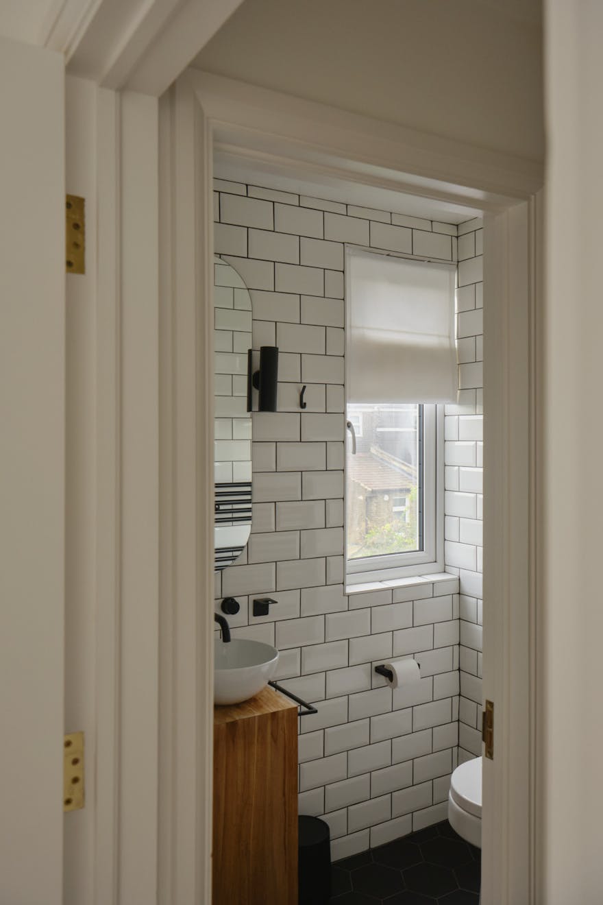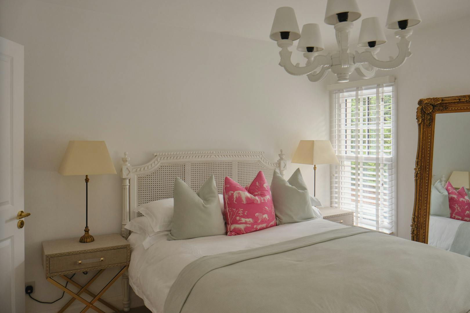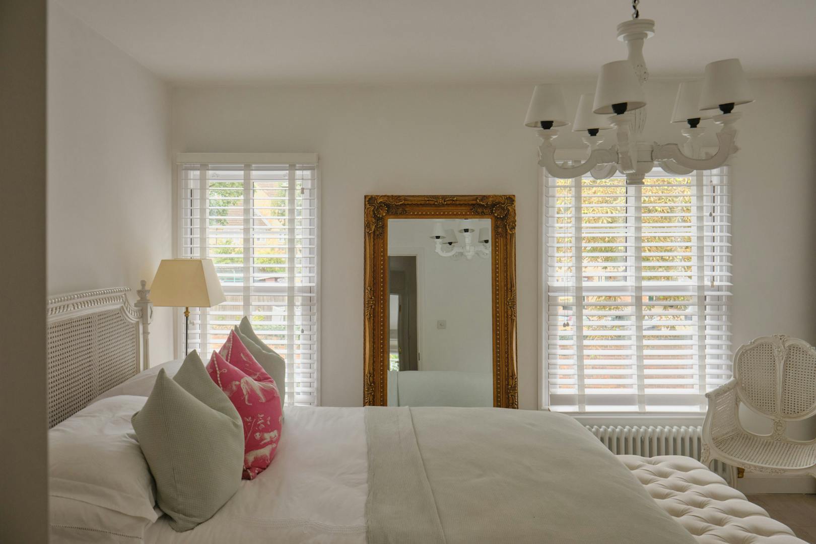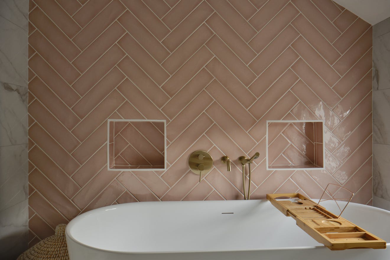 Upstairs, the first floor is home to two generously proportioned double bedrooms, thoughtfully positioned alongside a beautifully appointed family bathroom. Here, the freestanding bath takes centre stage, accompanied by a dual vanity and a separate walk-in shower. Blush-toned herringbone tiles, brass fixtures and carefully chosen wall lights bring a sense of sophistication to the space.