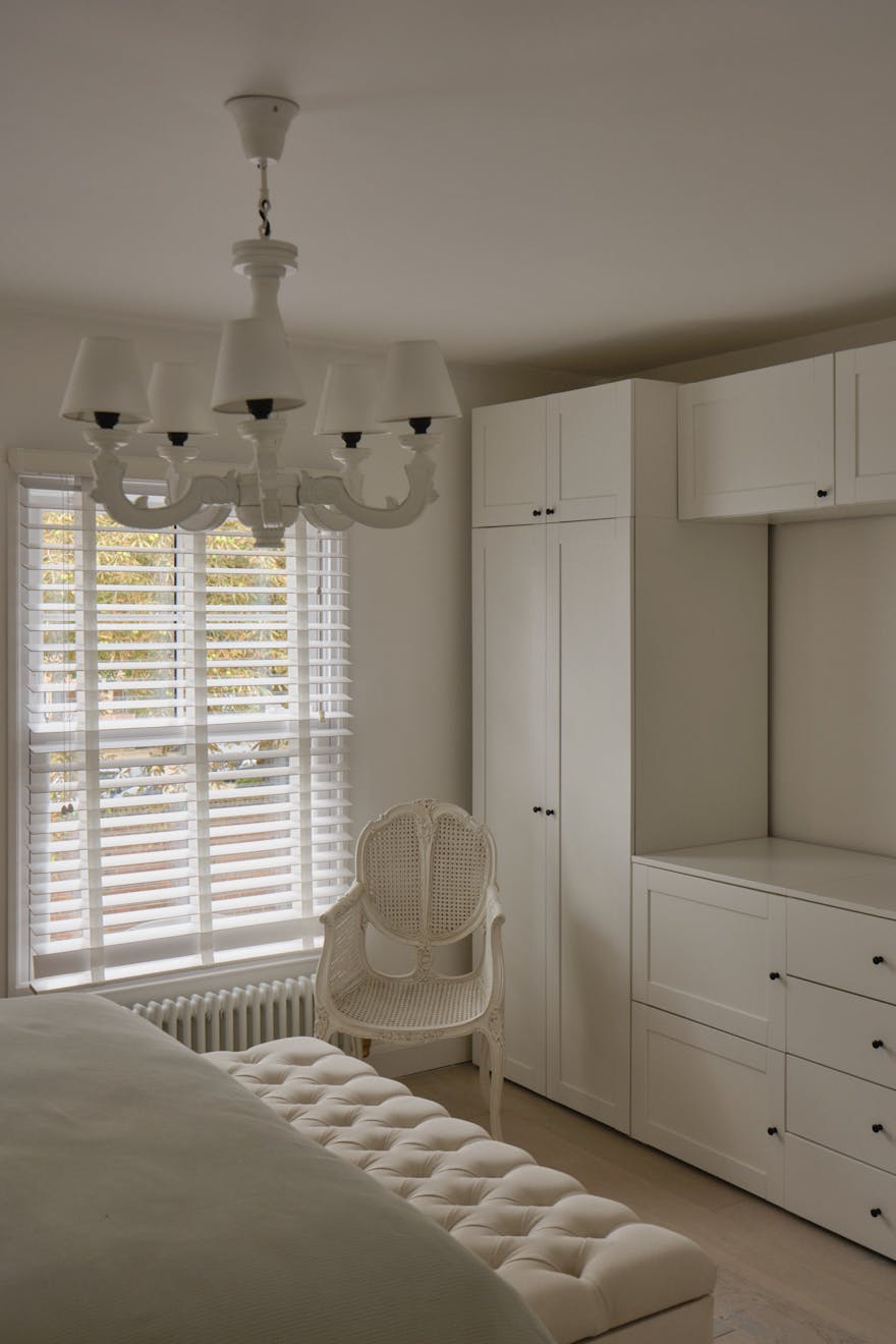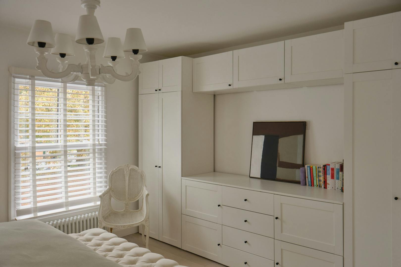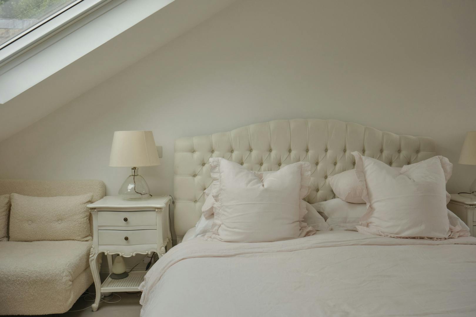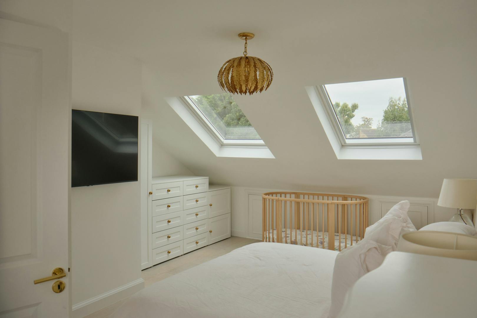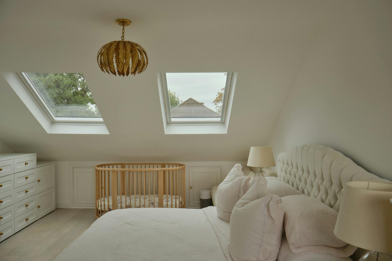 The top floor is home to the principal bedroom and its own en suite. Vaulted ceilings and carefully positioned skylights introduce light from above, while built-in eaves storage ensures the space remains uncluttered and versatile.