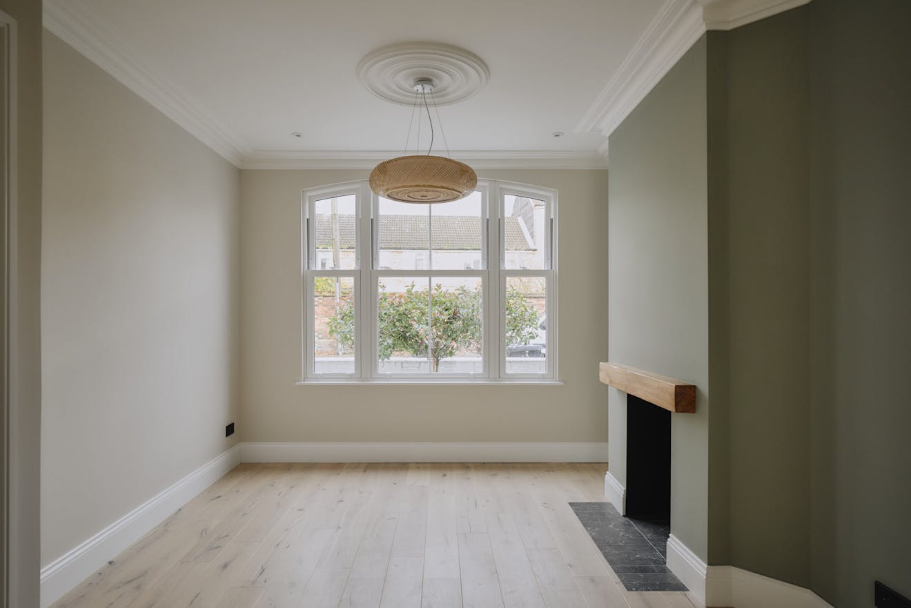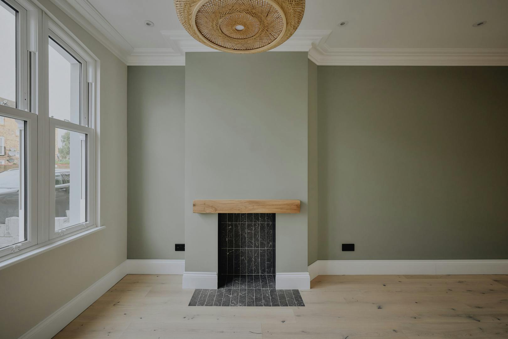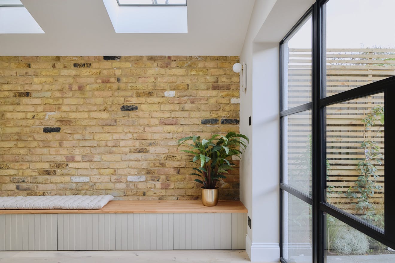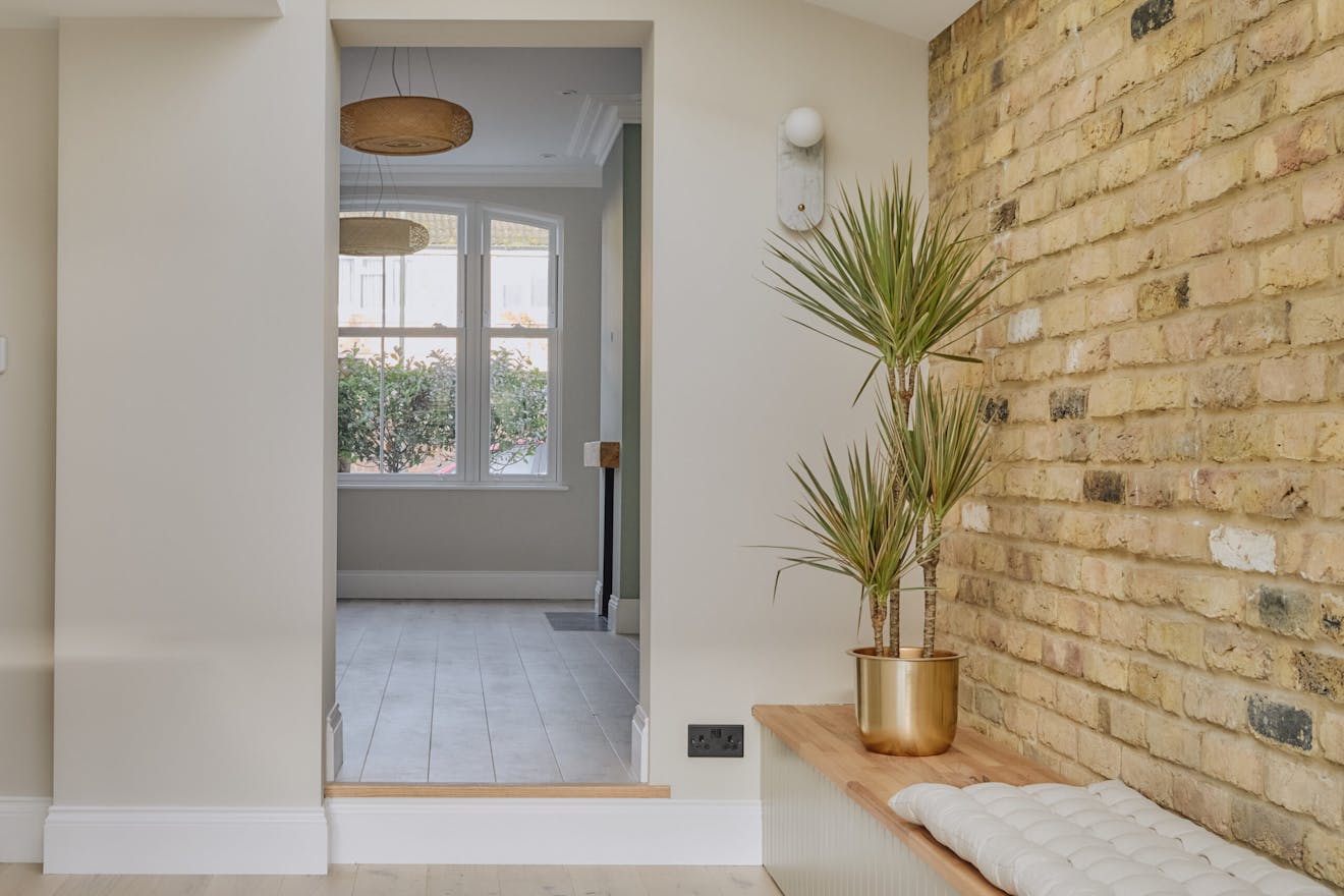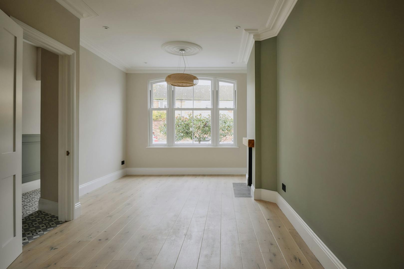The ground floor offers a cosy double reception room with high ceilings and curved architectural windows that flood the space with natural light. This space flows seamlessly into an extended kitchen, which also has secondary access from the hallway. The kitchen is a blend of Victorian heritage and contemporary design, featuring an exposed London stock brick wall, a shaker-style kitchen, and sleek aluminium Crittall doors. A bespoke fluted bench seating area doubles as smart storage, offering a practical yet stylish solution for hosting. Thoughtfully placed lighting fittings enhance the calming atmosphere, making it ideal for intimate dinners or larger gatherings.