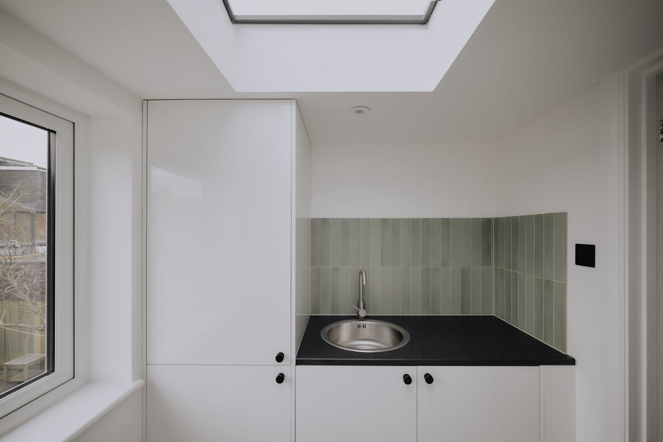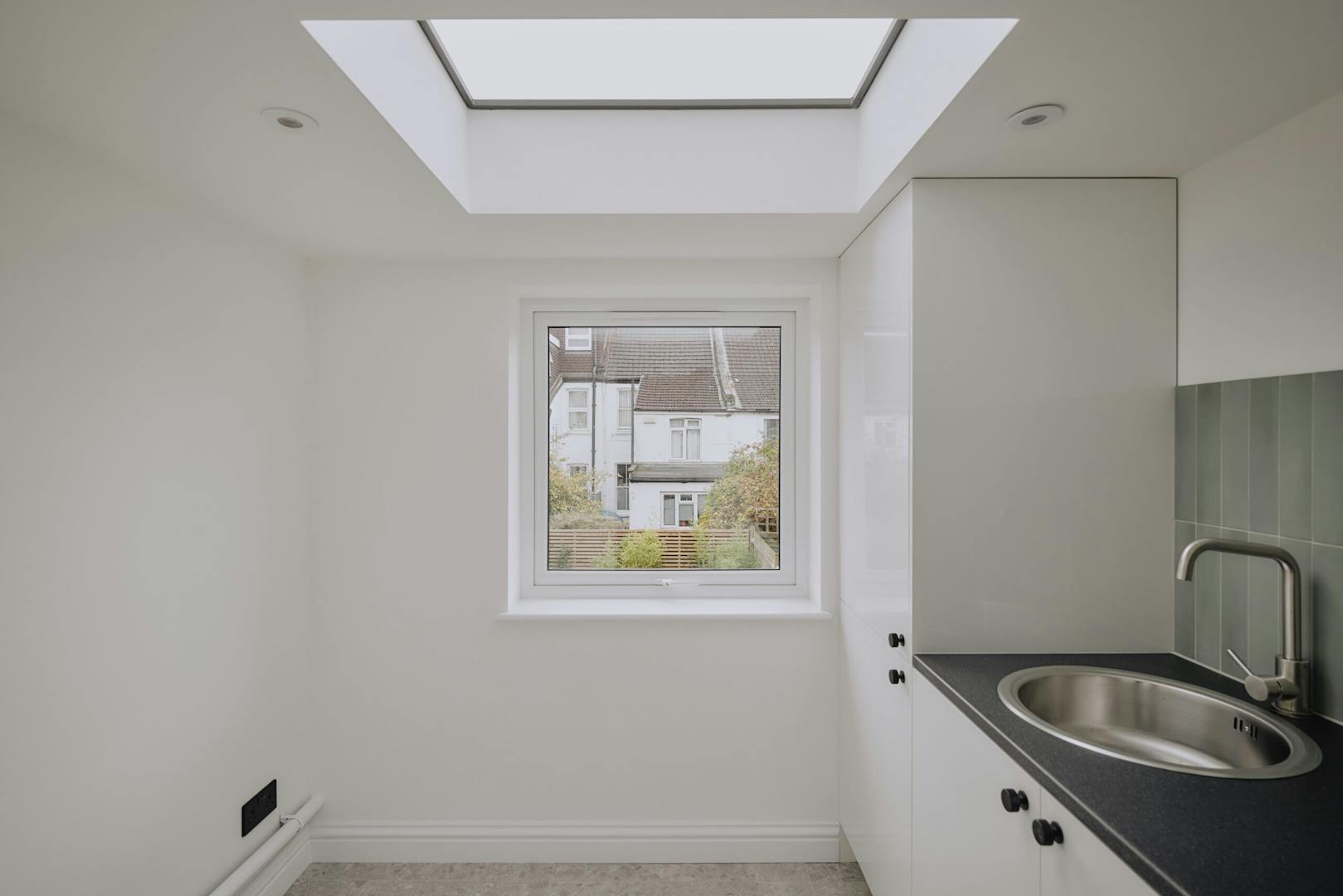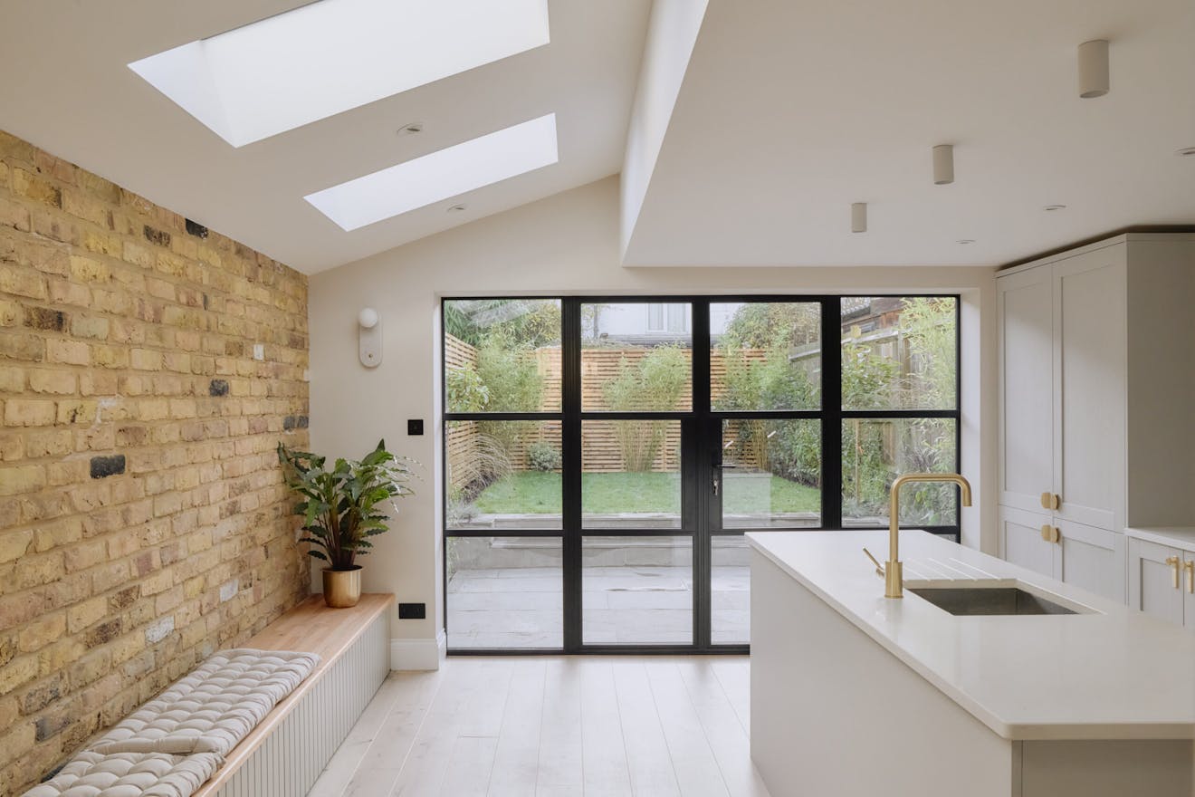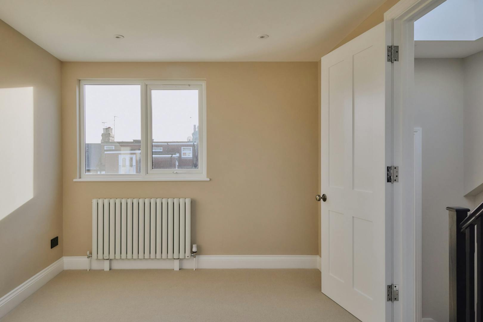 The ground floor offers a cosy double reception room with high ceilings and curved architectural windows that flood the space with natural light. This space flows seamlessly into an extended kitchen, which also has secondary access from the hallway. The kitchen is a blend of Victorian heritage and contemporary design, featuring an exposed London stock brick wall, a shaker-style kitchen, and sleek aluminium Crittall doors. A bespoke fluted bench seating area doubles as smart storage, offering a practical yet stylish solution for hosting. Thoughtfully placed lighting fittings enhance the calming atmosphere, making it ideal for intimate dinners or larger gatherings.