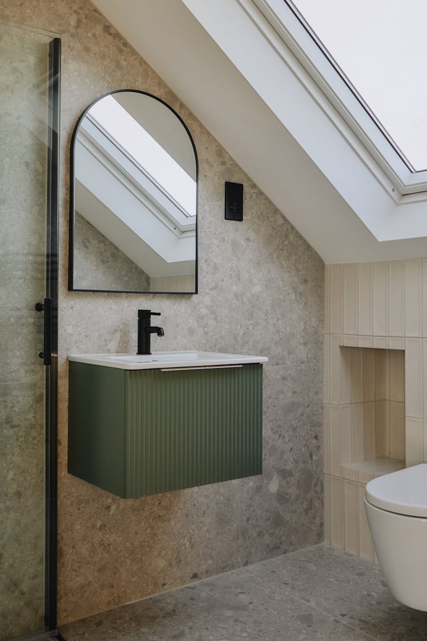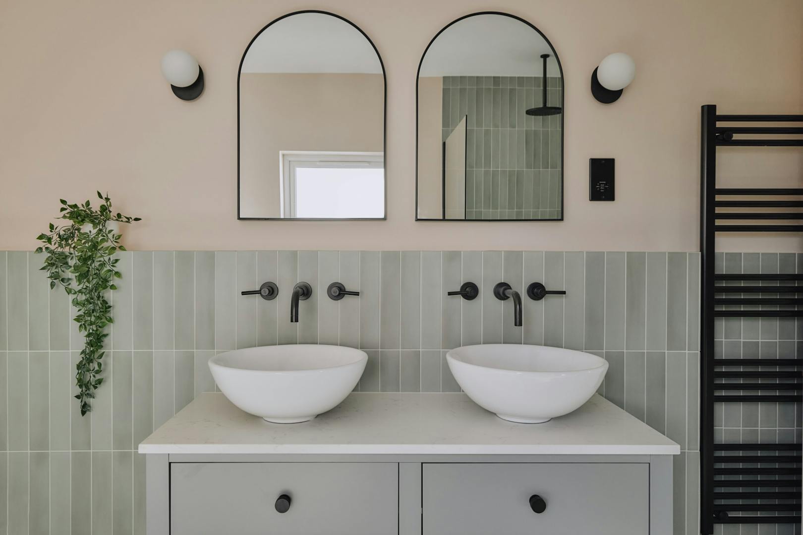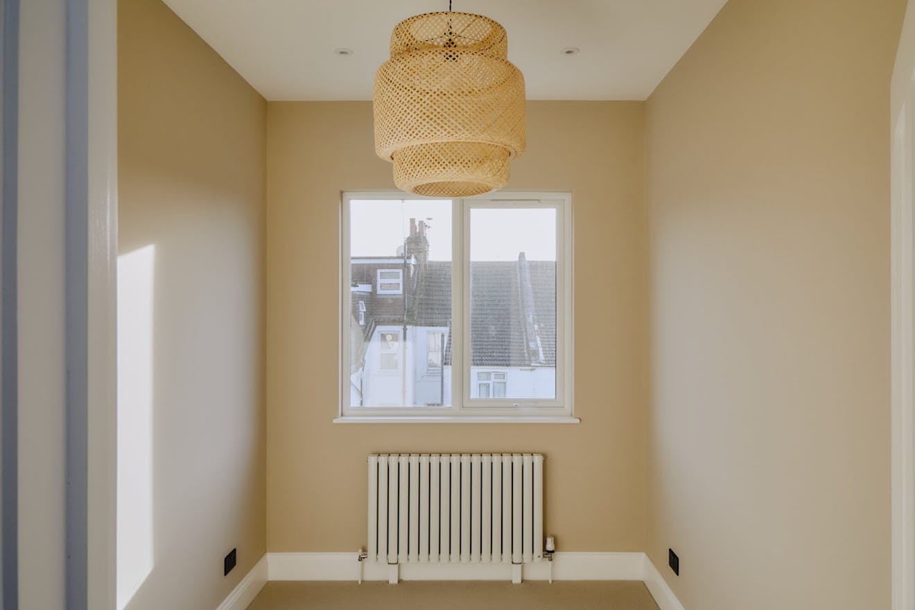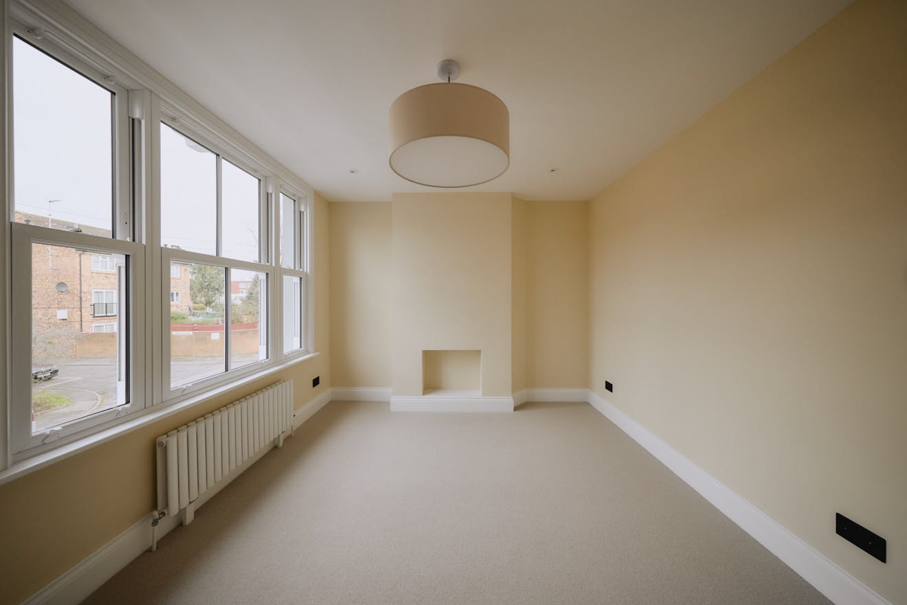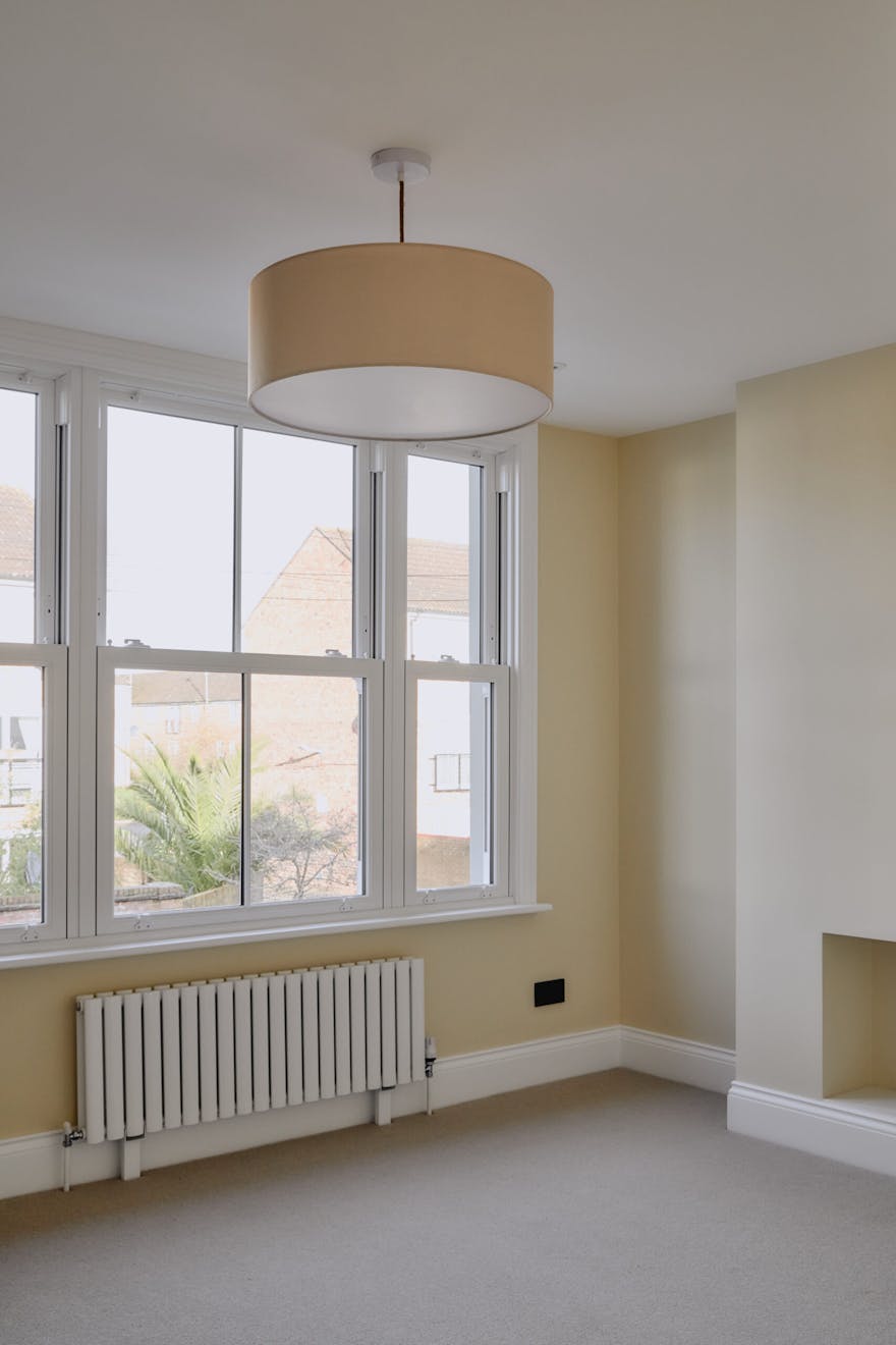 The ground floor offers a cosy double reception room with high ceilings and curved architectural windows that flood the space with natural light. This space flows seamlessly into an extended kitchen, which also has secondary access from the hallway. The kitchen is a blend of Victorian heritage and contemporary design, featuring an exposed London stock brick wall, a shaker-style kitchen, and sleek aluminium Crittall doors. A bespoke fluted bench seating area doubles as smart storage, offering a practical yet stylish solution for hosting. Thoughtfully placed lighting fittings enhance the calming atmosphere, making it ideal for intimate dinners or larger gatherings.