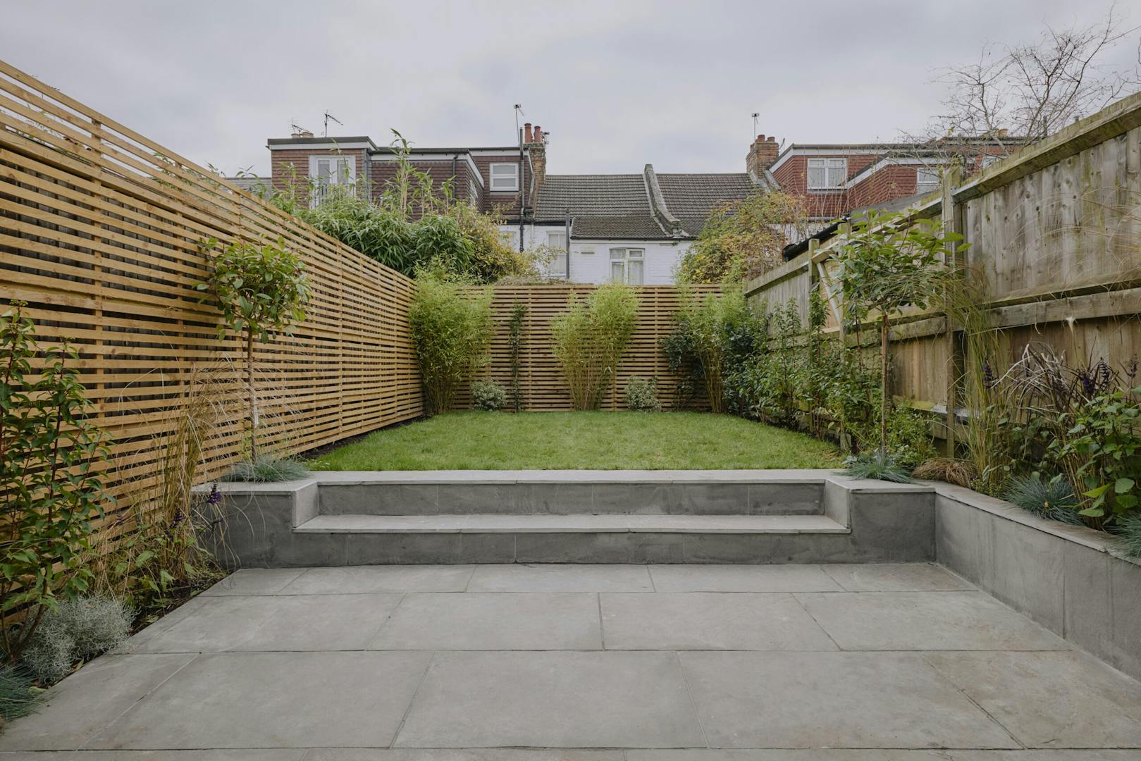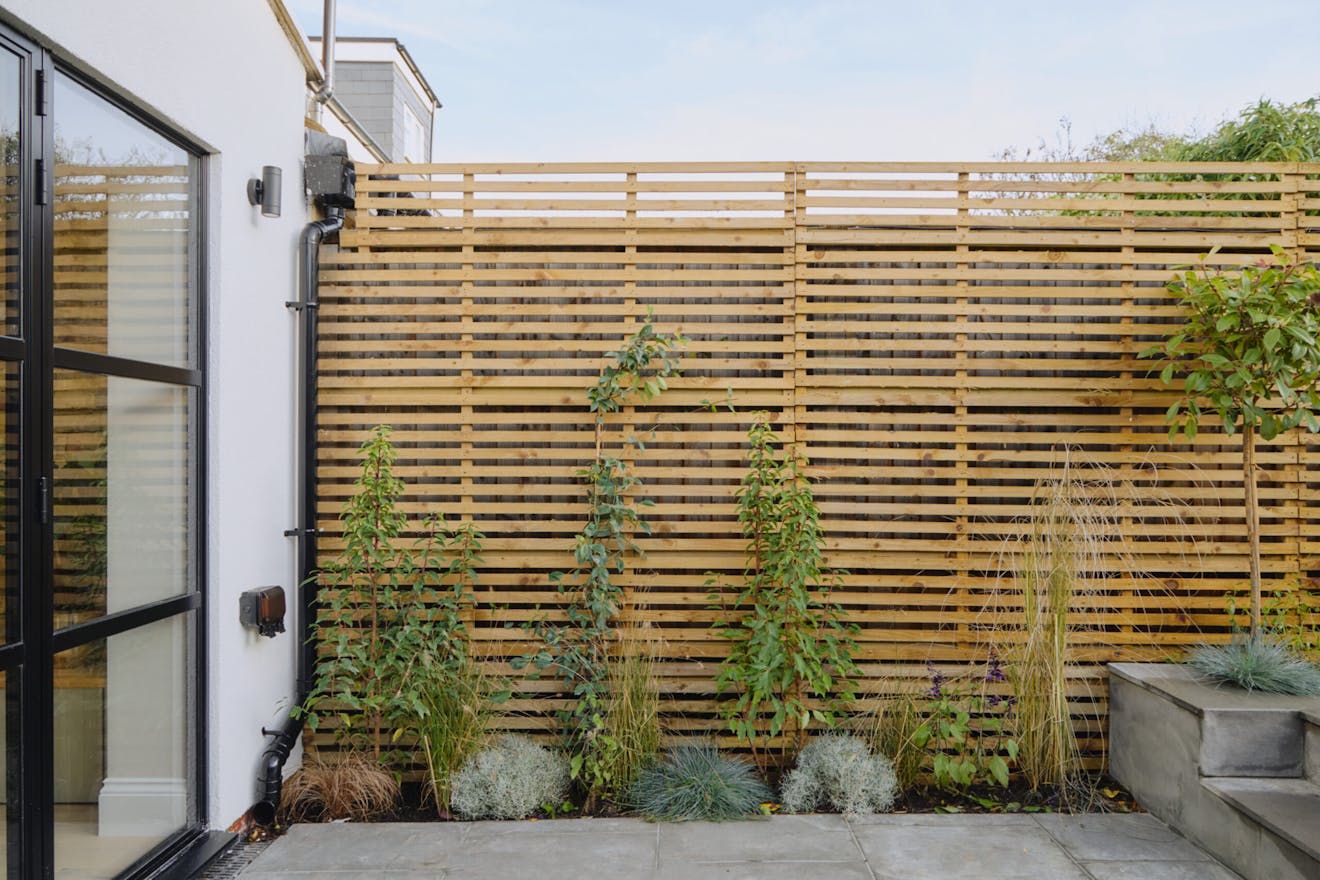 The southerly-facing garden finds the perfect balance between style and practicality, catering to both green-fingered enthusiasts and those seeking low-maintenance outdoor living. Contemporary outdoor tiles seamlessly extend the inside-outside connection, while thoughtfully placed planting around the patio softens the overall aesthetic. Batten fencing ensures privacy from neighbouring gardens, and a stepped transition defines the well-kept lawn area.