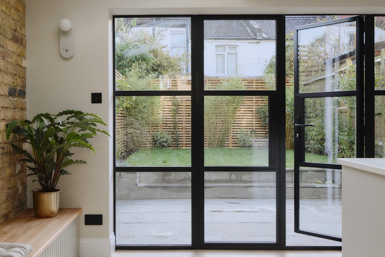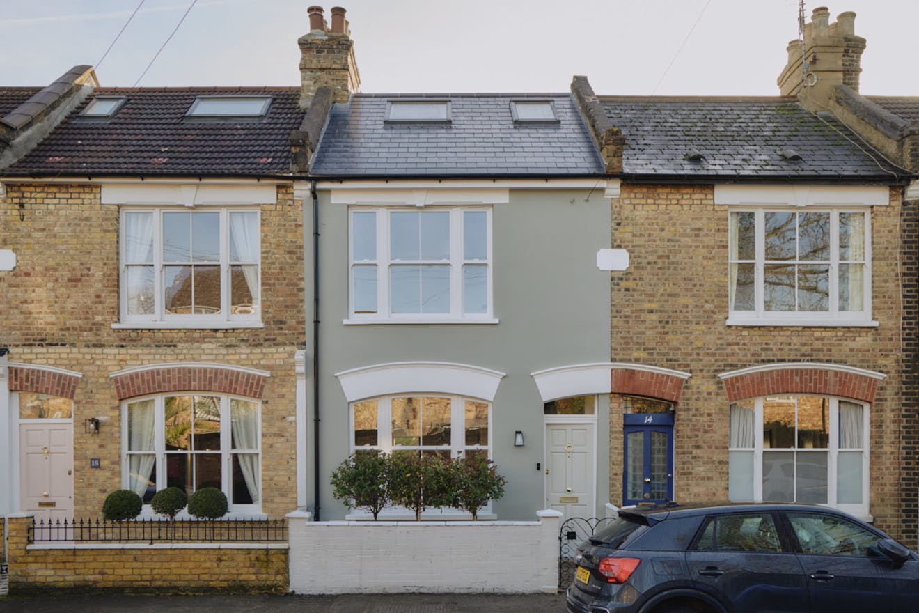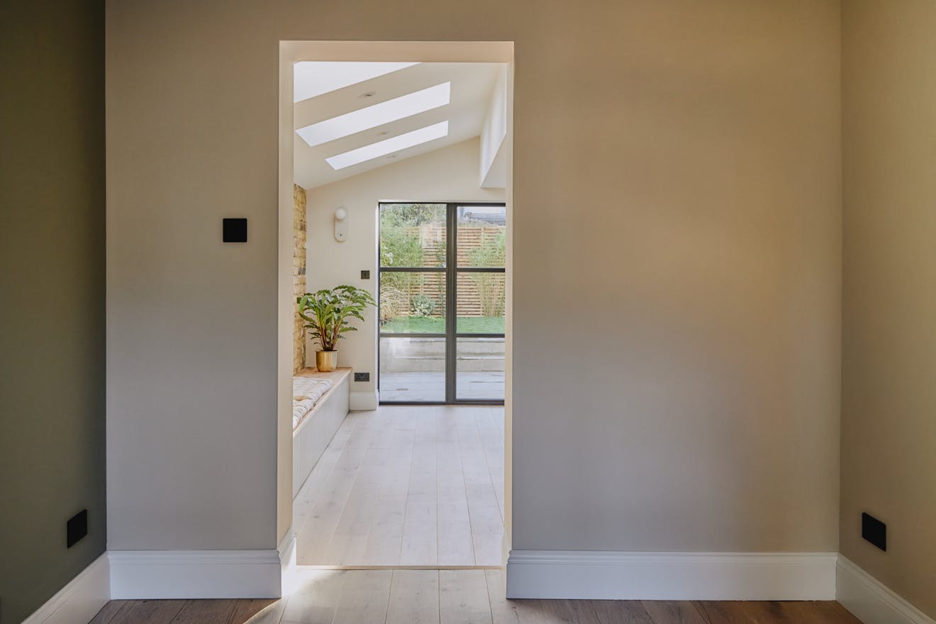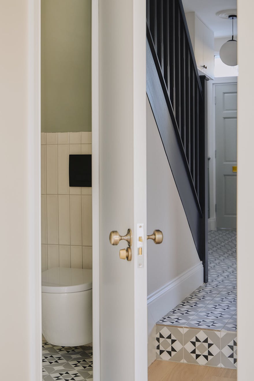 Set back from the pavement, the house is discreetly tucked behind three newly planted shrubs. A black-and-white chequered pathway leads to the front entrance, creating a charming first impression. As you step inside, you're immediately greeted by a sense of warmth, with a glimpse of striking Crittall-style doors setting the tone for the interior design.