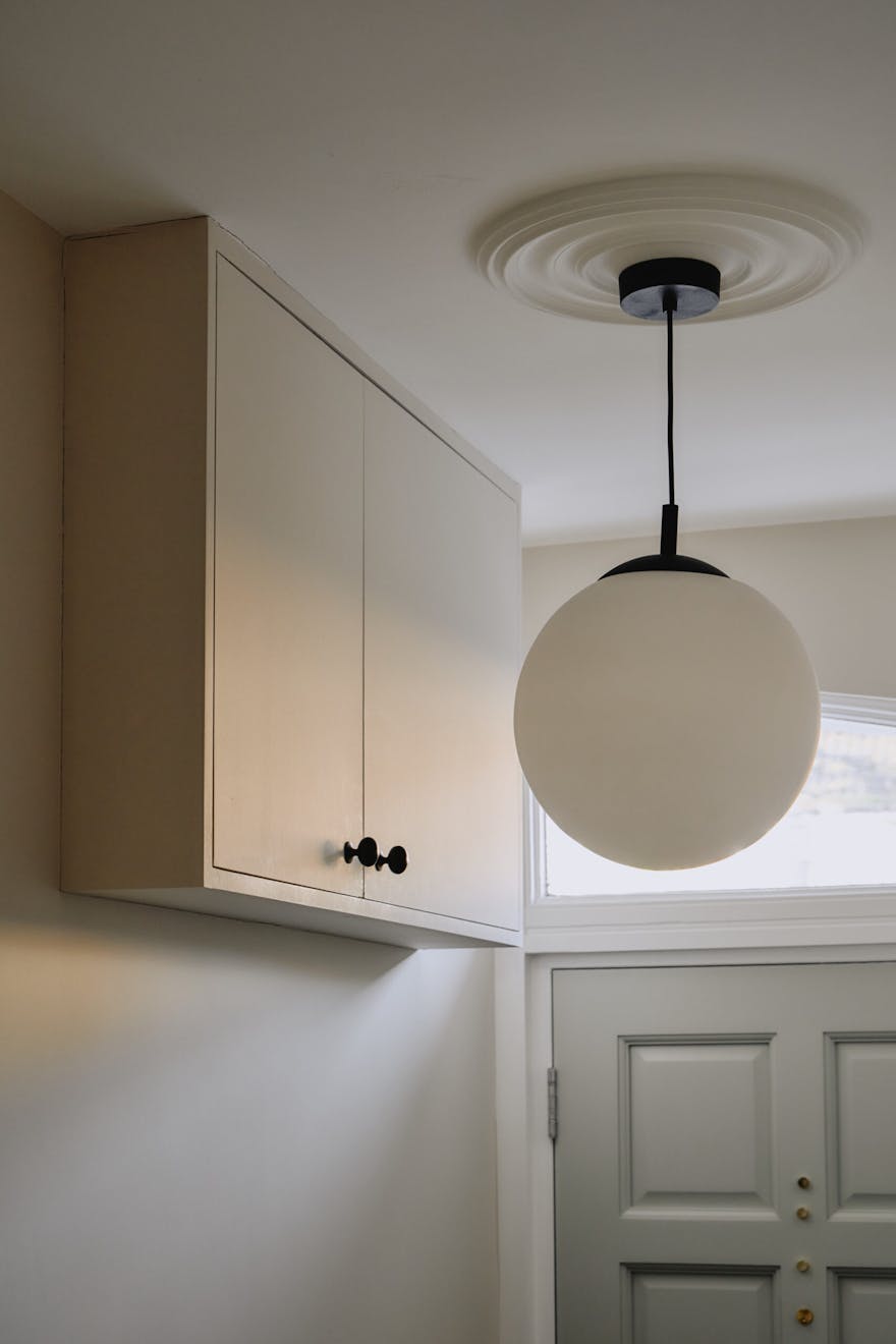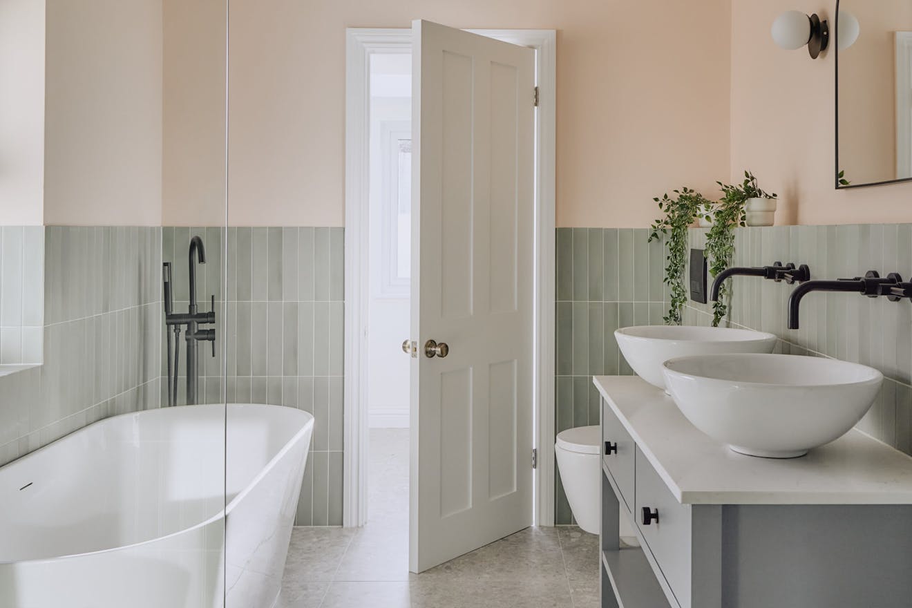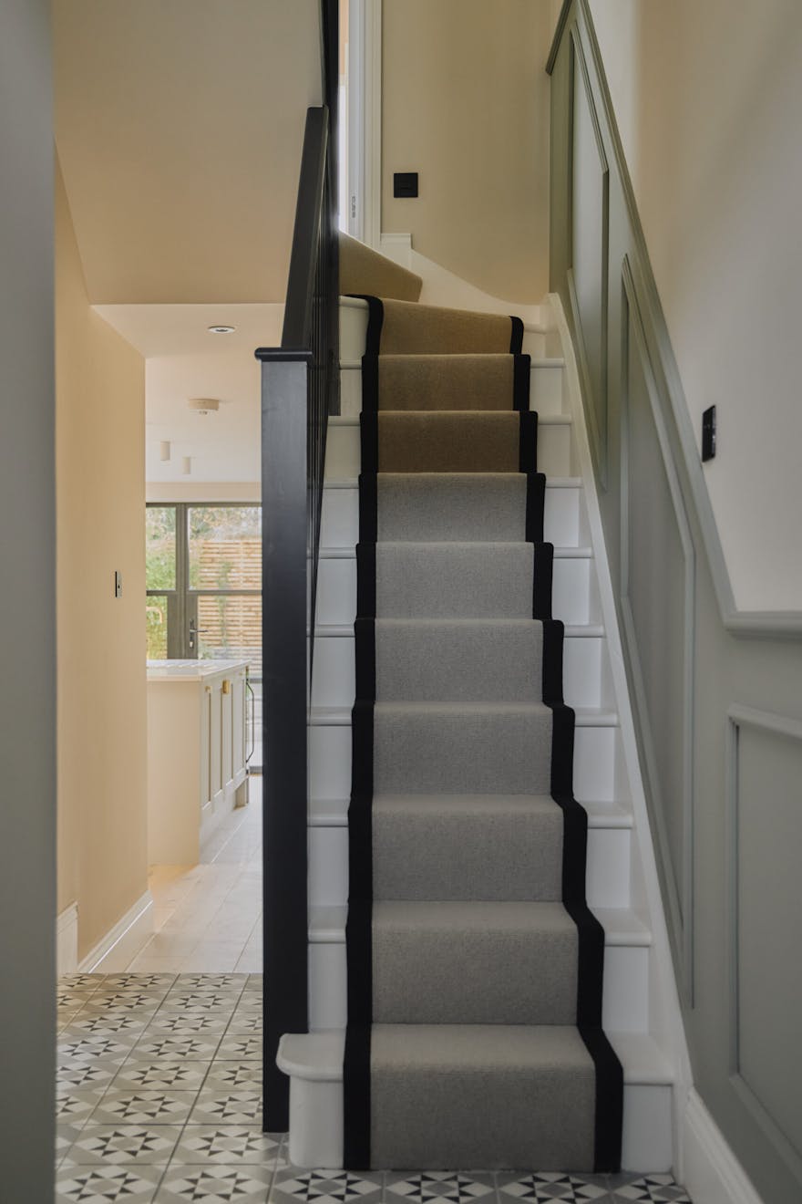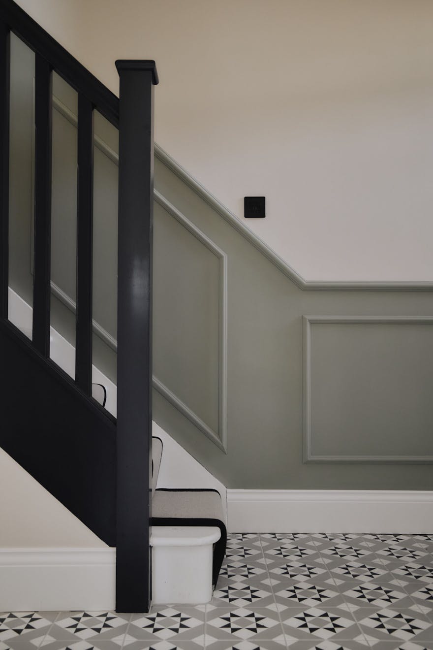 Set back from the pavement, the house is discreetly tucked behind three newly planted shrubs. A black-and-white chequered pathway leads to the front entrance, creating a charming first impression. As you step inside, you're immediately greeted by a sense of warmth, with a glimpse of striking Crittall-style doors setting the tone for the interior design.