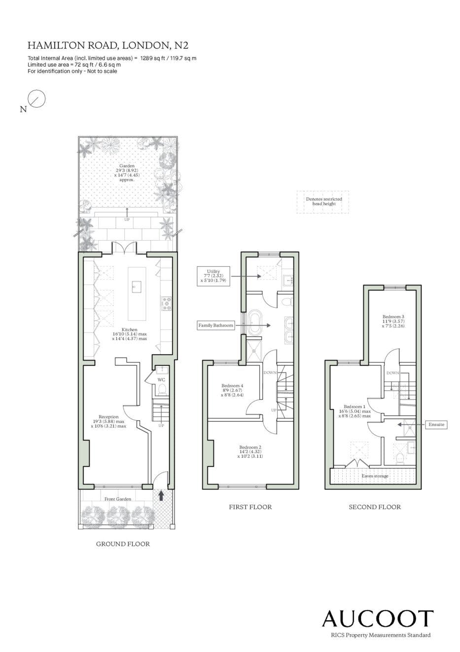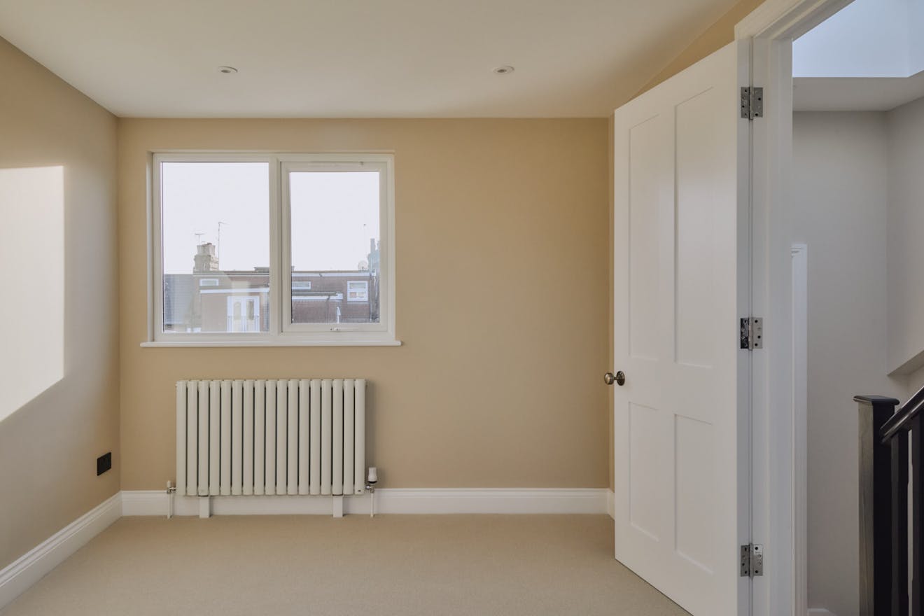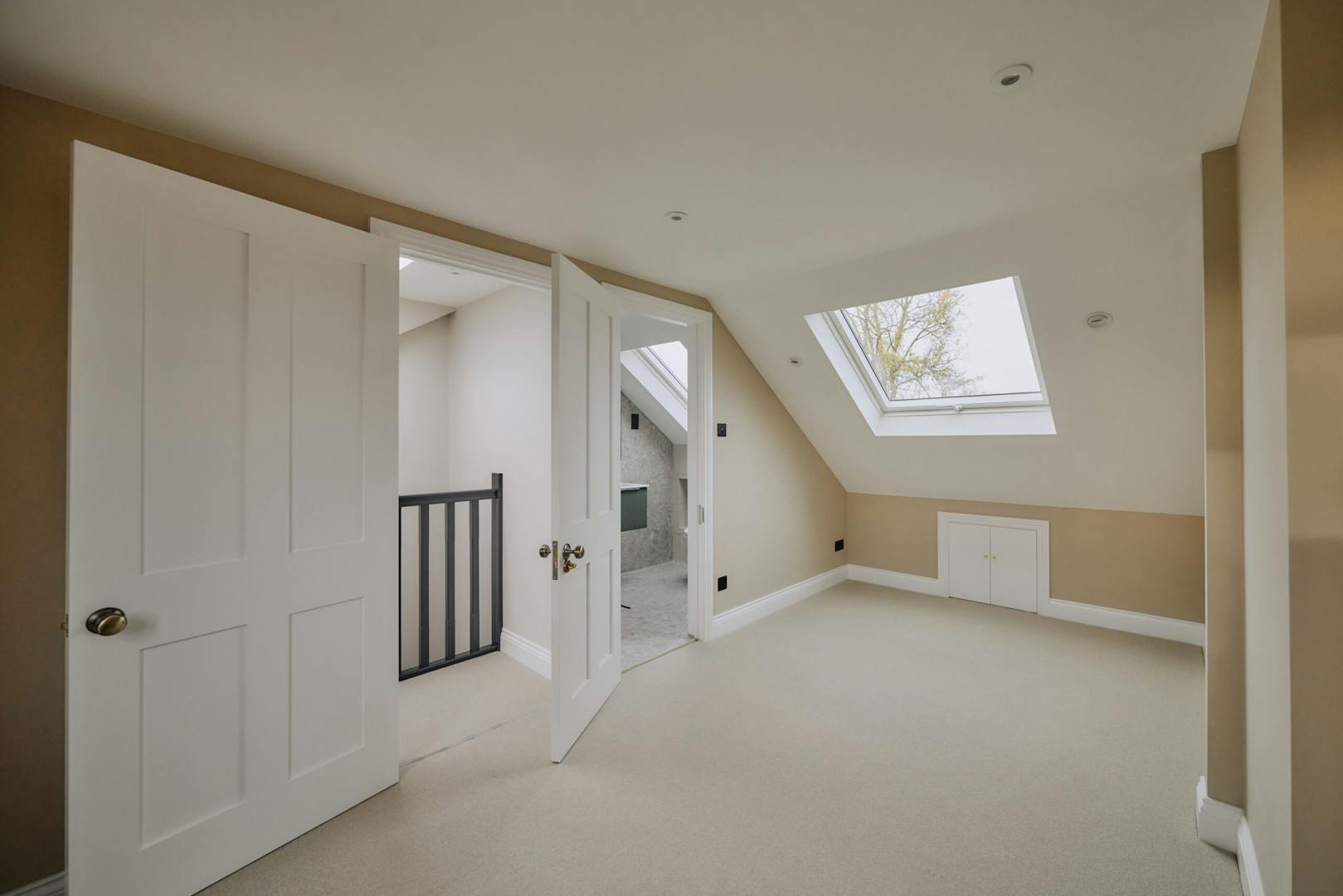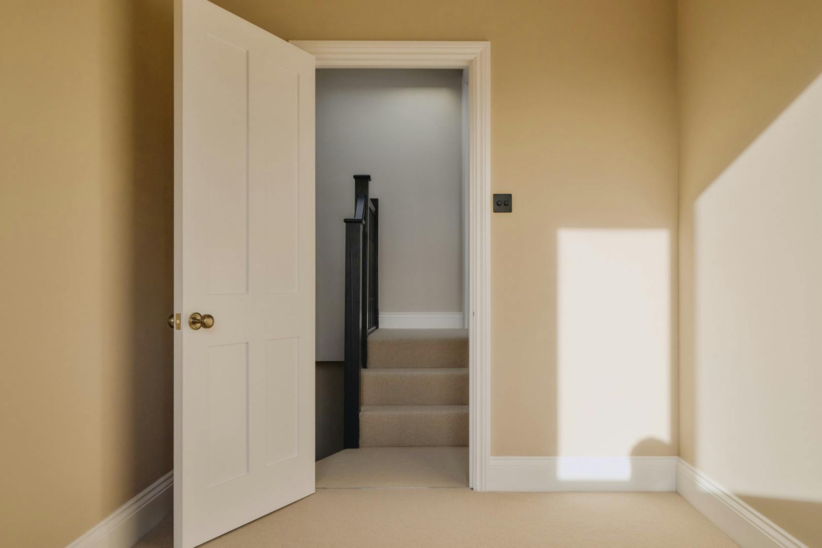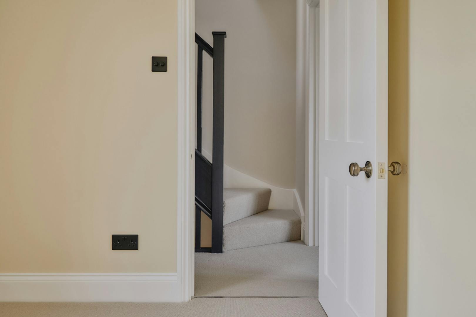 Two spacious double bedrooms are positioned on the first floor, with two further bedrooms on the upper floor. The top-floor bedroom also offers a modern en suite bathroom and eaves storage. The second bedroom on this floor boasts a generous 2.7-metre ceiling height and enjoys beautiful views across the gardens.