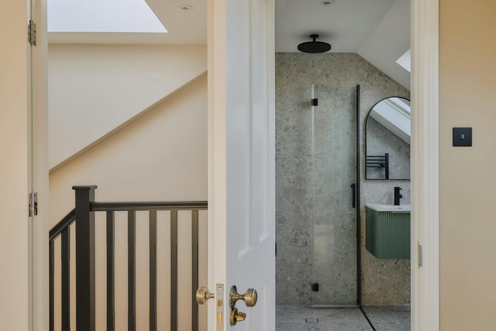 Ascending the newly widened staircase, you'll find a generous family bathroom with a walk-in shower, freestanding bath, floor-mounted bath filler, and double vanity unit with dual sinks. Further to the bathroom, there's a utility room with a sink and plumbing for a washer and dryer.