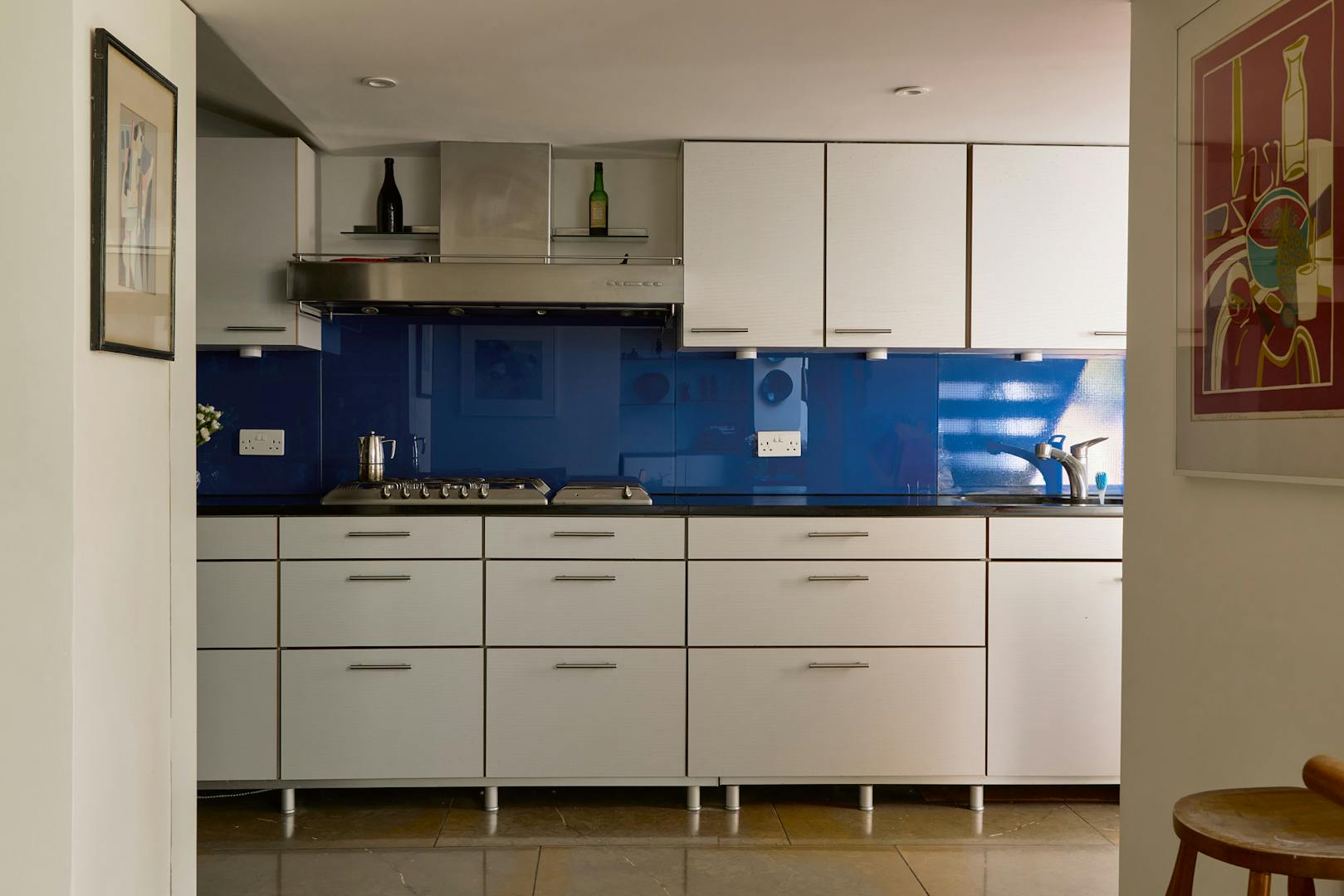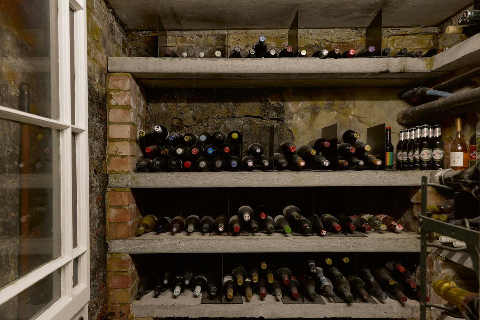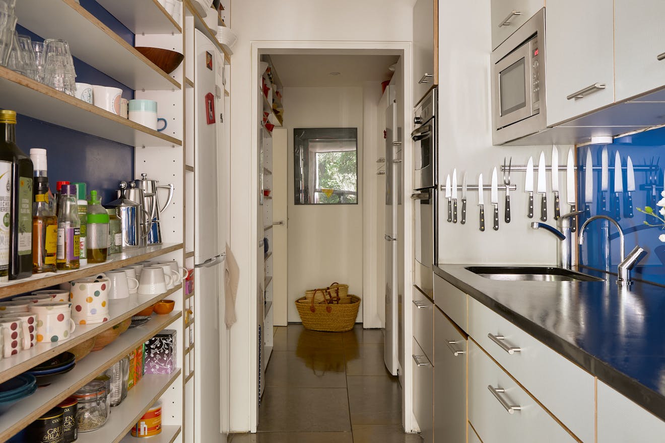 On the lower ground floor, the full scale of the extension comes into view. A study nook sits next to the steps, with storage tucked beneath. They descend to the kitchen and large dining, sitting area. Purbeck marble slabs, sourced directly by the owners from the Isle of Purbeck quarry, extend throughout the space, with clever storage and accessed via a ship-style doors. A standing large safe is built in and hidden. At the front of the plan, original porthole windows bring light into a utility area and the entrance to a wine cellar, fronted by a reclaimed stained-glass door.