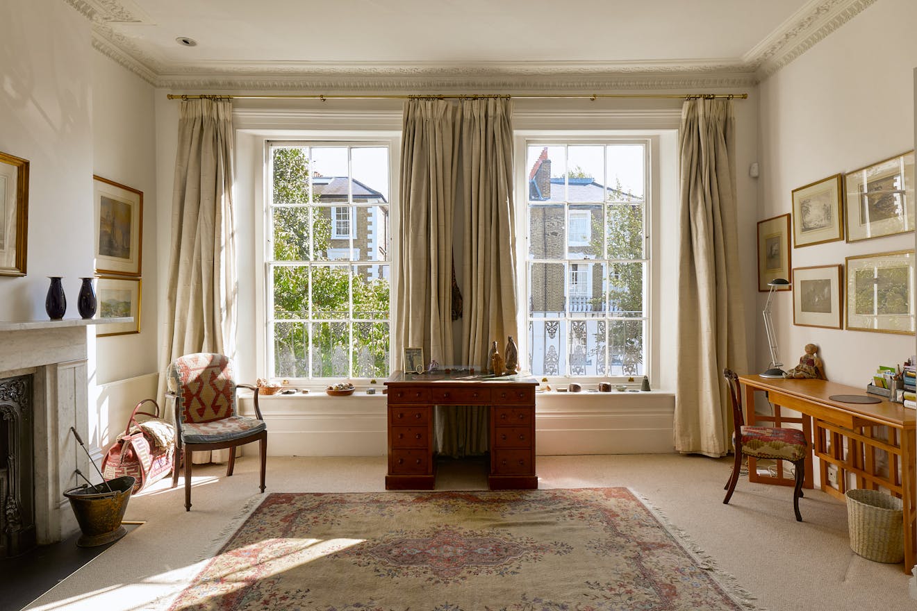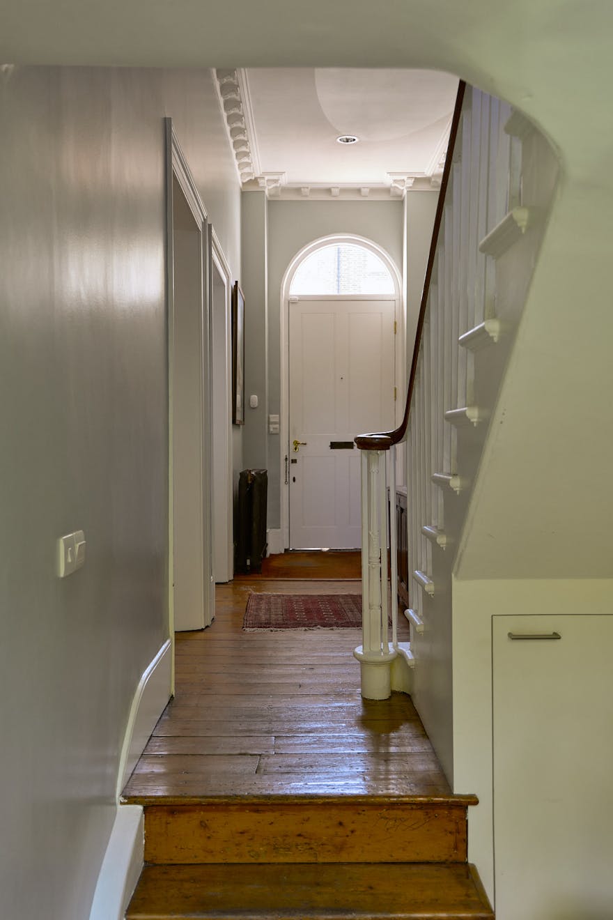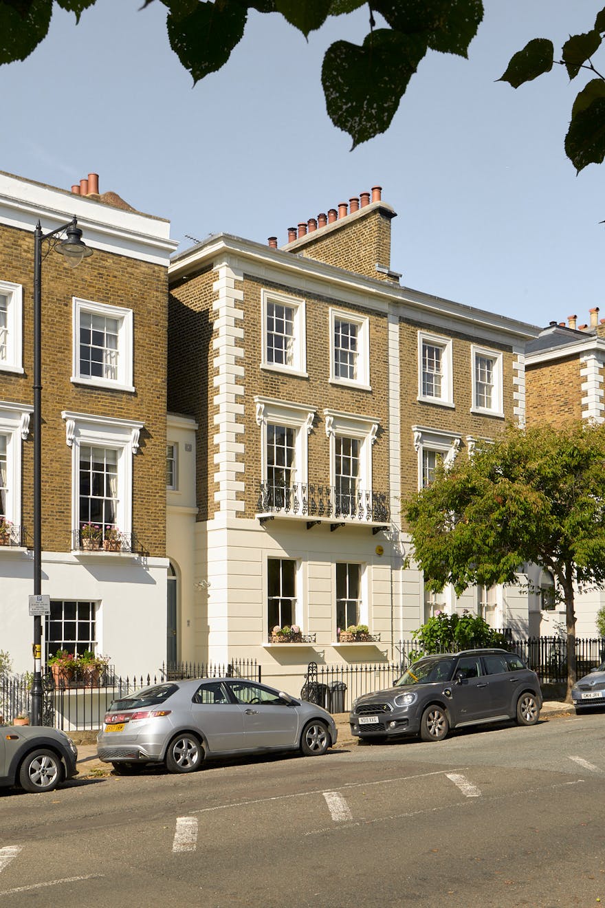 Set within the Barnsbury Conservation Area, the house presents a handsome stucco quoin façade. Built around 1840, its generous footprint unfolds across five floors, with further accommodation created in the infill above the entrance. Characteristic cast-iron balustrades frame the original sash windows, a defining feature of the Georgian period.