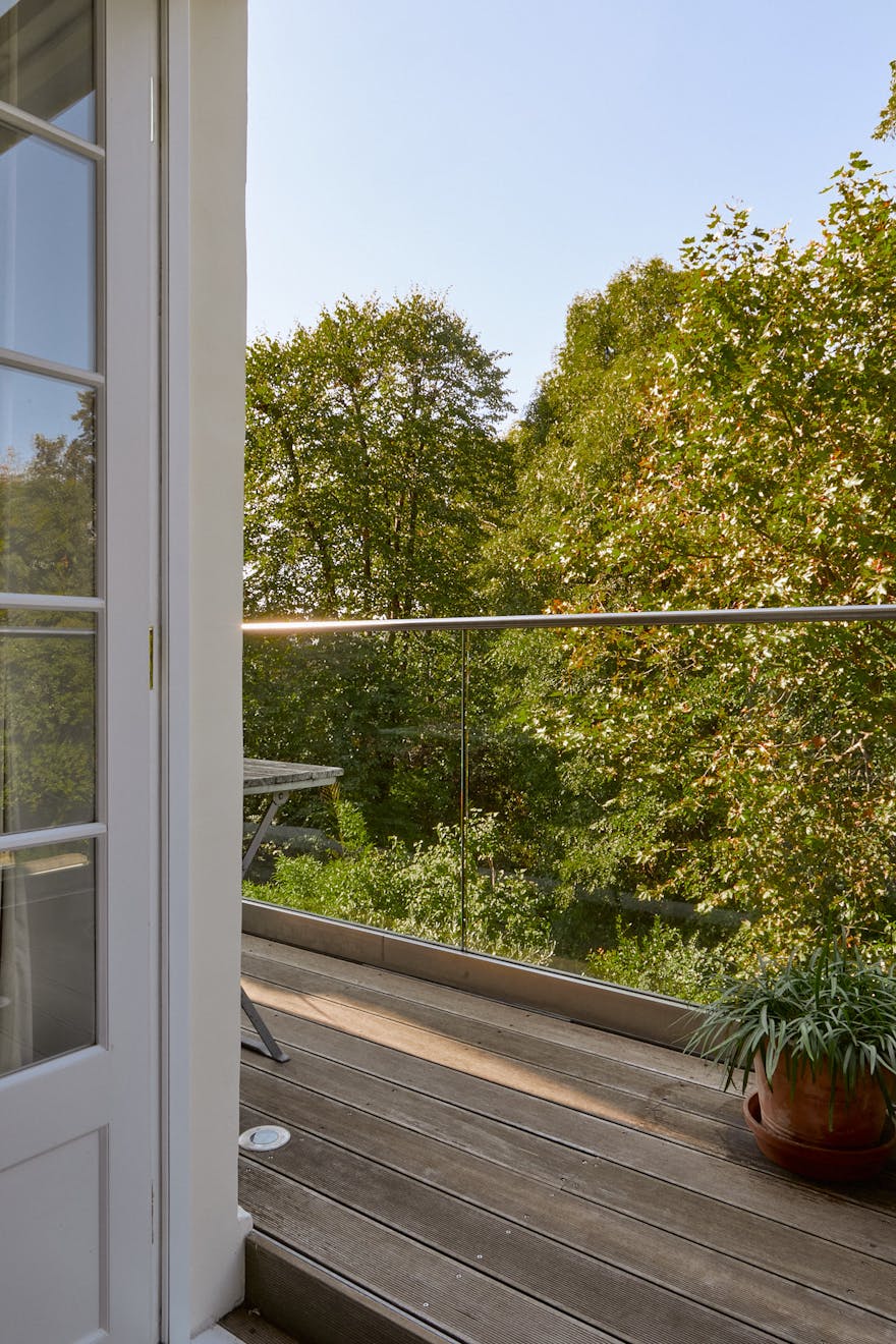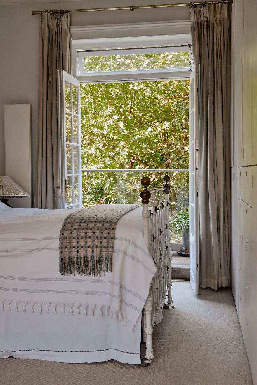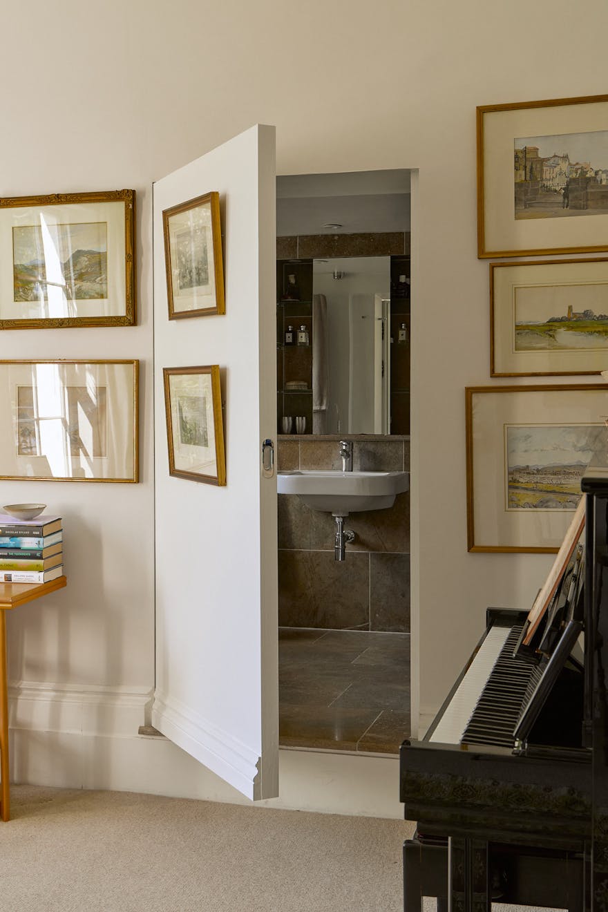 The first floor is dedicated to the principal suite, arranged as a sequence of elegant spaces: a drawing room with study, a bedroom with French doors opening onto a private terrace, and an en suite discreetly concealed behind a seamlessly integrated door. The terrace overlooks the verdant garden, established trees facing west into Barnsbury Woods. Dual-aspect sash windows flood the rooms with natural light, while the original bullnose marble fireplace and fine cornicing preserve the home’s period character.