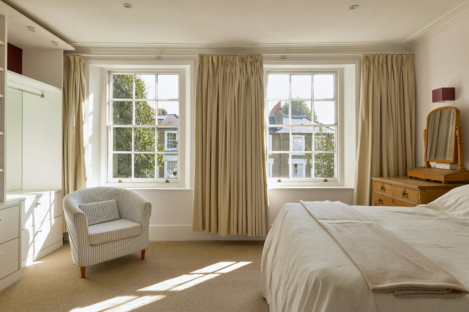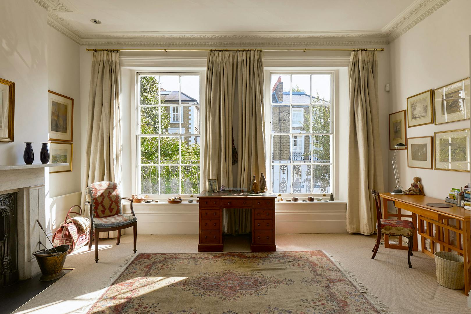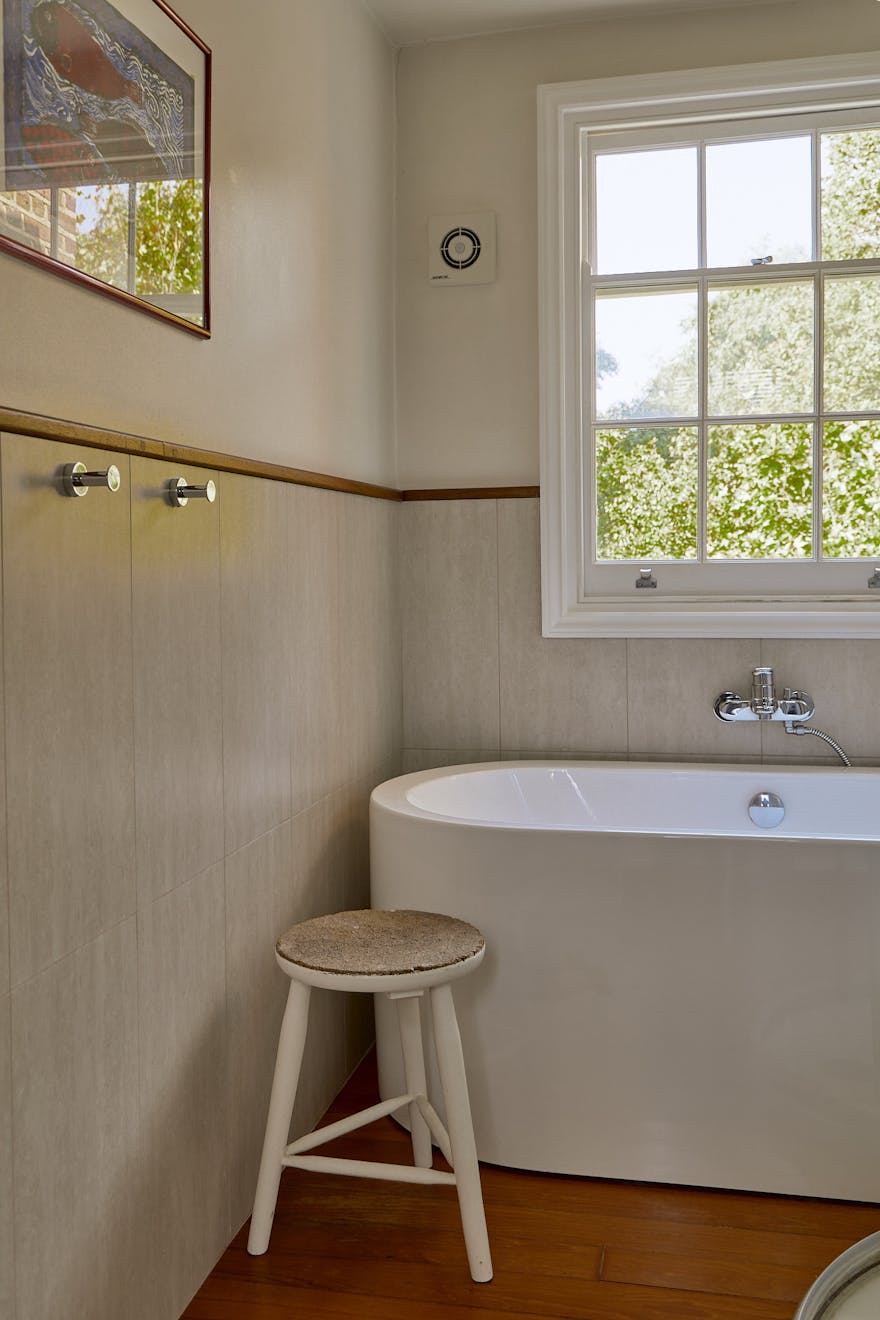 The first floor is dedicated to the principal suite, arranged as a sequence of elegant spaces: a drawing room with study, a bedroom with French doors opening onto a private terrace, and an en suite discreetly concealed behind a seamlessly integrated door. The terrace overlooks the verdant garden, established trees facing west into Barnsbury Woods. Dual-aspect sash windows flood the rooms with natural light, while the original bullnose marble fireplace and fine cornicing preserve the home’s period character.