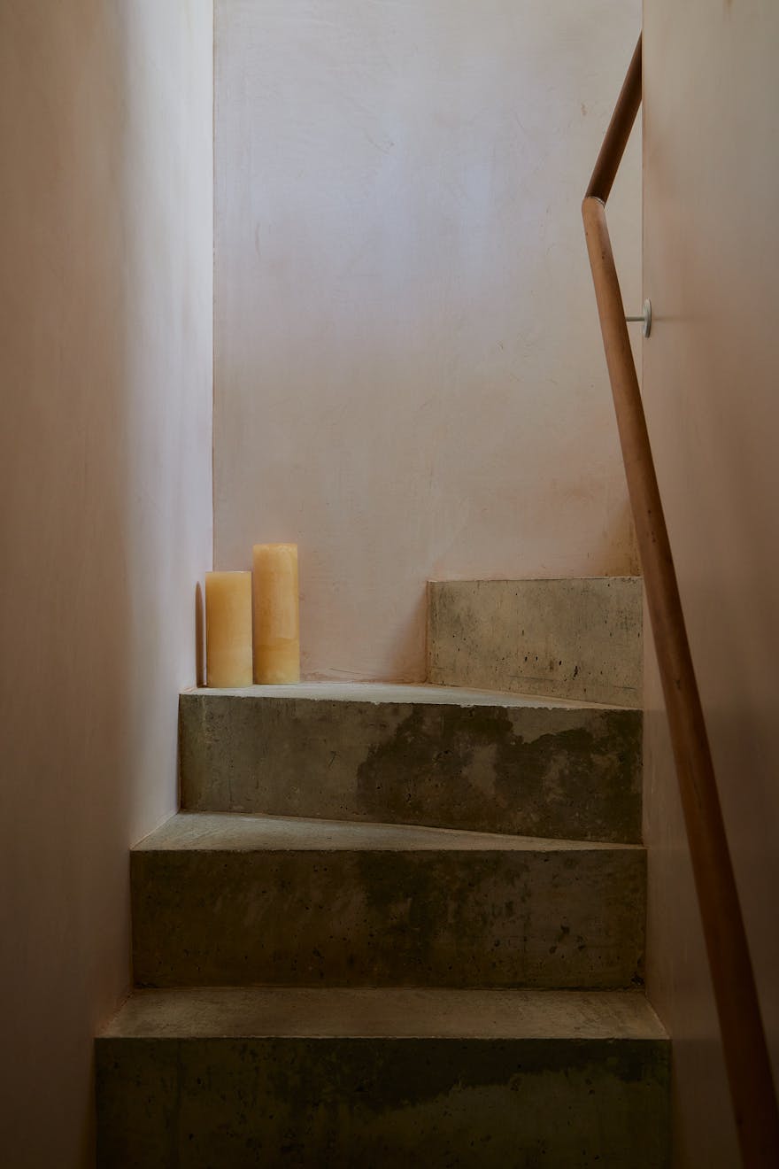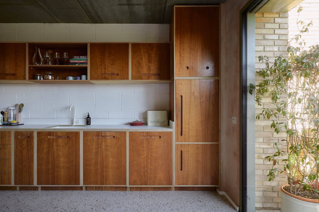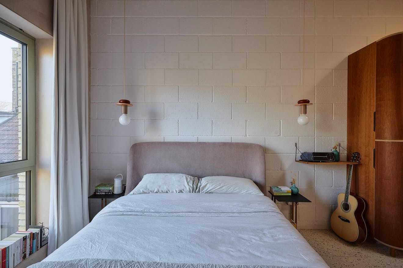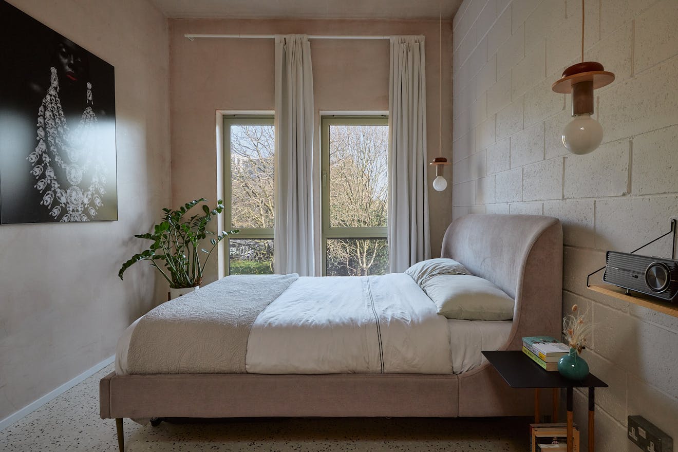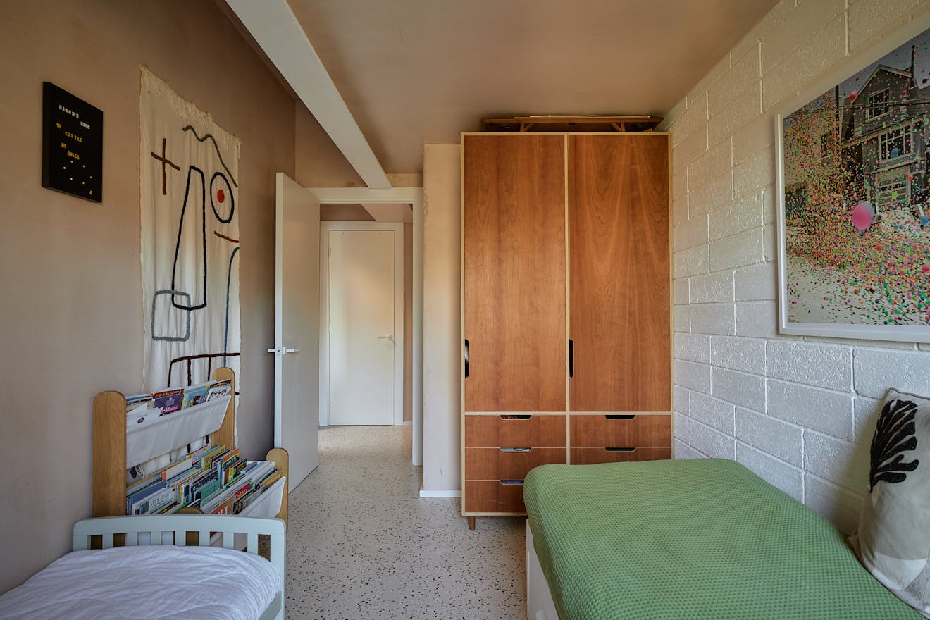 On the first floor, two double bedrooms are thoughtfully designed with a palette of soft, natural tones and refined details. The principal bedroom, spacious enough for a king-size bed, is framed by a floor-to-ceiling window that offers a glimpse of the park beyond. Bespoke cherry veneer plywood wardrobes, meticulously crafted by Lozi, add warmth, while the en suite bathroom enhances the sense of elegance with a terrazzo backsplash, dual sink, and a walk-in shower. The family bathroom is equally striking, featuring a bathtub and exposed concrete steps that elevate the space with a refined, sculptural quality. Additionally, thoughtfully integrated storage is seamlessly incorporated throughout both floors.