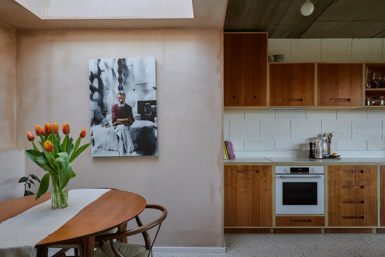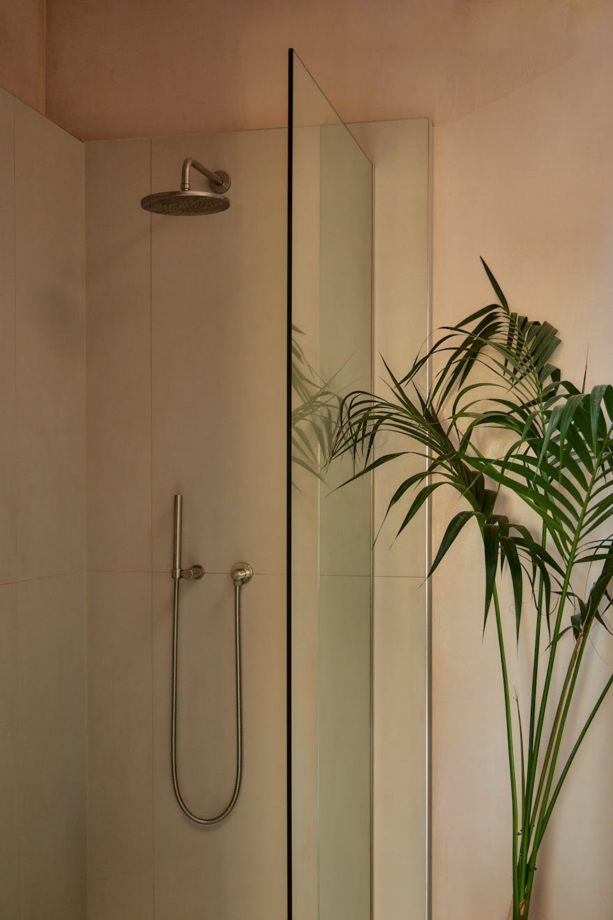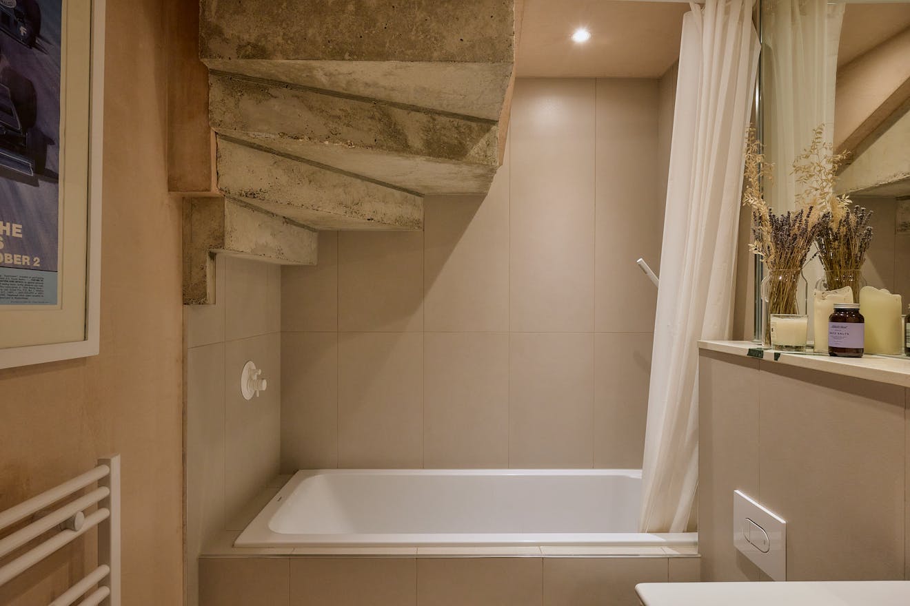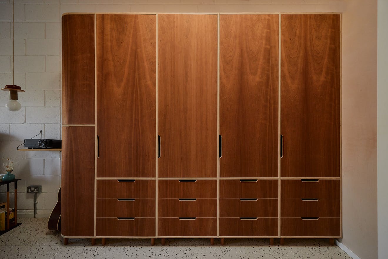 On the first floor, two double bedrooms are thoughtfully designed with a palette of soft, natural tones and refined details. The principal bedroom, spacious enough for a king-size bed, is framed by a floor-to-ceiling window that offers a glimpse of the park beyond. Bespoke cherry veneer plywood wardrobes, meticulously crafted by Lozi, add warmth, while the en suite bathroom enhances the sense of elegance with a terrazzo backsplash, dual sink, and a walk-in shower. The family bathroom is equally striking, featuring a bathtub and exposed concrete steps that elevate the space with a refined, sculptural quality. Additionally, thoughtfully integrated storage is seamlessly incorporated throughout both floors.