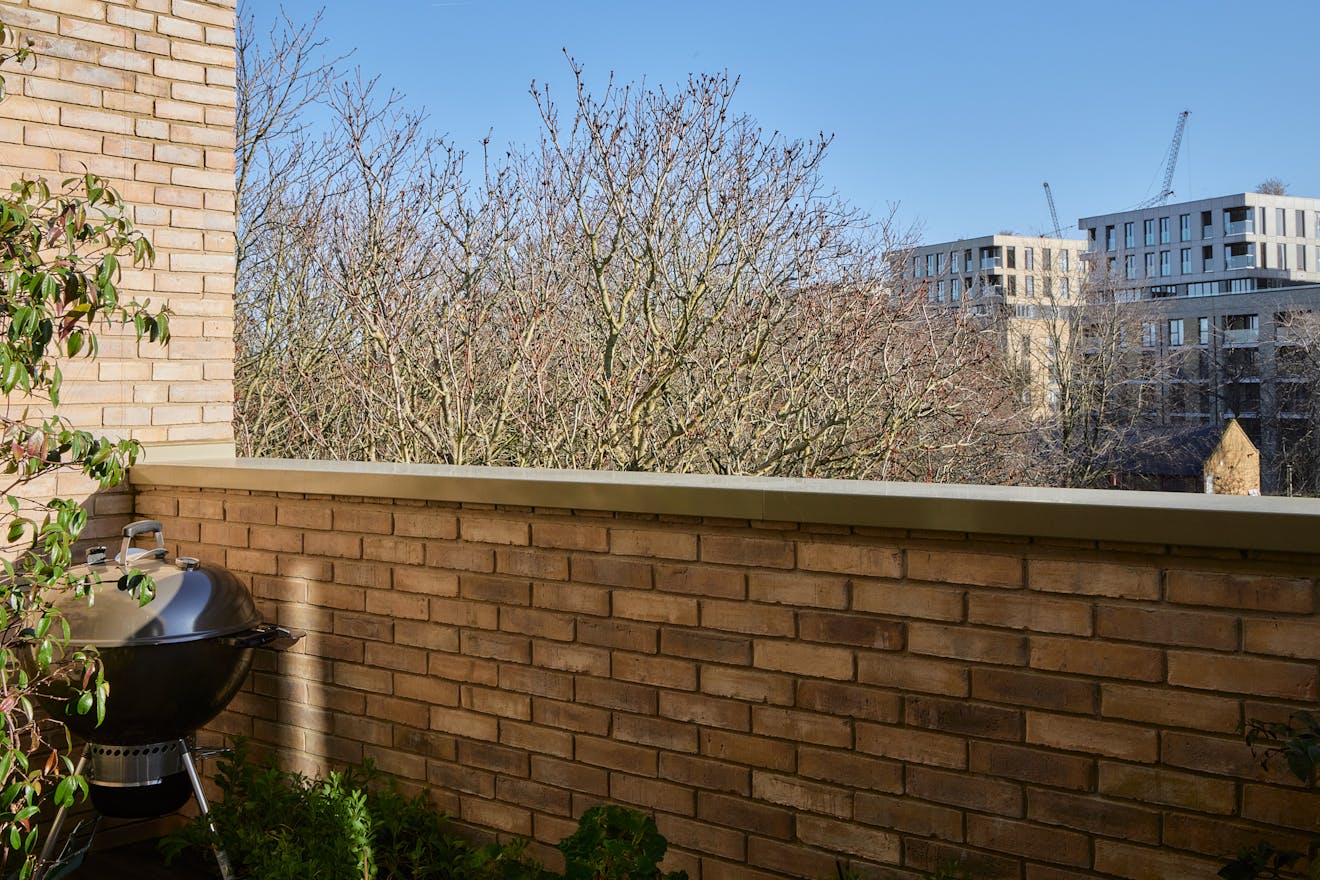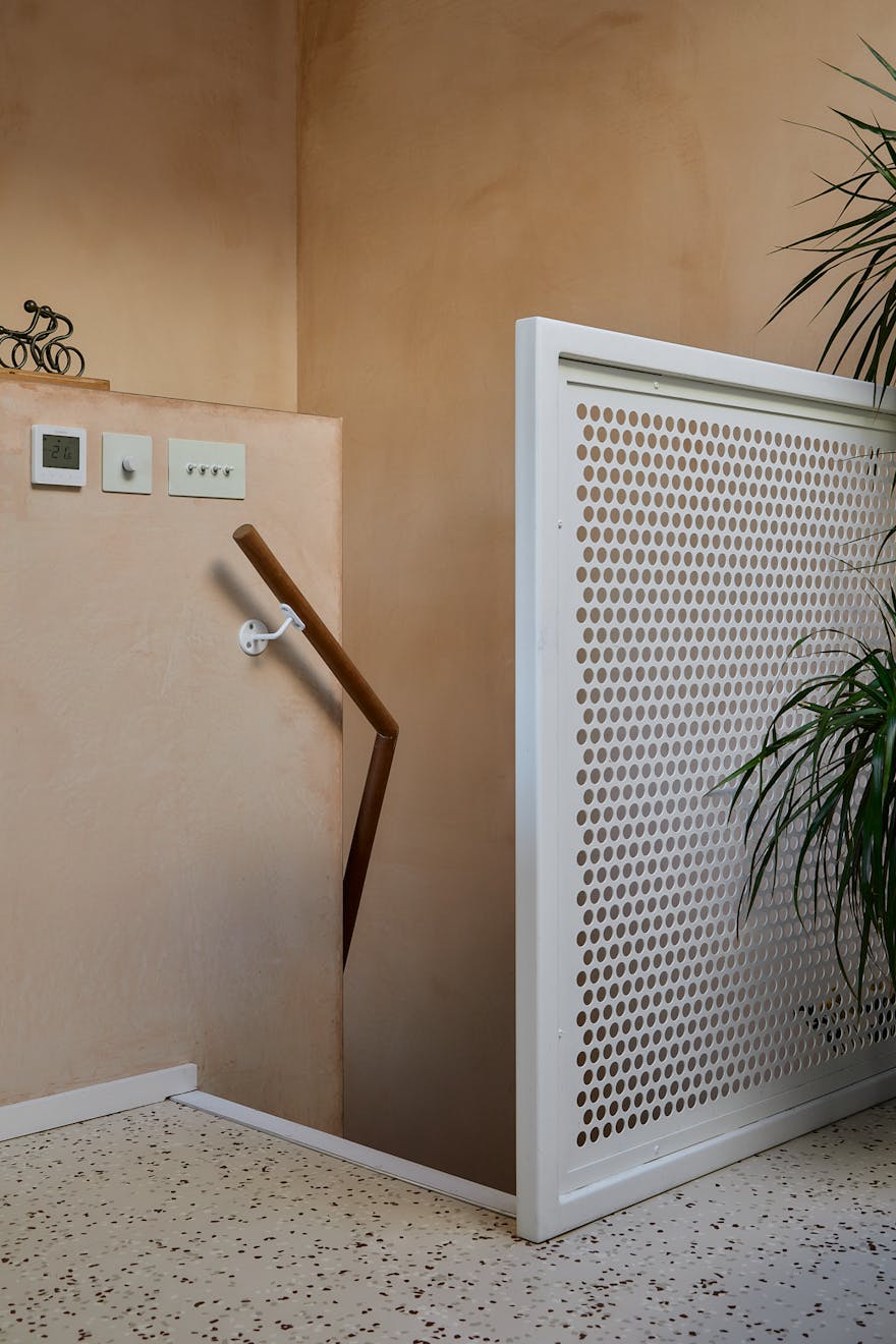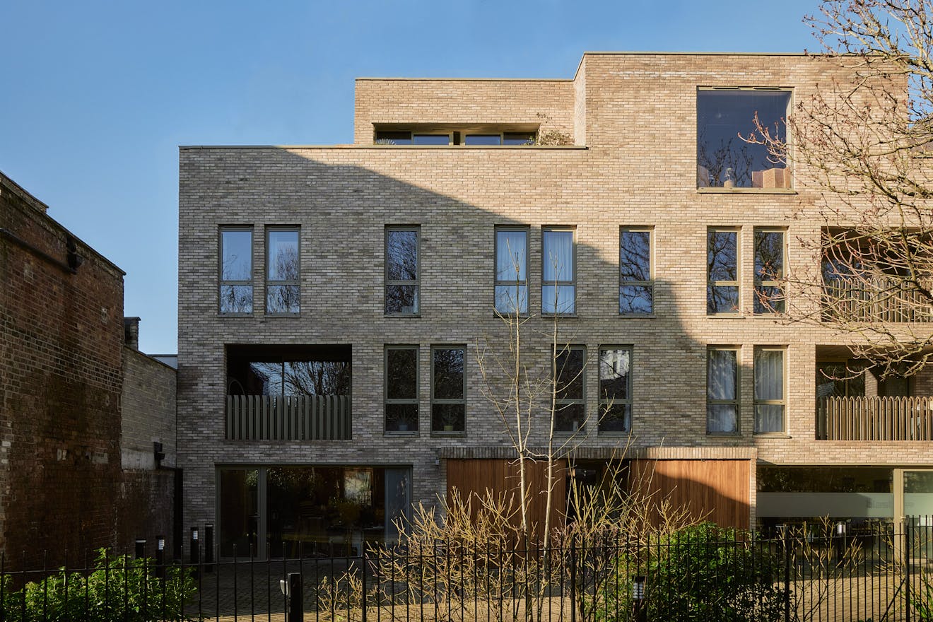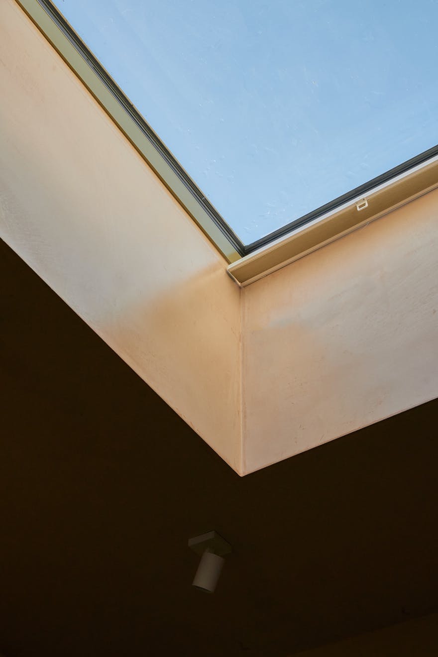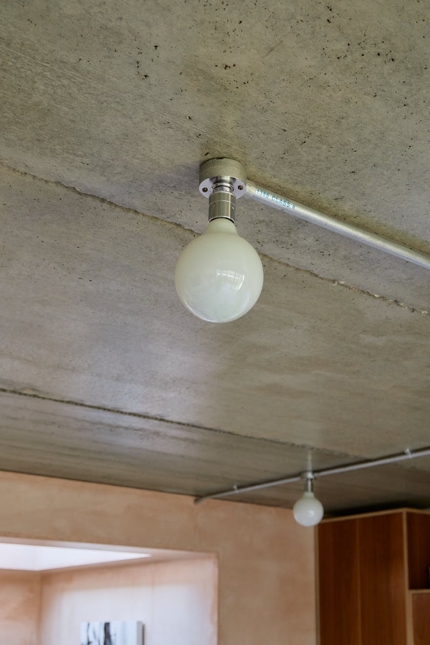 On the first floor, two double bedrooms are thoughtfully designed with a palette of soft, natural tones and refined details. The principal bedroom, spacious enough for a king-size bed, is framed by a floor-to-ceiling window that offers a glimpse of the park beyond. Bespoke cherry veneer plywood wardrobes, meticulously crafted by Lozi, add warmth, while the en suite bathroom enhances the sense of elegance with a terrazzo backsplash, dual sink, and a walk-in shower. The family bathroom is equally striking, featuring a bathtub and exposed concrete steps that elevate the space with a refined, sculptural quality. Additionally, thoughtfully integrated storage is seamlessly incorporated throughout both floors.