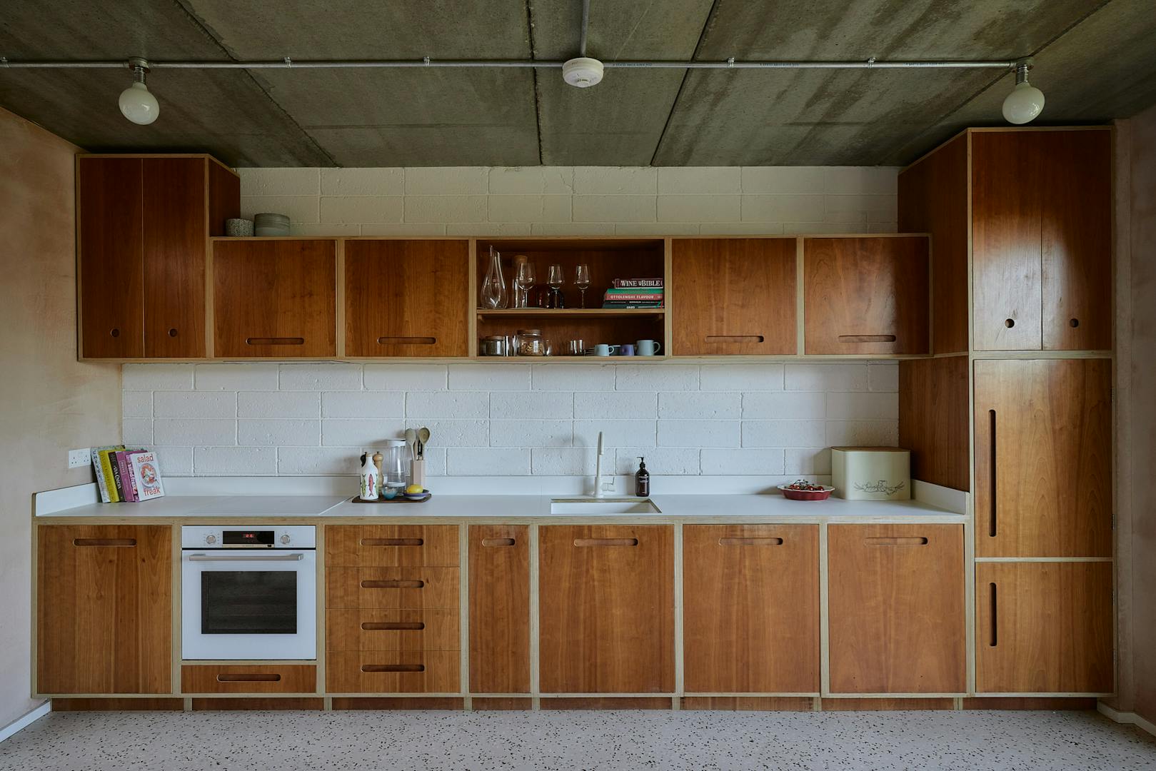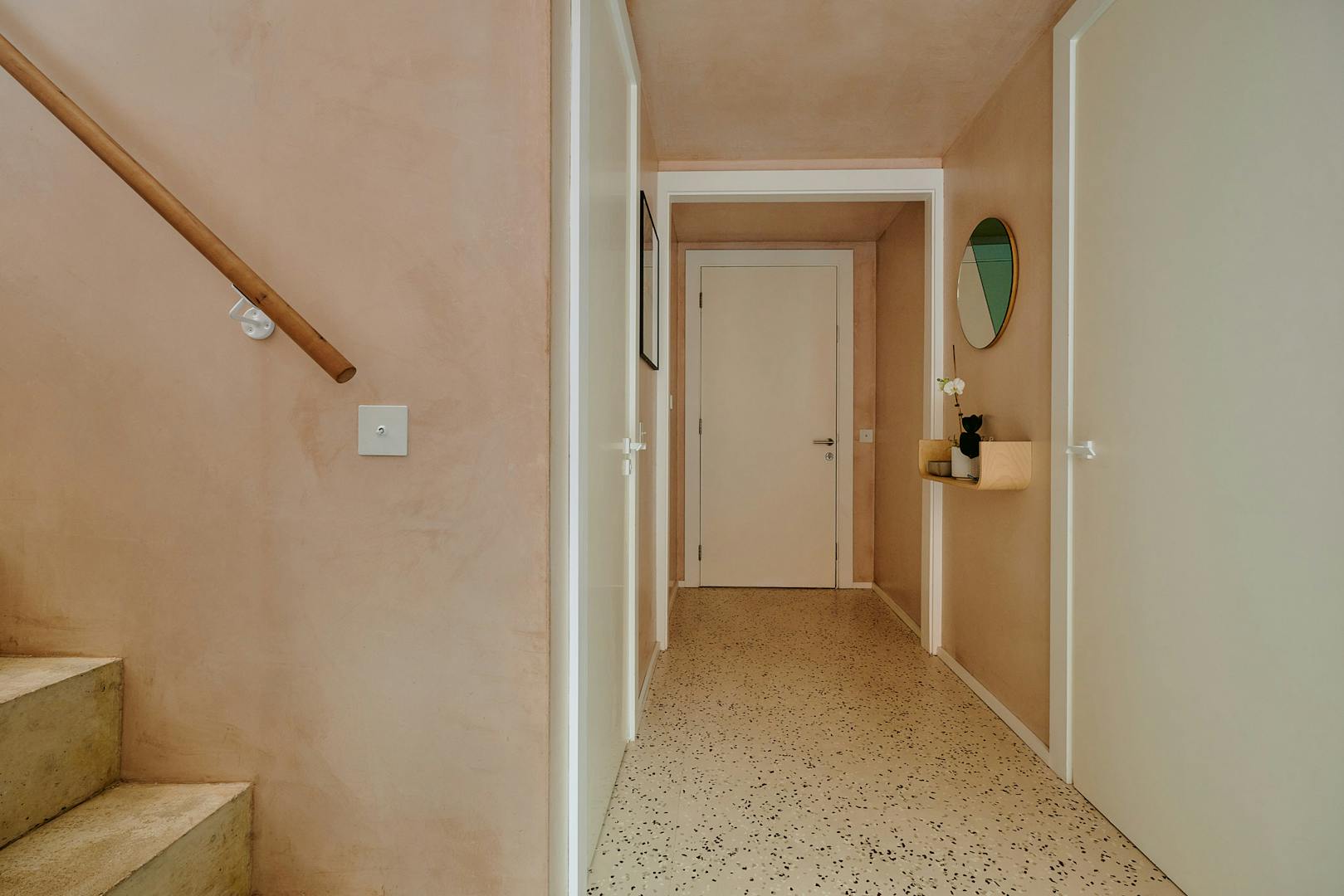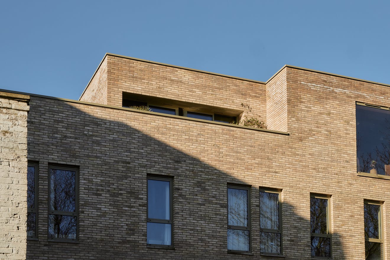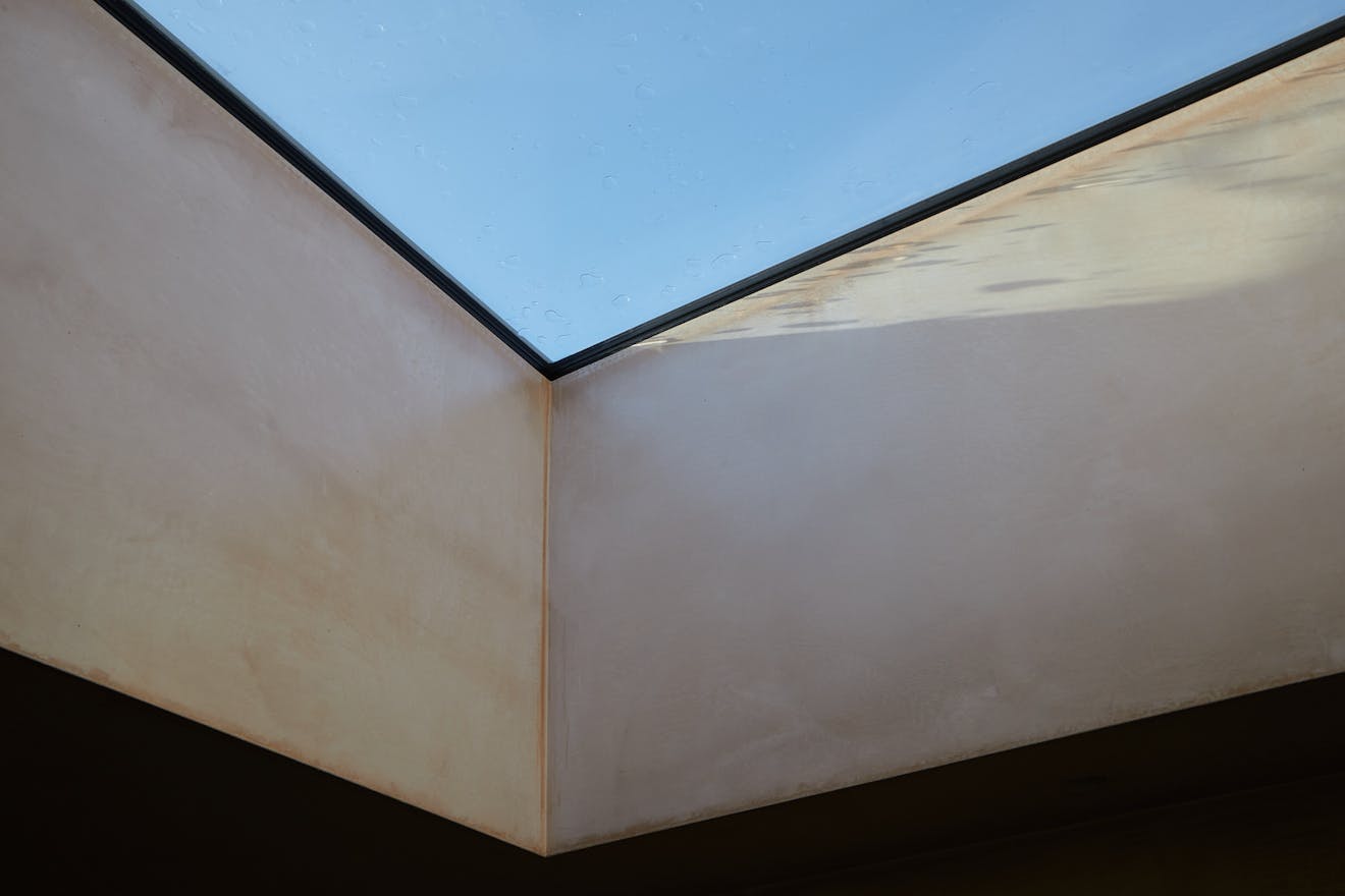 On the first floor, two double bedrooms are thoughtfully designed with a palette of soft, natural tones and refined details. The principal bedroom, spacious enough for a king-size bed, is framed by a floor-to-ceiling window that offers a glimpse of the park beyond. Bespoke cherry veneer plywood wardrobes, meticulously crafted by Lozi, add warmth, while the en suite bathroom enhances the sense of elegance with a terrazzo backsplash, dual sink, and a walk-in shower. The family bathroom is equally striking, featuring a bathtub and exposed concrete steps that elevate the space with a refined, sculptural quality. Additionally, thoughtfully integrated storage is seamlessly incorporated throughout both floors.