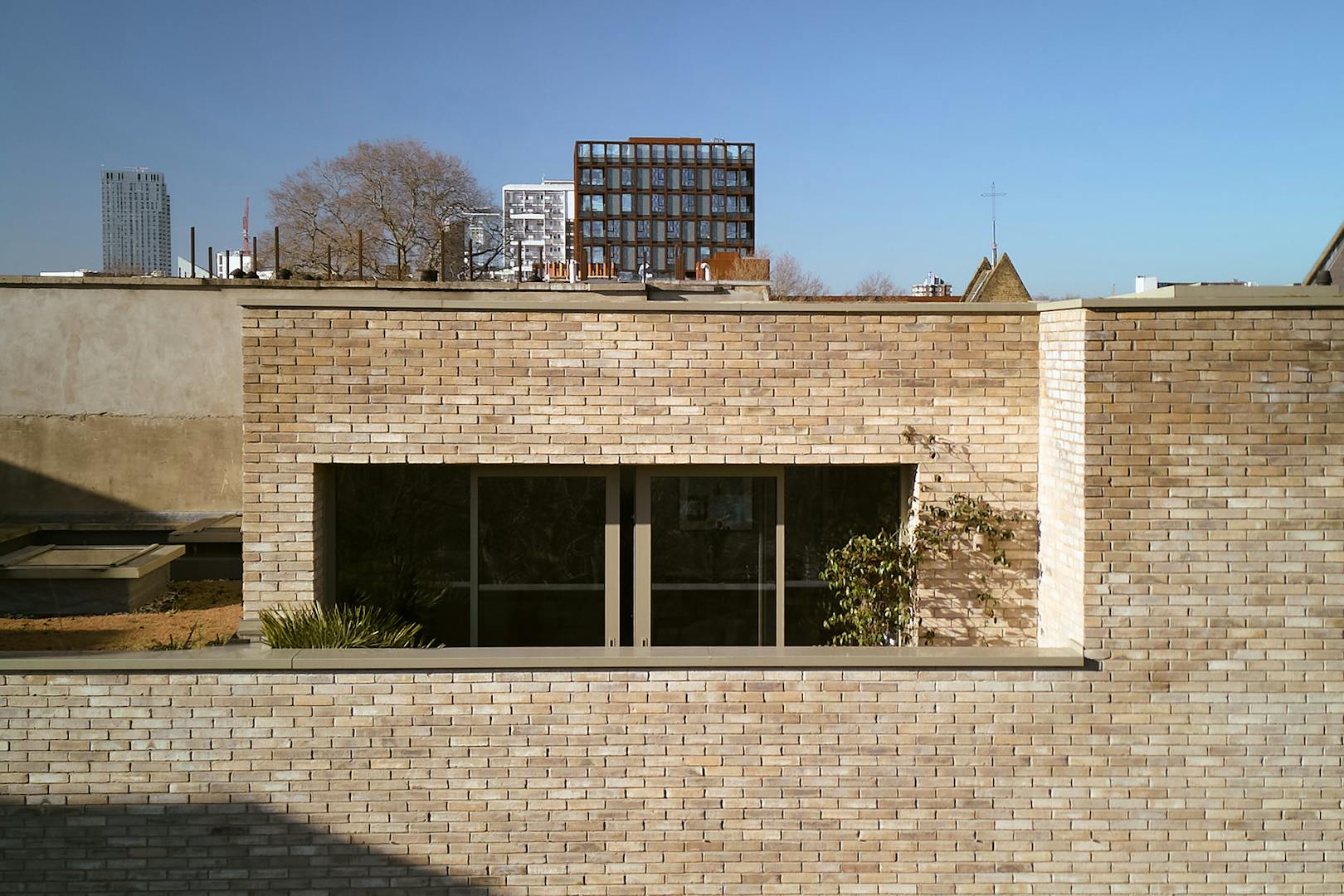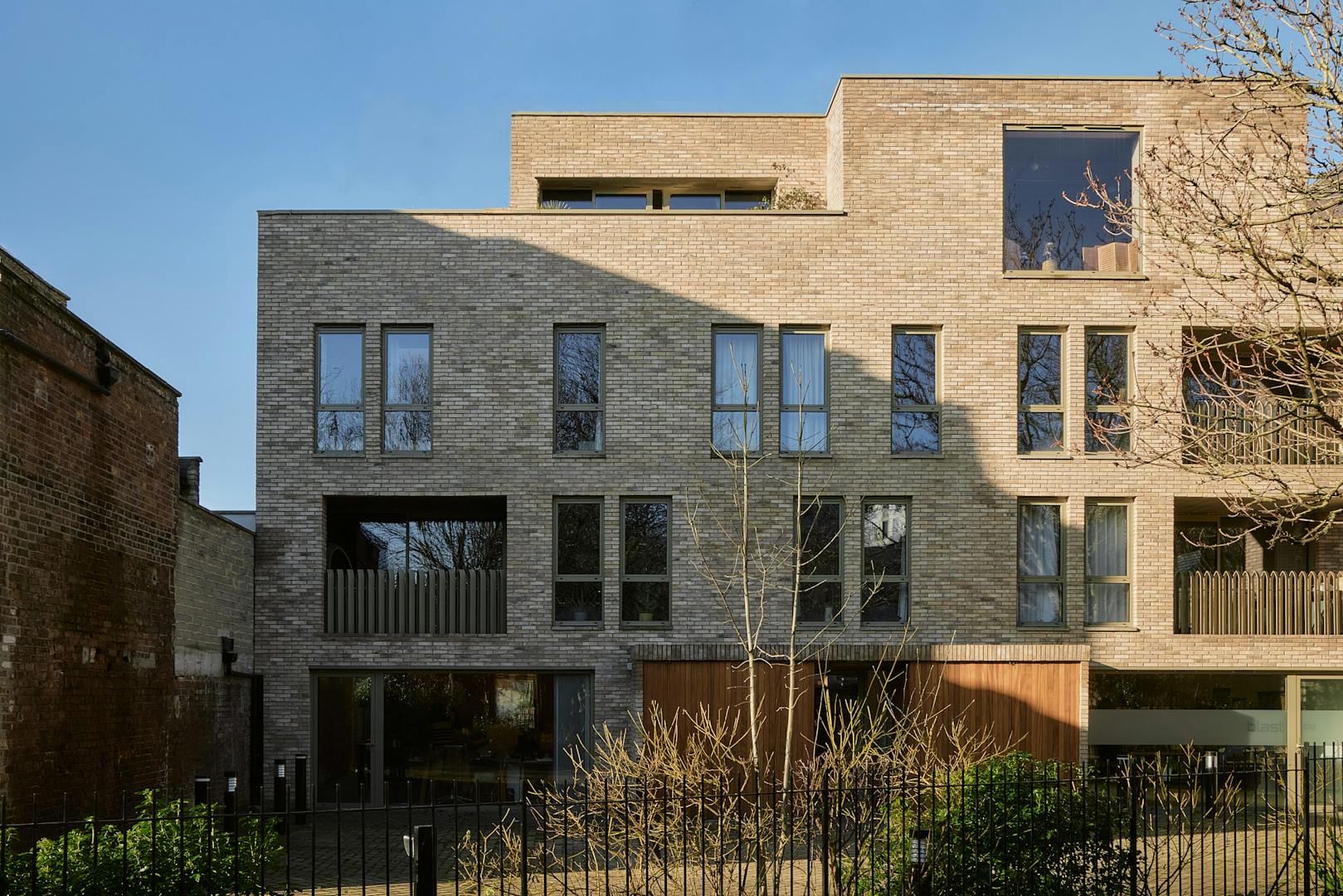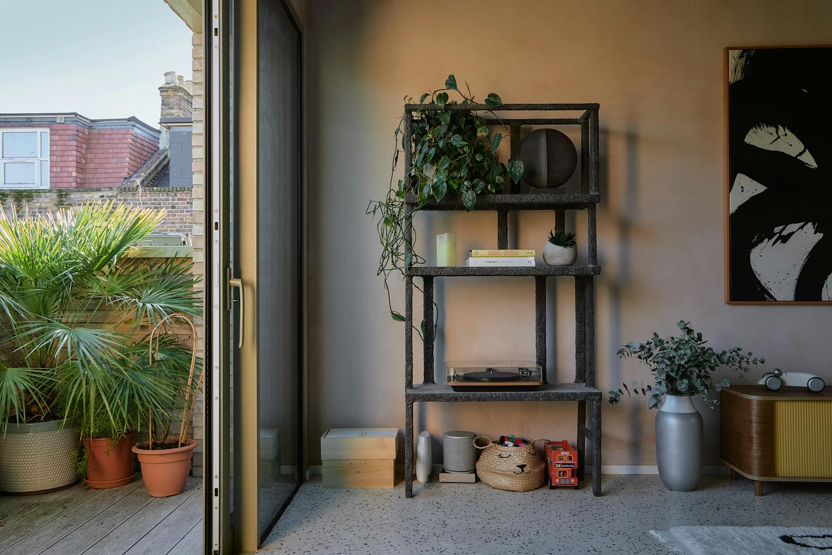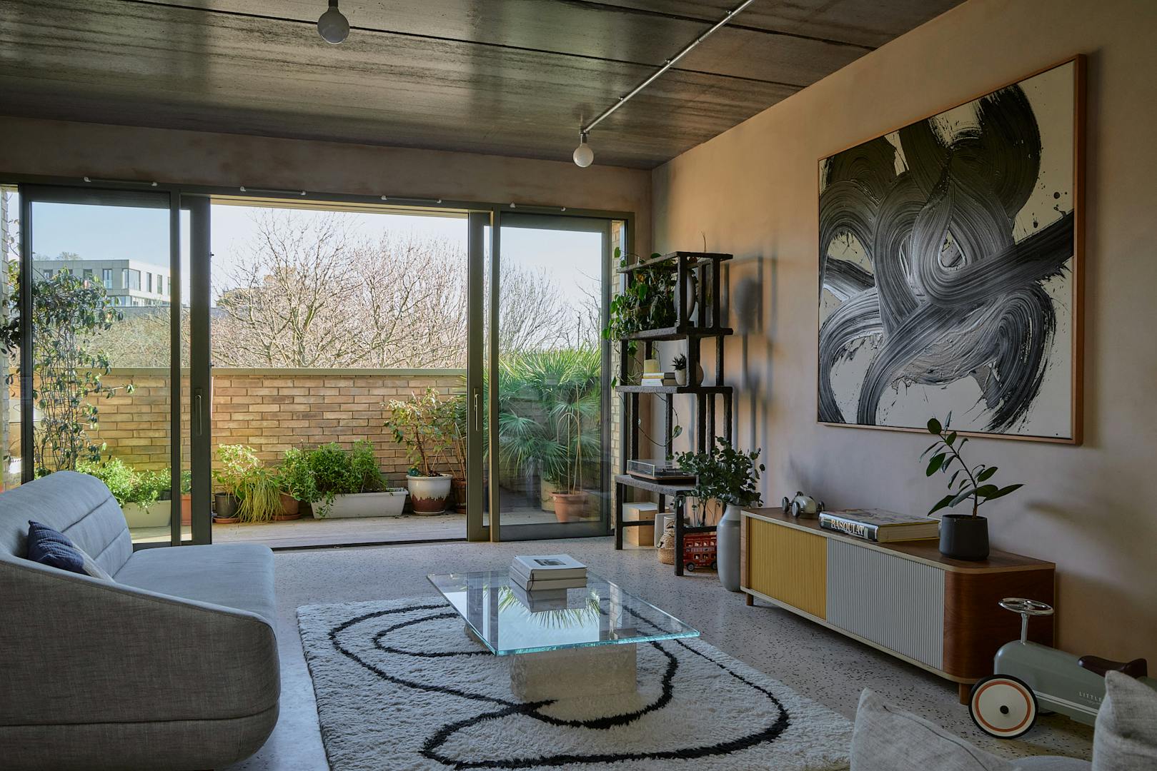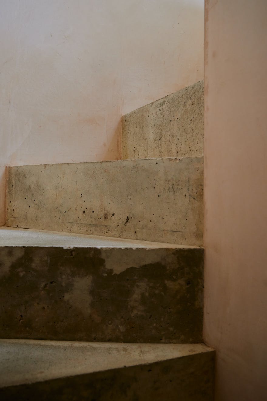 On the first floor, two double bedrooms are thoughtfully designed with a palette of soft, natural tones and refined details. The principal bedroom, spacious enough for a king-size bed, is framed by a floor-to-ceiling window that offers a glimpse of the park beyond. Bespoke cherry veneer plywood wardrobes, meticulously crafted by Lozi, add warmth, while the en suite bathroom enhances the sense of elegance with a terrazzo backsplash, dual sink, and a walk-in shower. The family bathroom is equally striking, featuring a bathtub and exposed concrete steps that elevate the space with a refined, sculptural quality. Additionally, thoughtfully integrated storage is seamlessly incorporated throughout both floors.