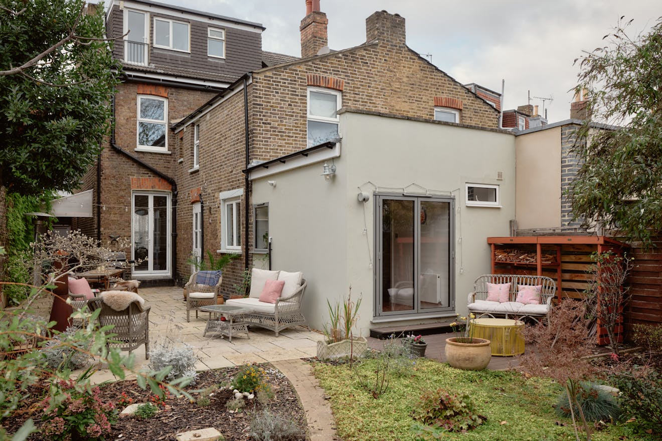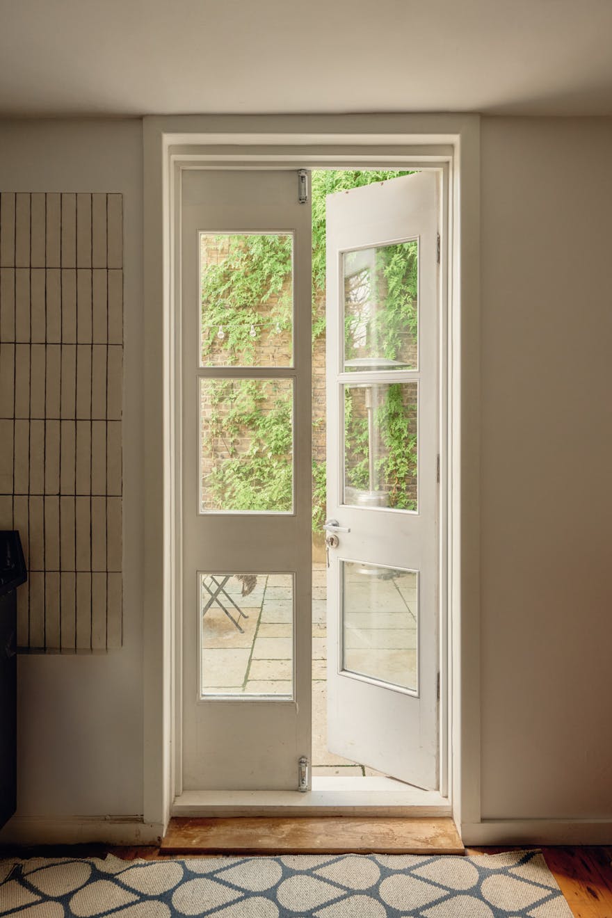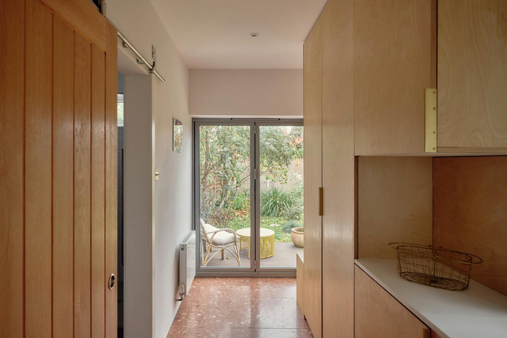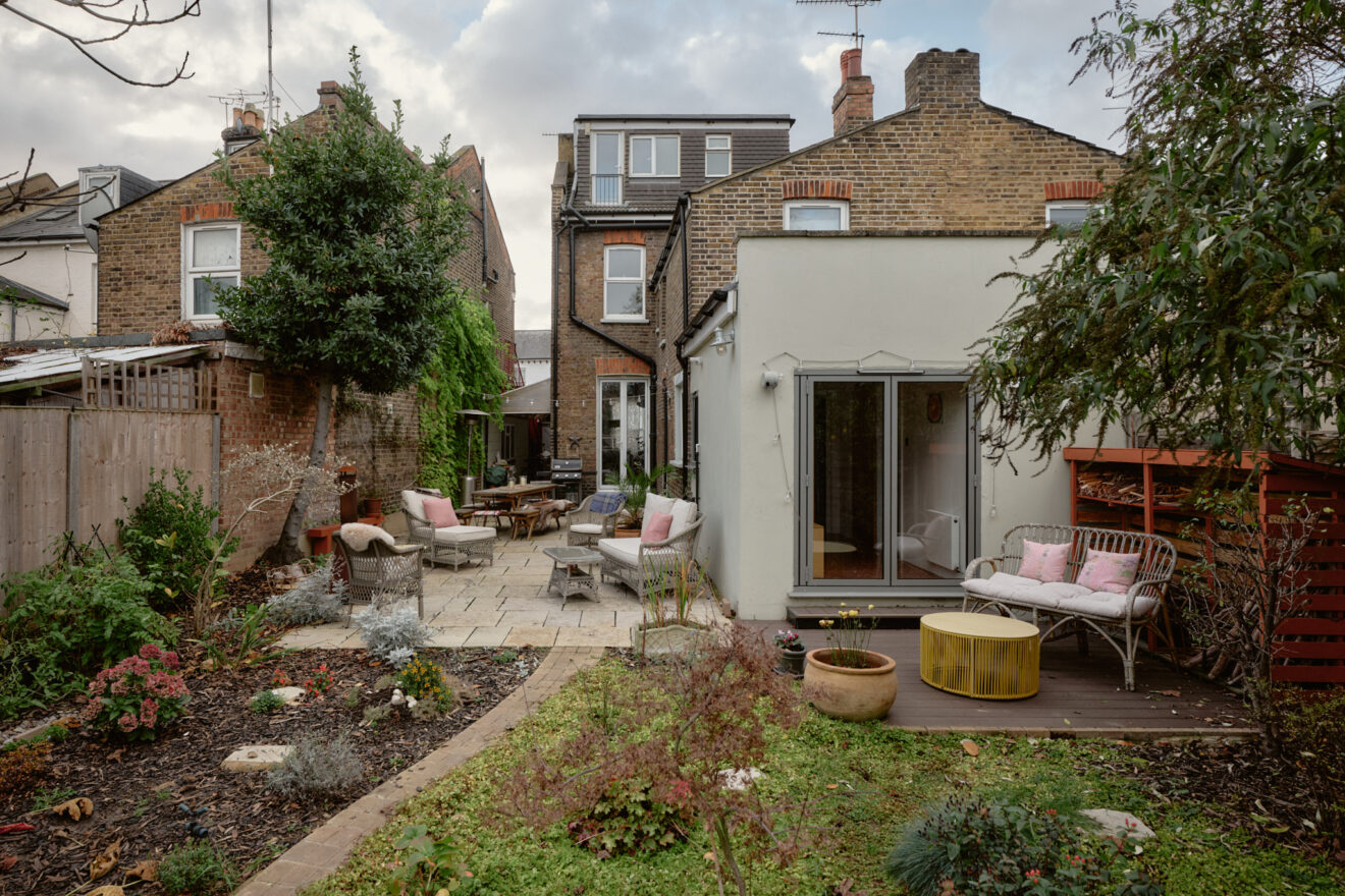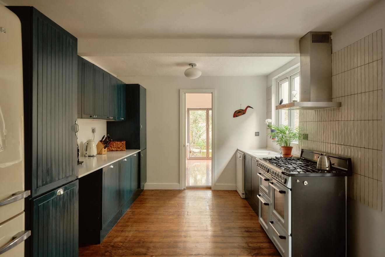 Elsewhere, original features are thoughtfully balanced with contemporary interventions. A navy Shaker-style kitchen, complete with a SMEG range cooker, leads through to a light-filled extension, where custom-made birch plywood joinery in the utility room provides generous storage alongside a butler sink and terrazzo tiling. From here, sliding doors open directly onto the garden, with an additional shower room neatly tucked to the side.